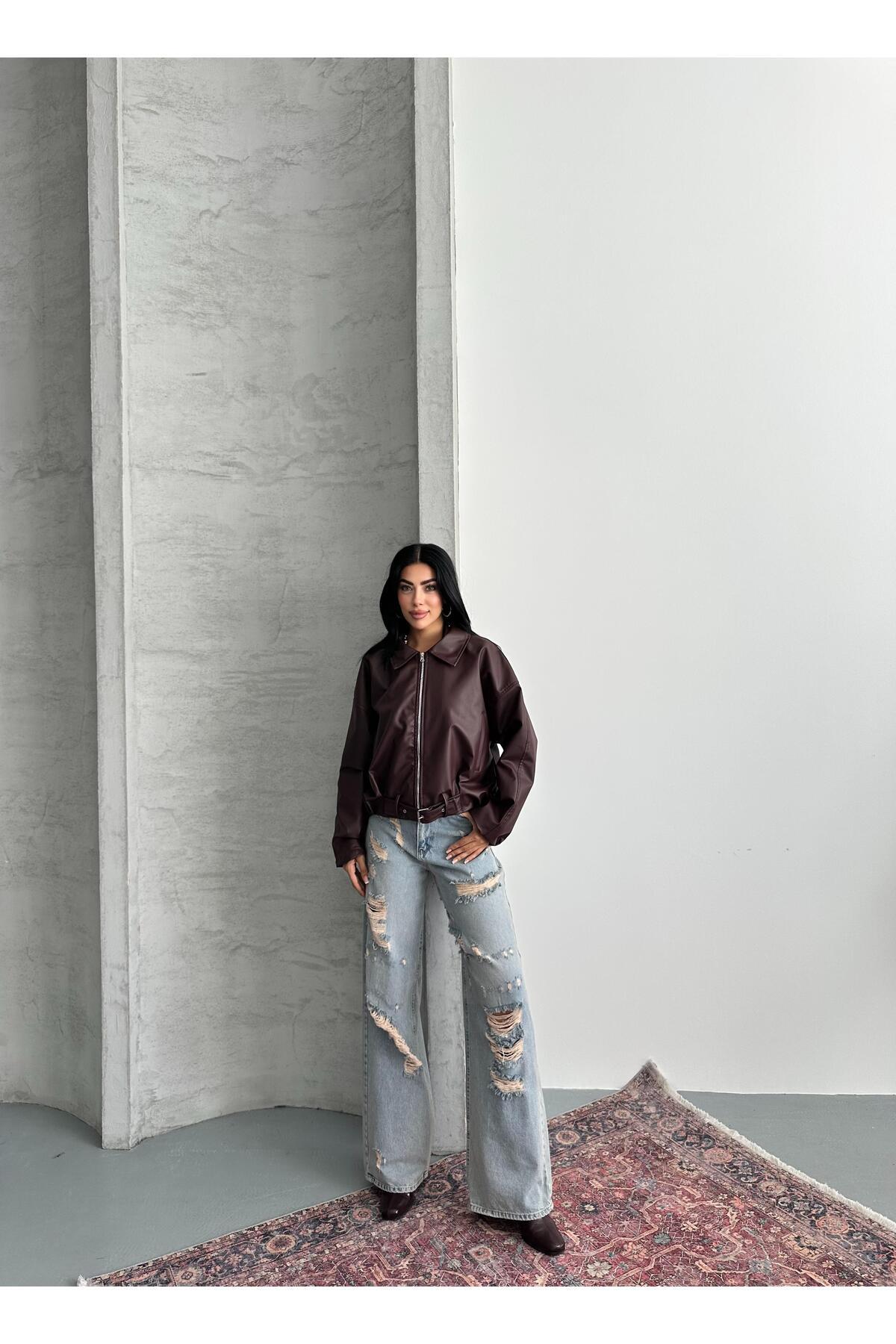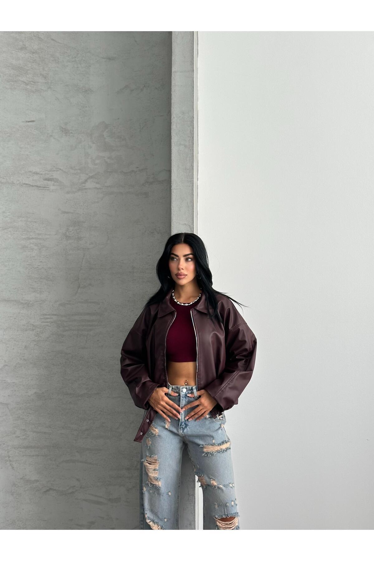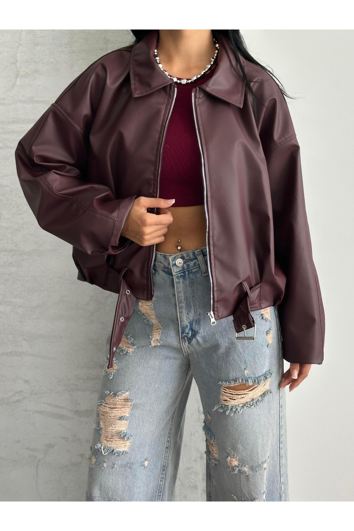 Yakalı Bordo Deri Ceket Yakalı Bordo Deri Ceket MA260063 L