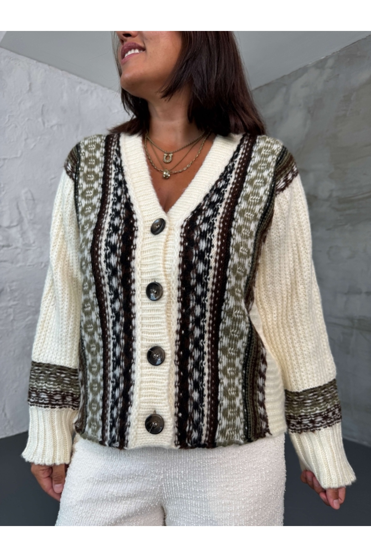 Ekru Etnik Desen Örme Hırka Ekru Etnik Desen Örme Hırka 2454 Standart