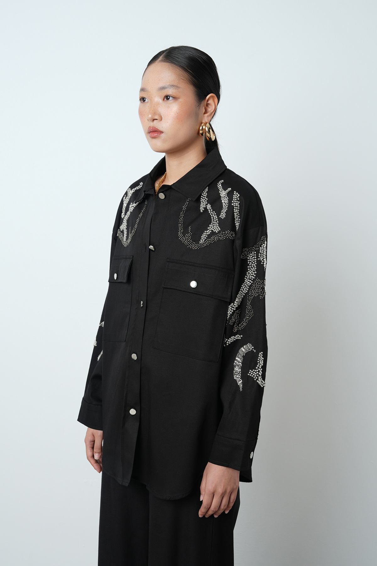 Kadın Çift Cepli Önü Boncuk İşlemeli Düz Renk Gömlek Kadın Çift Cepli Önü Boncuk İşlemeli Düz Renk Gömlek 38161 L