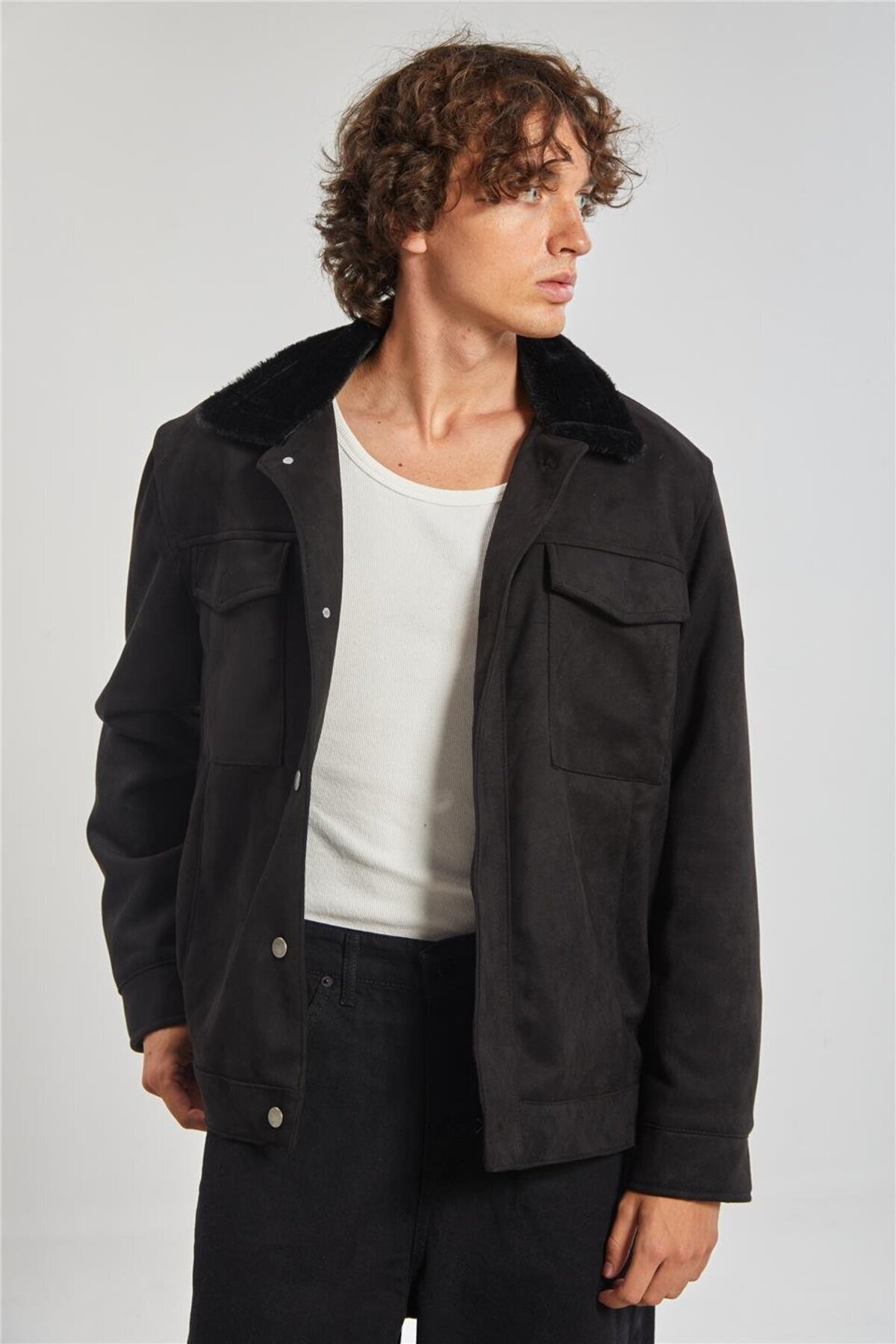 Yakası Kürklü Çift Cep Süet Erkek Ceket - Siyah Yakası Kürklü Çift Cep Süet Erkek Ceket - Siyah 1054-25K50001 2XL