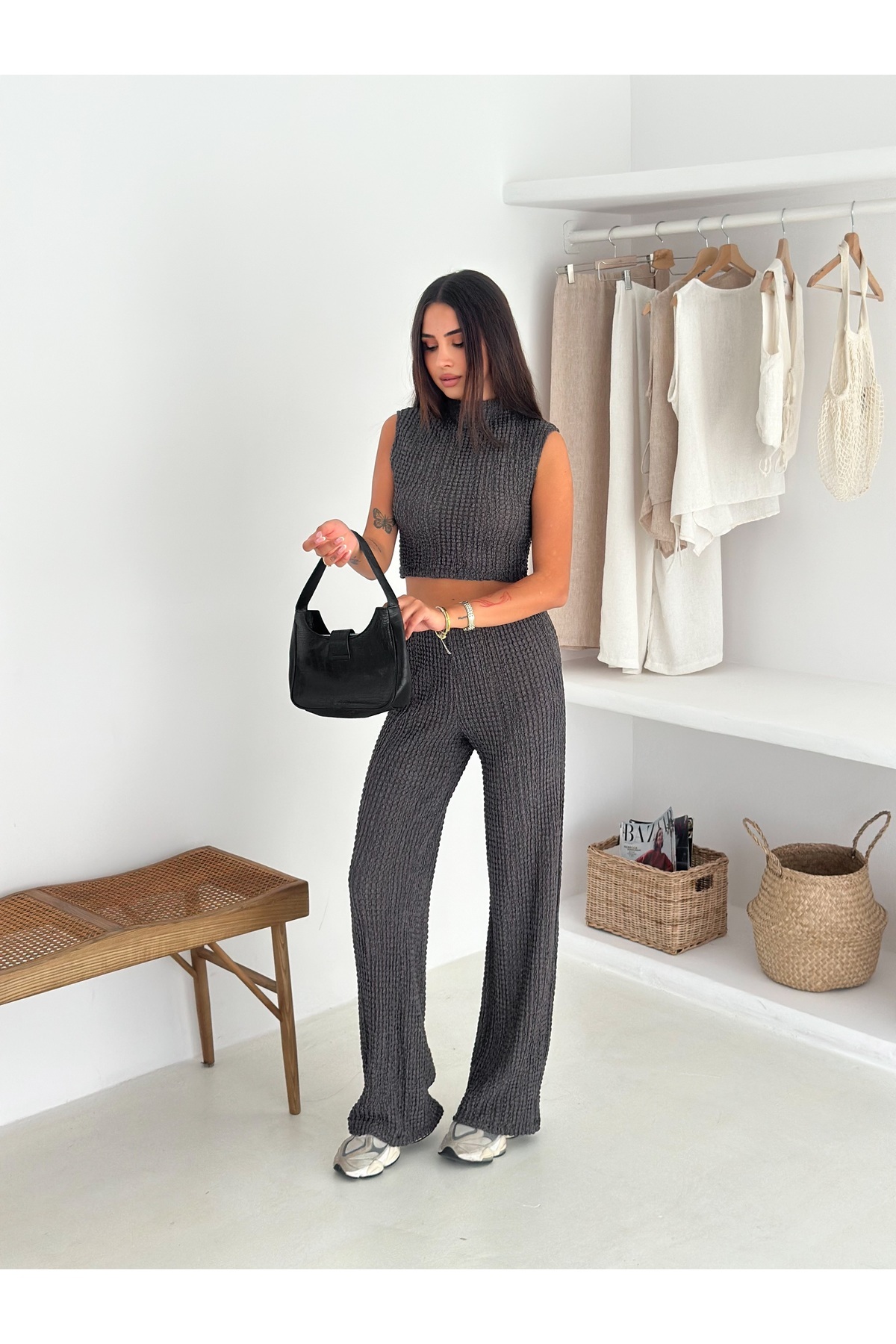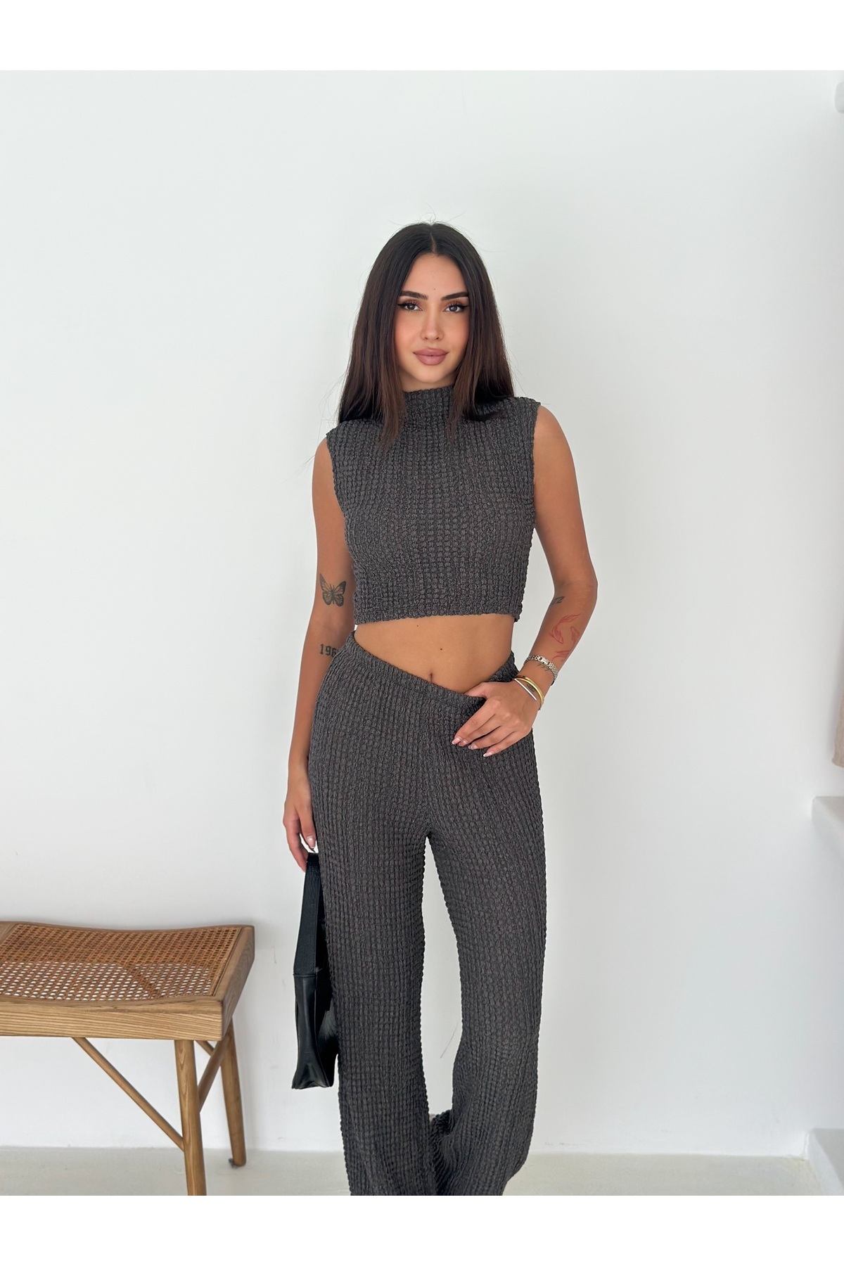 Yüksek Yaka ve Kolsuz Crop Bluz . Bel Elastik Bel.Rahat Kesim Pantolon. Yüksek Yaka ve Kolsuz Crop Bluz . Bel Elastik Bel.Rahat Kesim Pantolon. tint682 XL