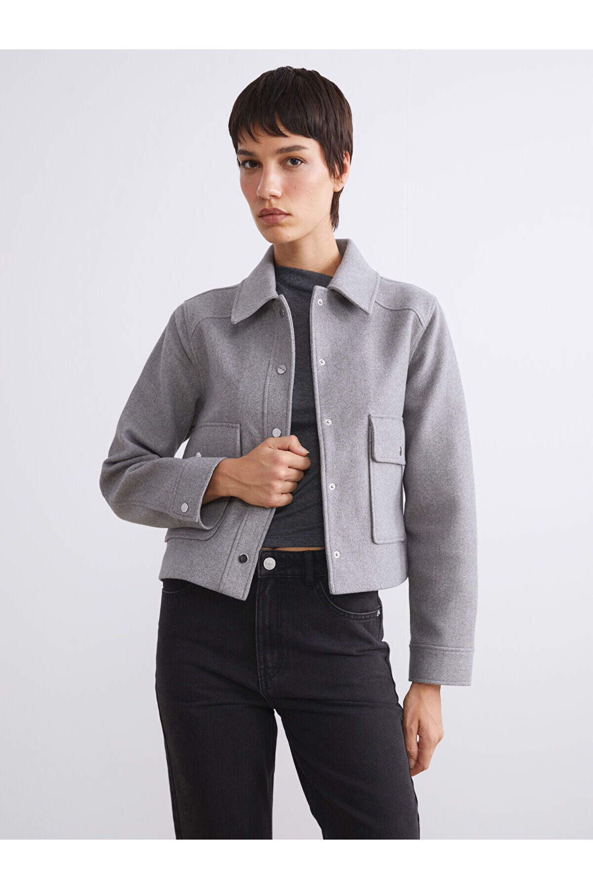 Gri Gömlek Yaka Kadın Kaşe Ceket Gri Gömlek Yaka Kadın Kaşe Ceket W53519Z8-LAL 46