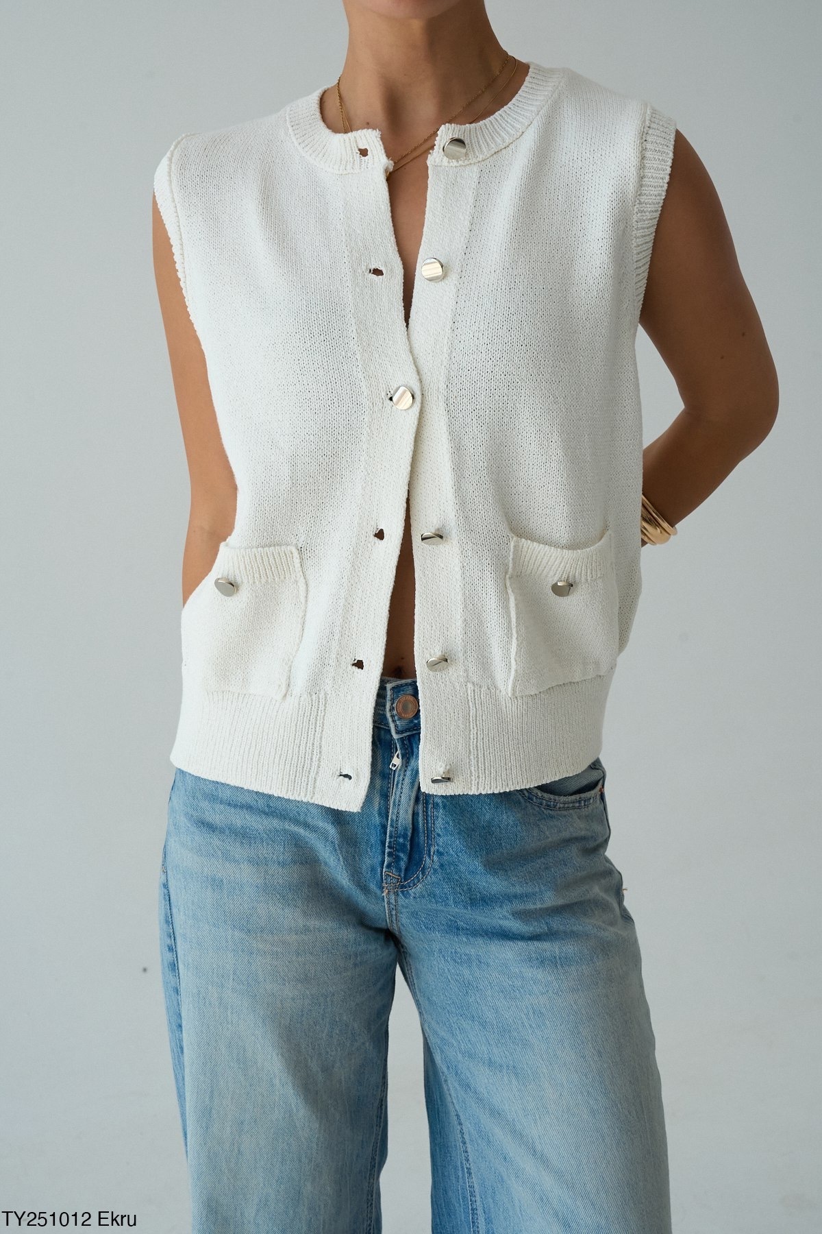KADIN ALTIN DÜĞMELİ V YAKA KOLSUZ TRİKO CEPLİ YELEK KADIN ALTIN DÜĞMELİ V YAKA KOLSUZ TRİKO CEPLİ YELEK TY251012 Standart