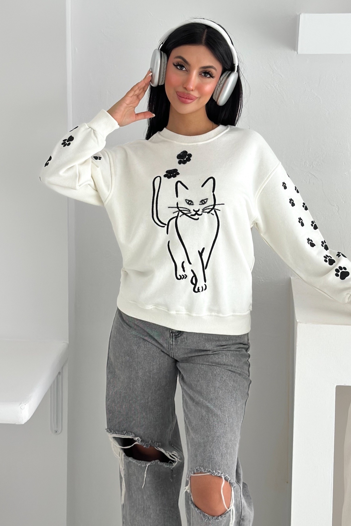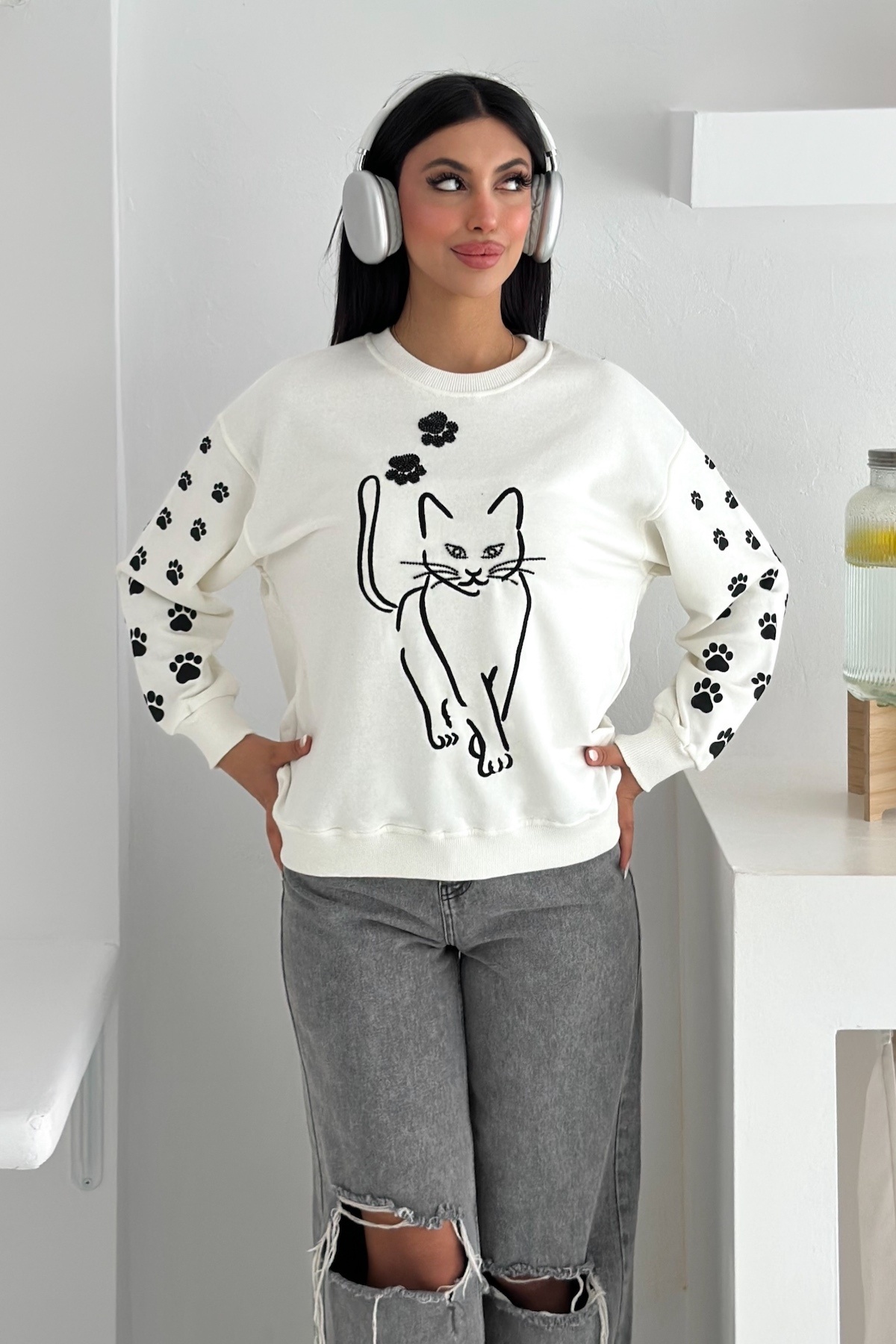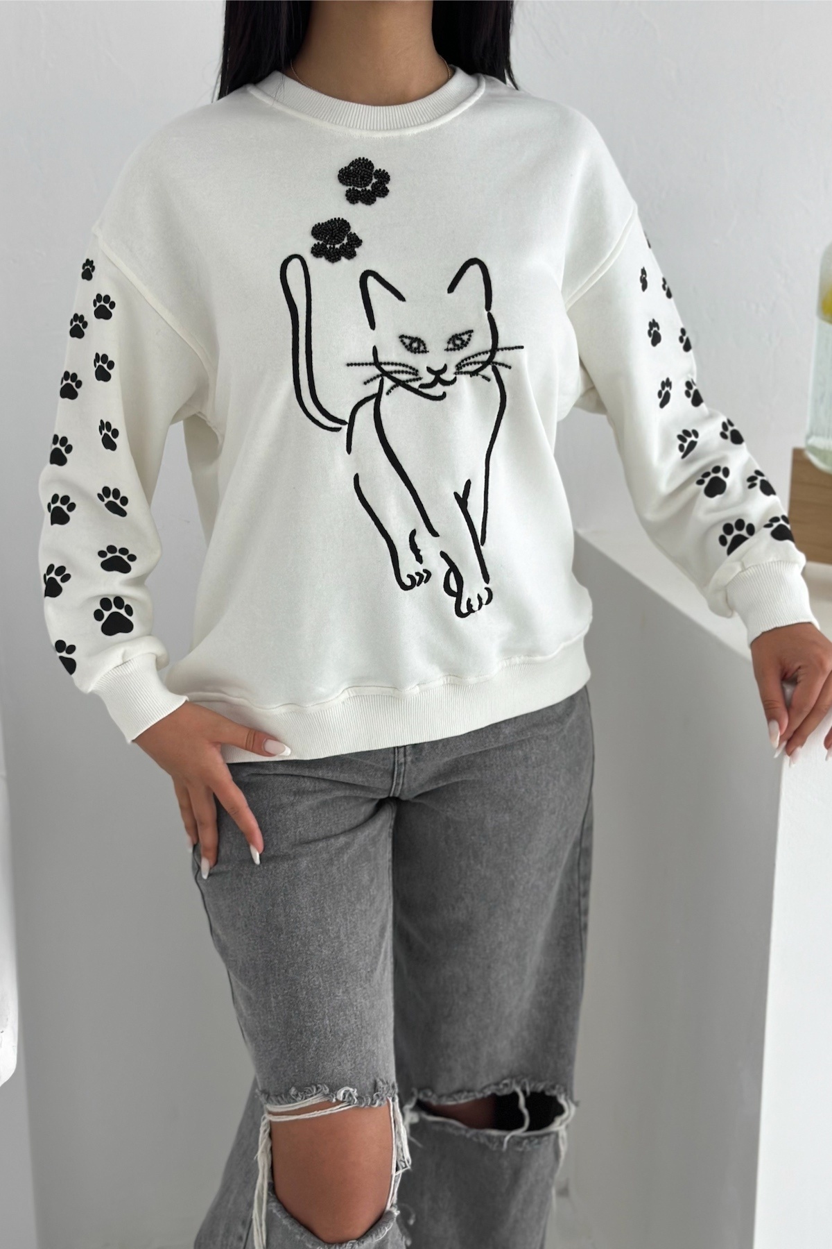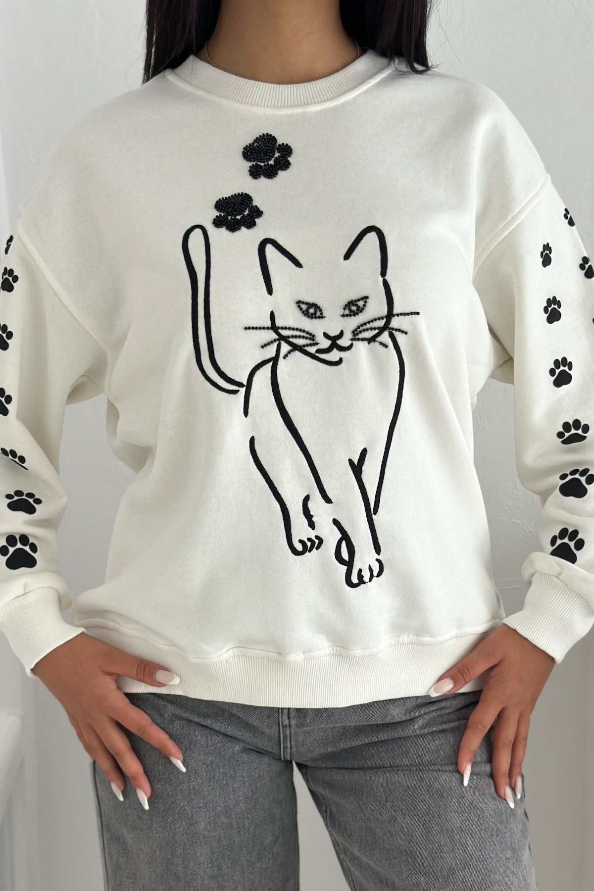 Beyaz Kedi Desen Boncuk İşlemeli %100 Pamuk Sweatshirt Beyaz Kedi Desen Boncuk İşlemeli %100 Pamuk Sweatshirt svt8 XL