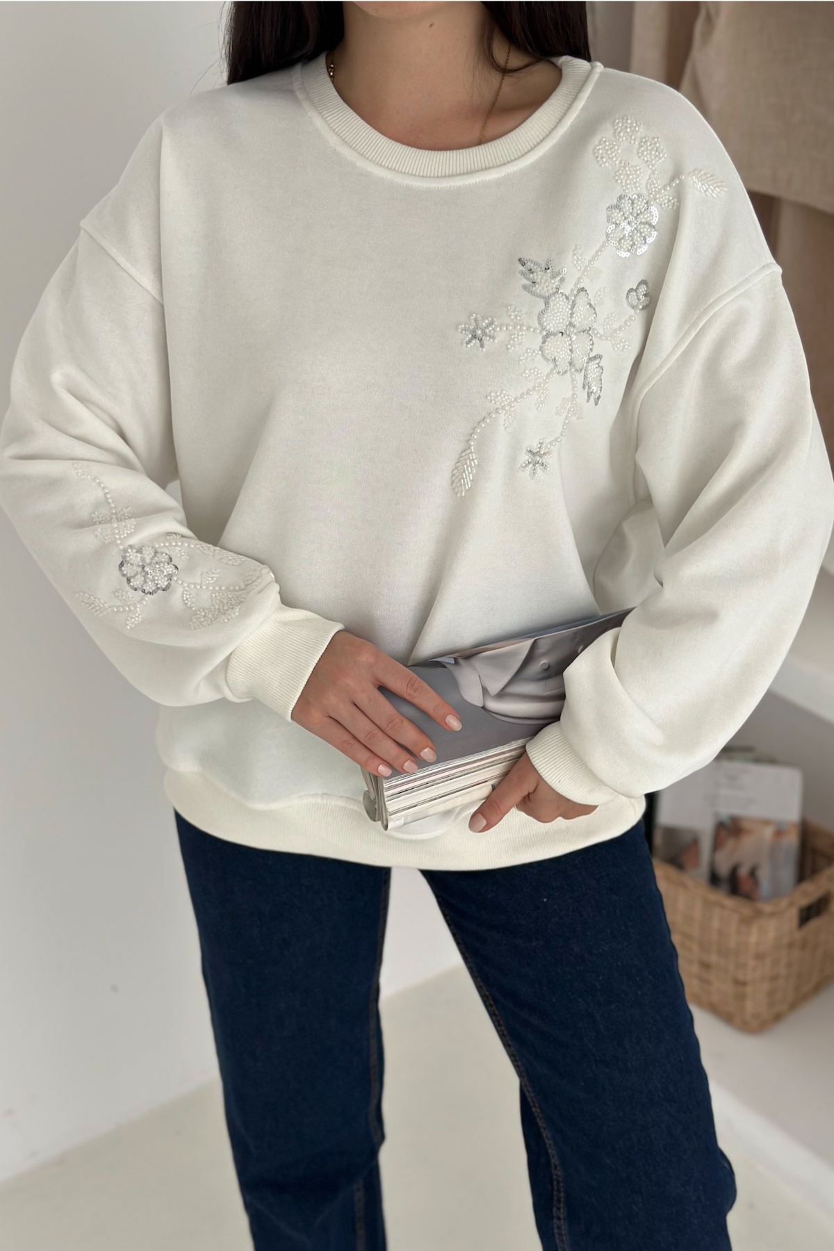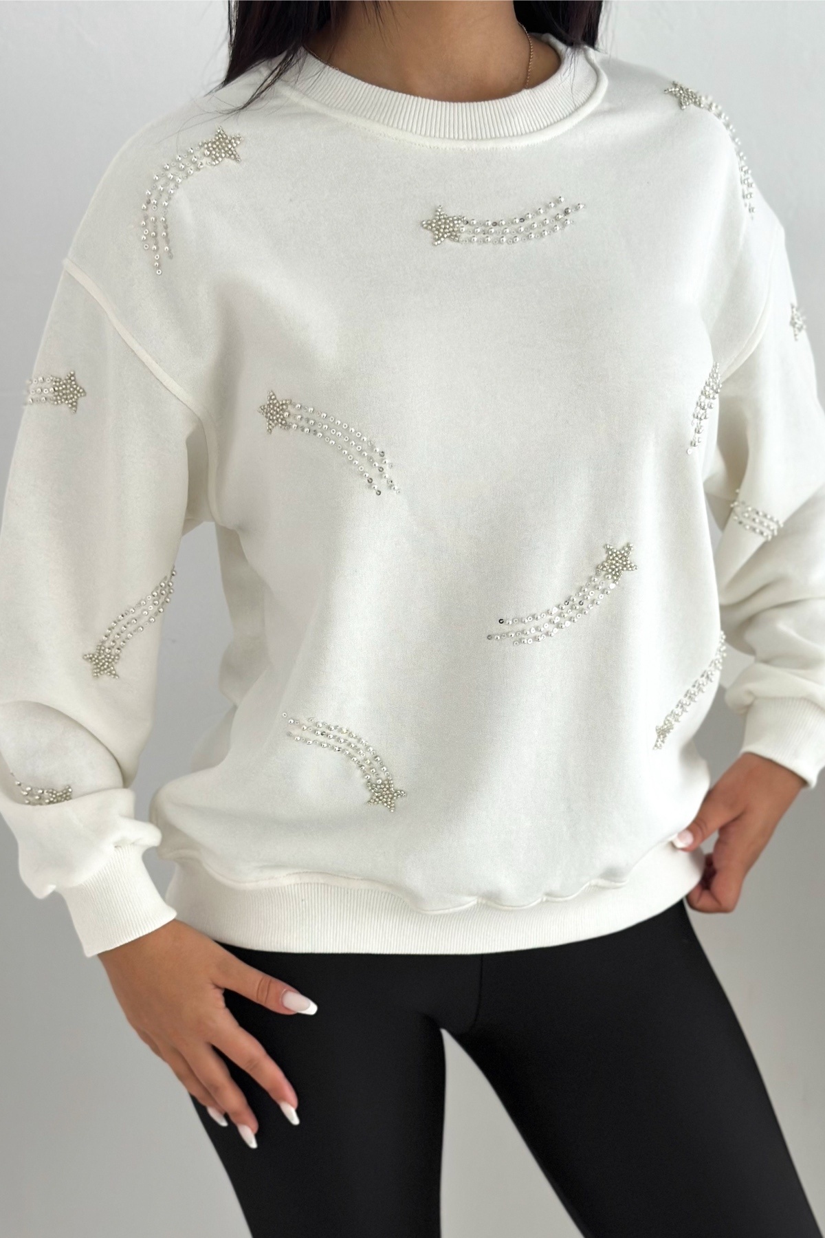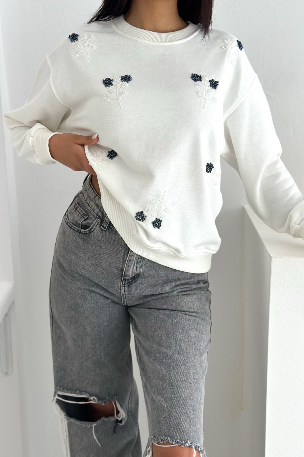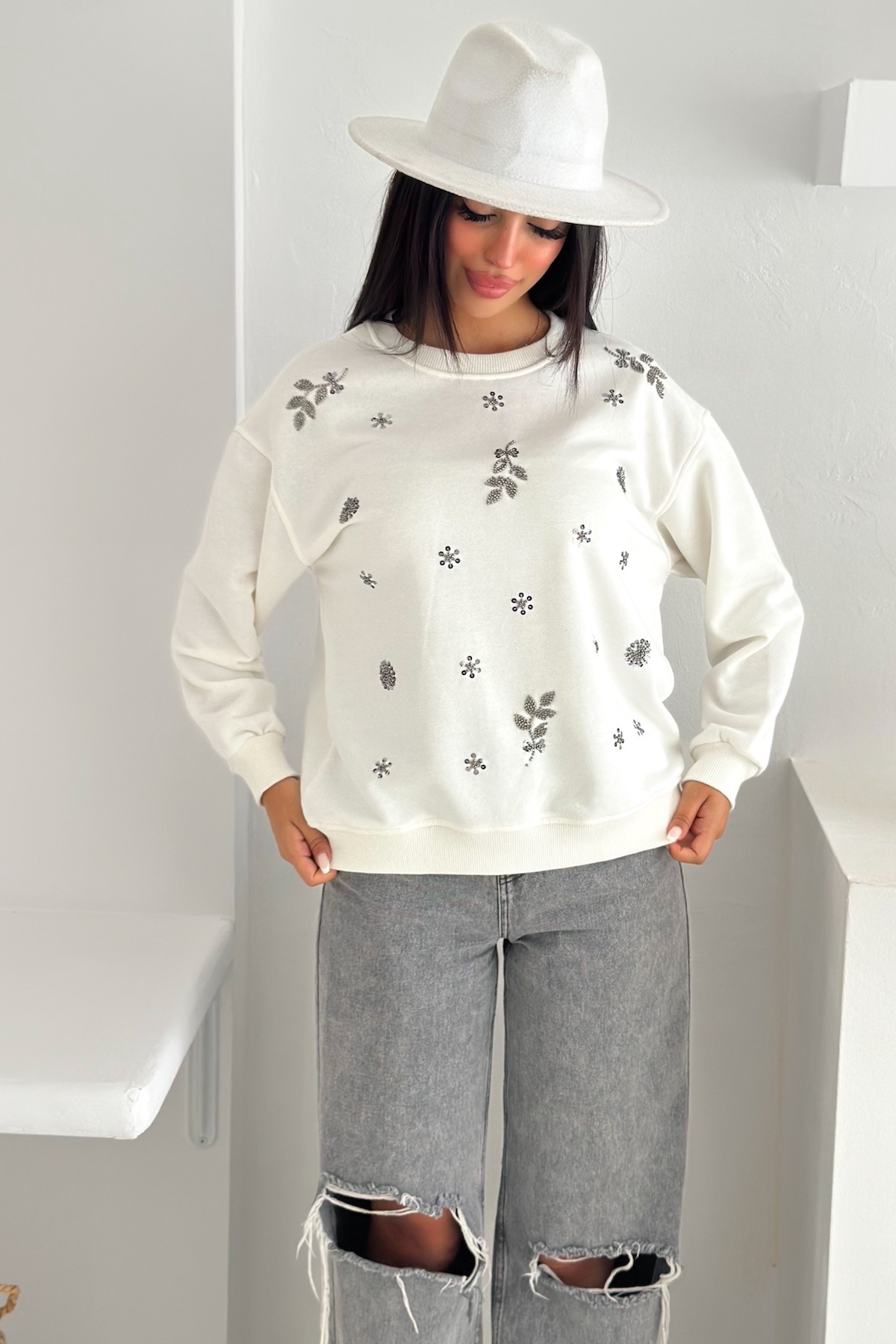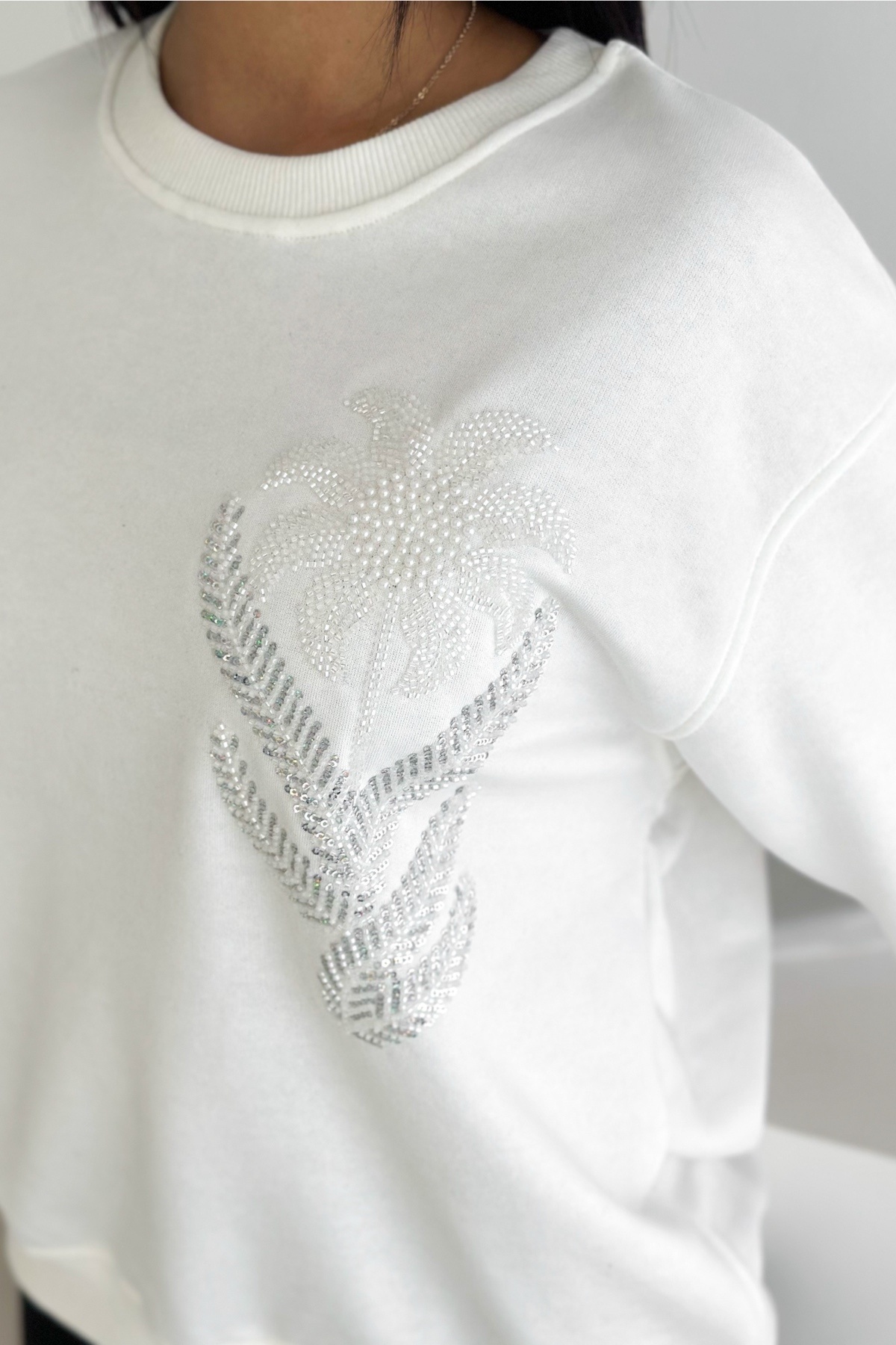 Beyaz Kedi Desen Boncuk İşlemeli %100 Pamuk Sweatshirt Beyaz Kedi Desen Boncuk İşlemeli %100 Pamuk Sweatshirt svt8 XL