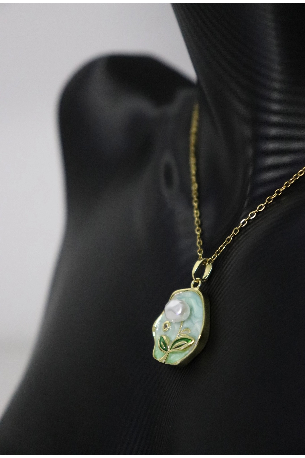 Gold Zincir İncili Yeşil Zemin Çiçek Tasarım Madalyon Çelik Kolye Gold Zincir İncili Yeşil Zemin Çiçek Tasarım Madalyon Çelik Kolye HEC0116K Standart