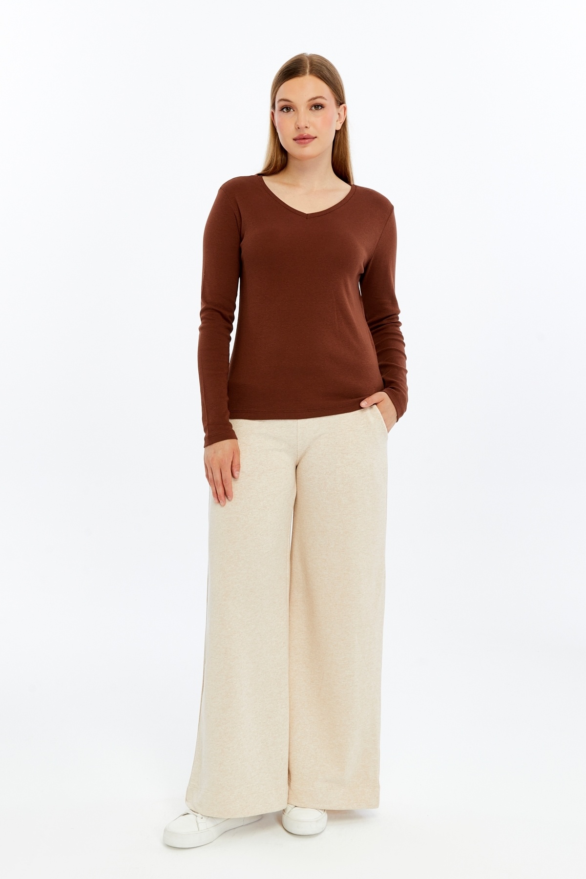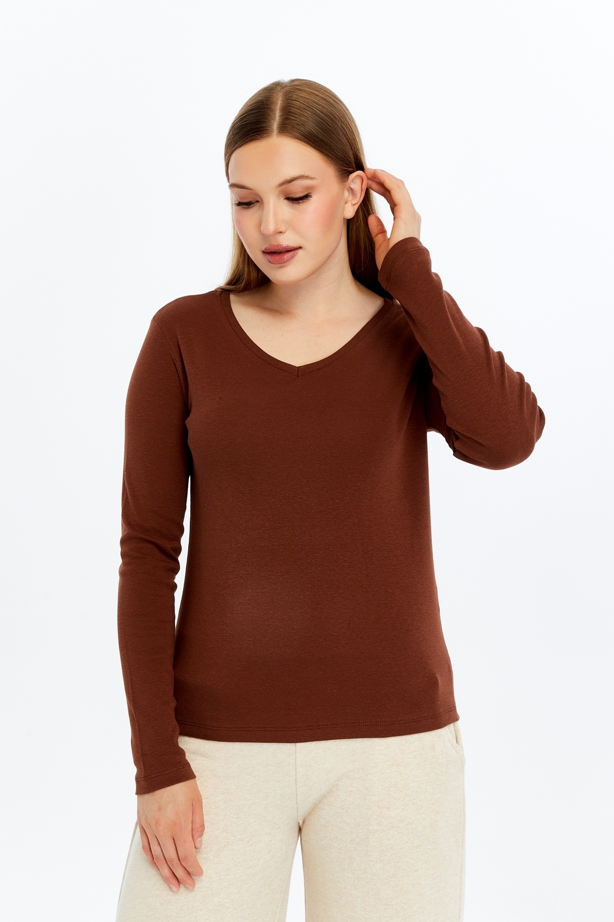 Kadın V Yaka Uzun Kollu Regular Fit Basic Tişört Koyu Kahve Kadın V Yaka Uzun Kollu Regular Fit Basic Tişört Koyu Kahve VALS 2XL