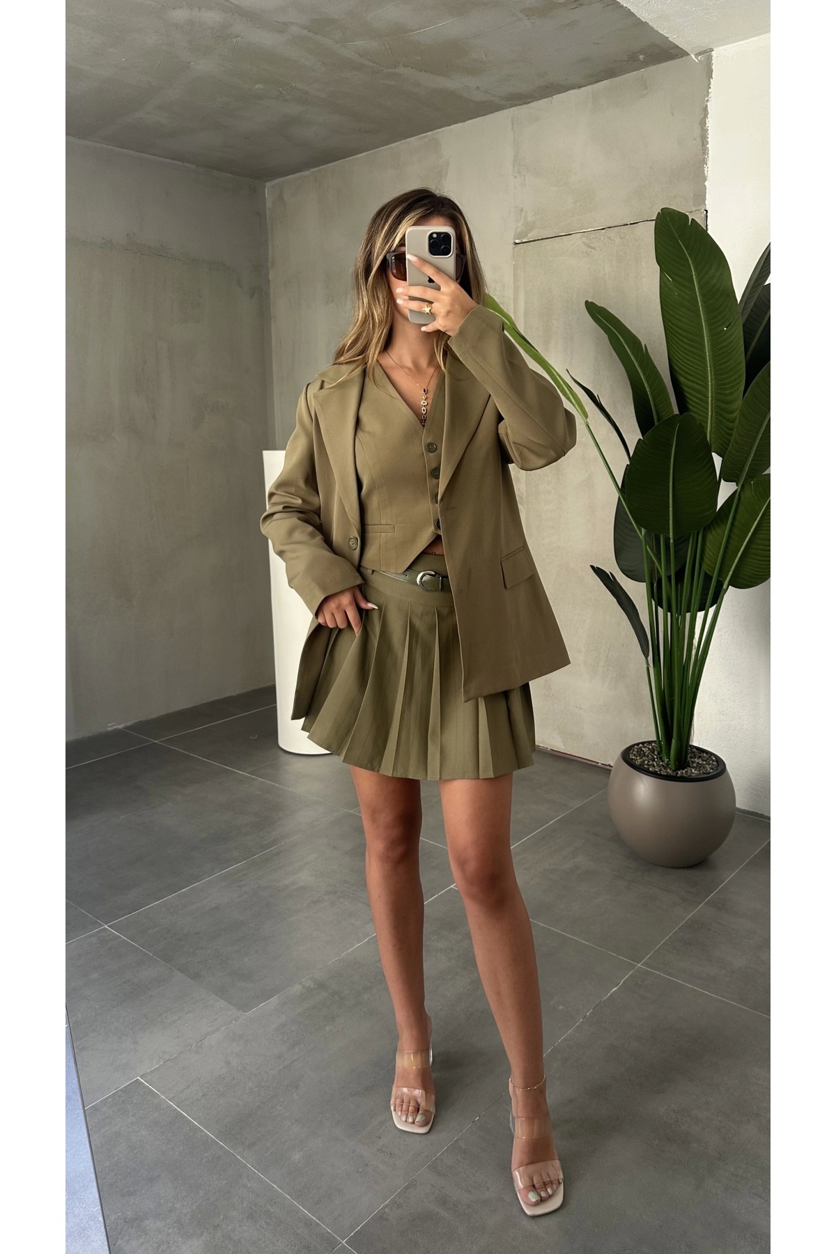 Kadın Haki Double Yelek-Etek & Blazer Ceket Üçlü Set Takım Kadın Haki Double Yelek-Etek & Blazer Ceket Üçlü Set Takım TRD2-T272 L