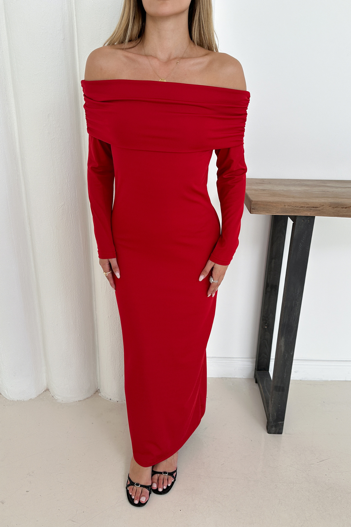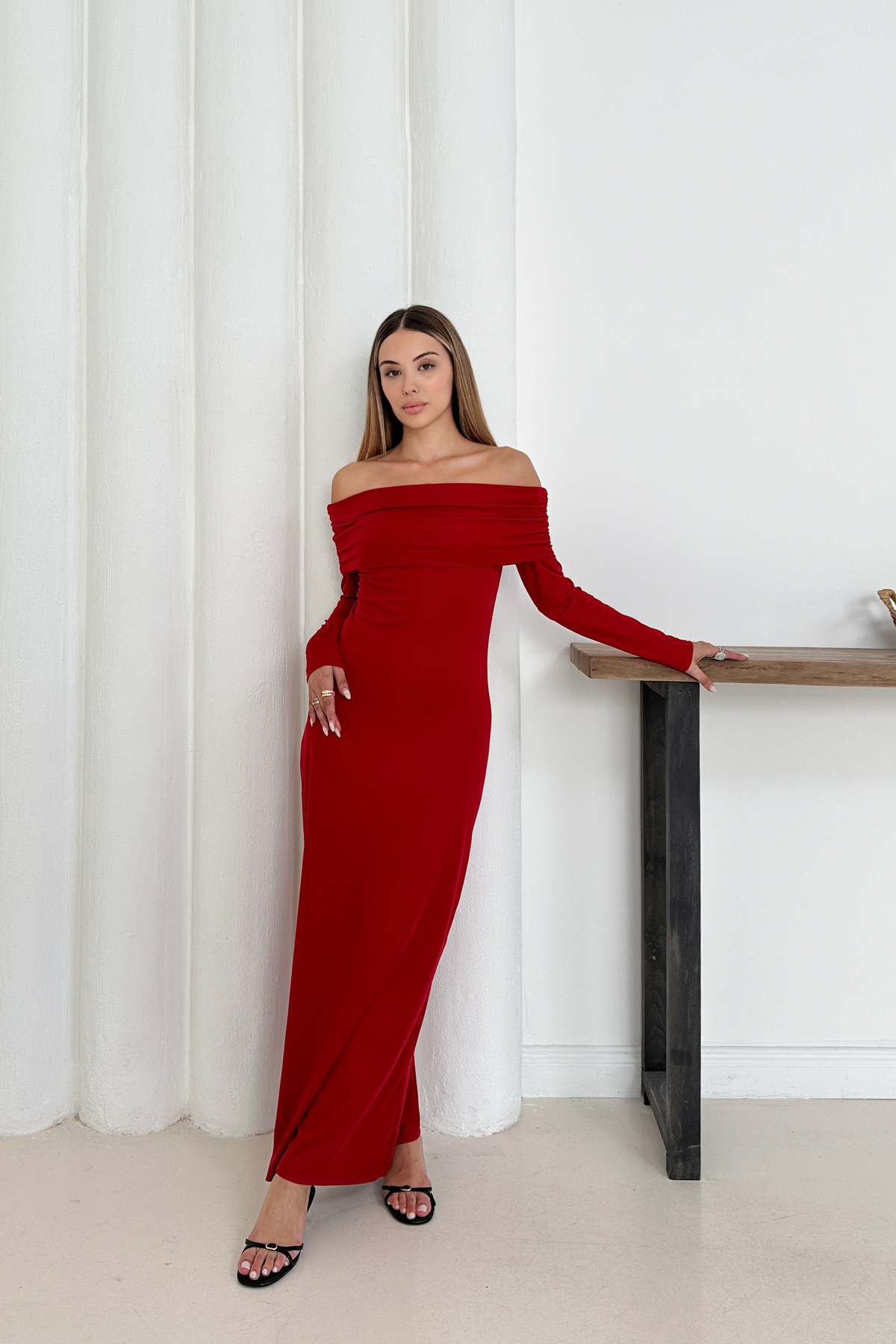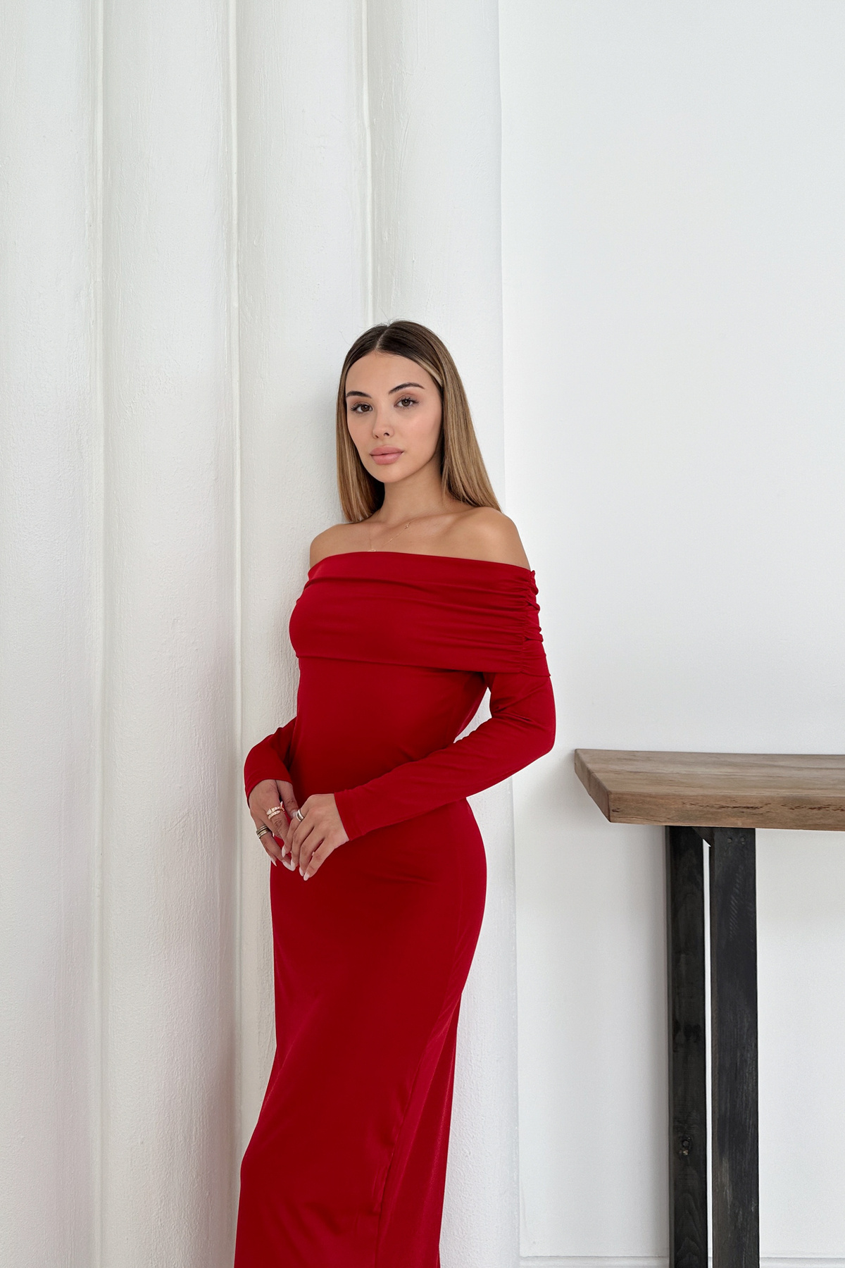 Kadın Kırmızı Madonna Yaka Uzun Kollu Abiye Elbise Kadın Kırmızı Madonna Yaka Uzun Kollu Abiye Elbise 2020 L