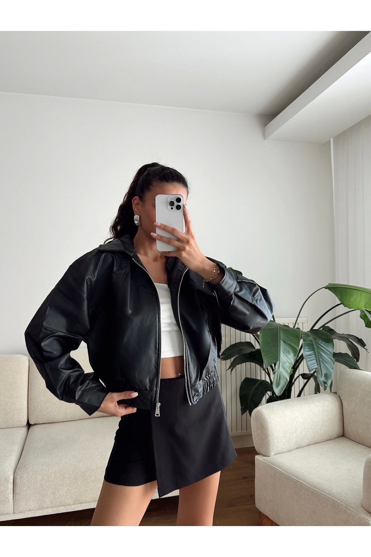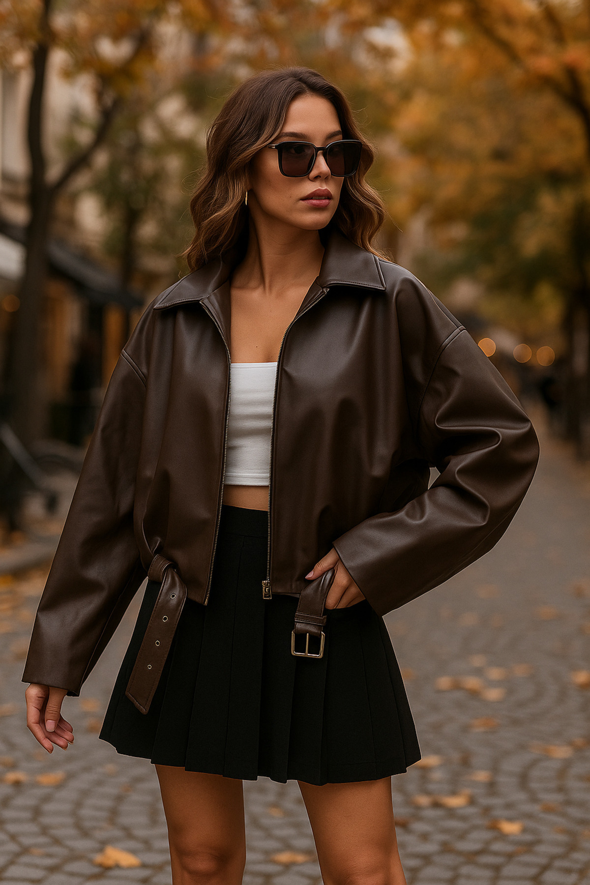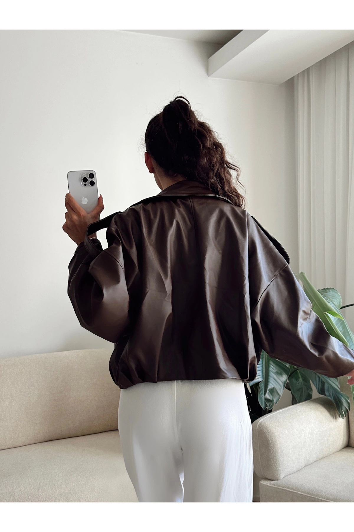 Oversize Bel Lastik Deri Ceket - KAHVE Oversize Bel Lastik Deri Ceket - KAHVE P18047S1987 L