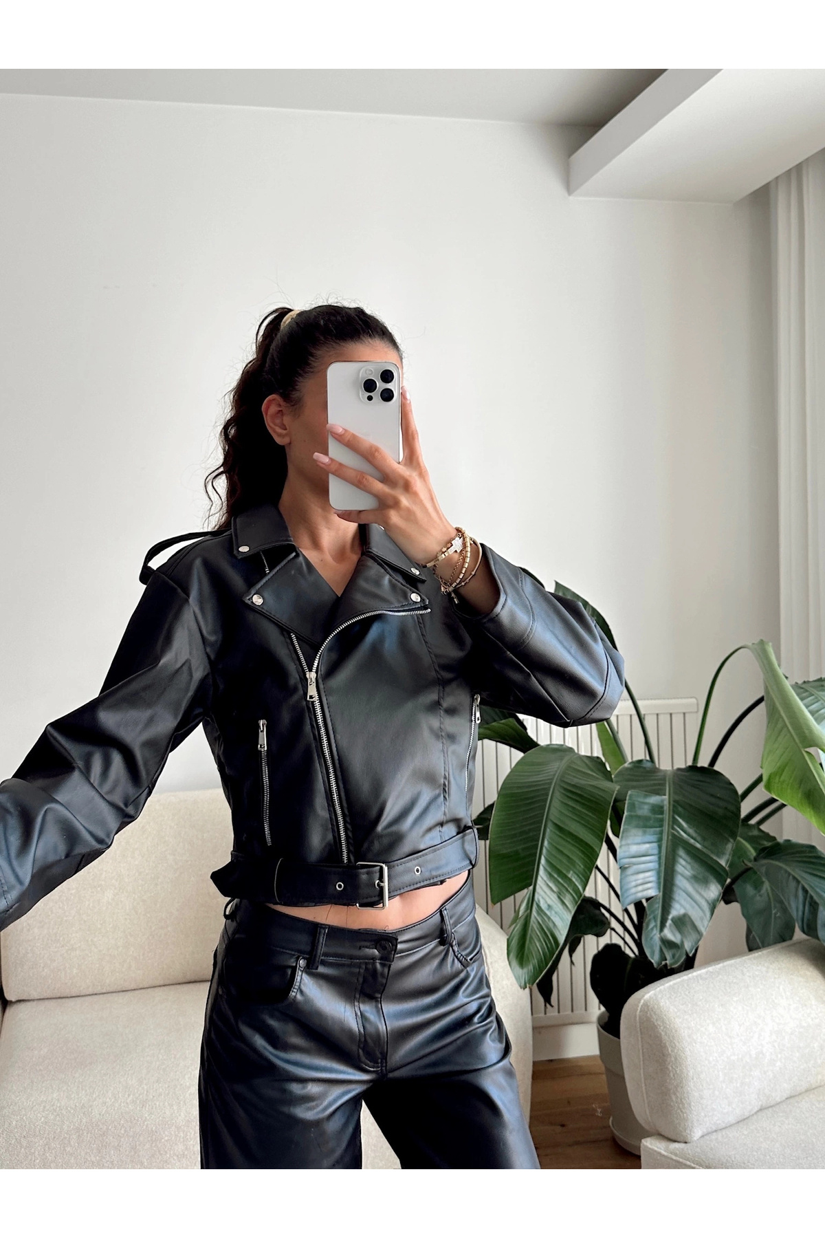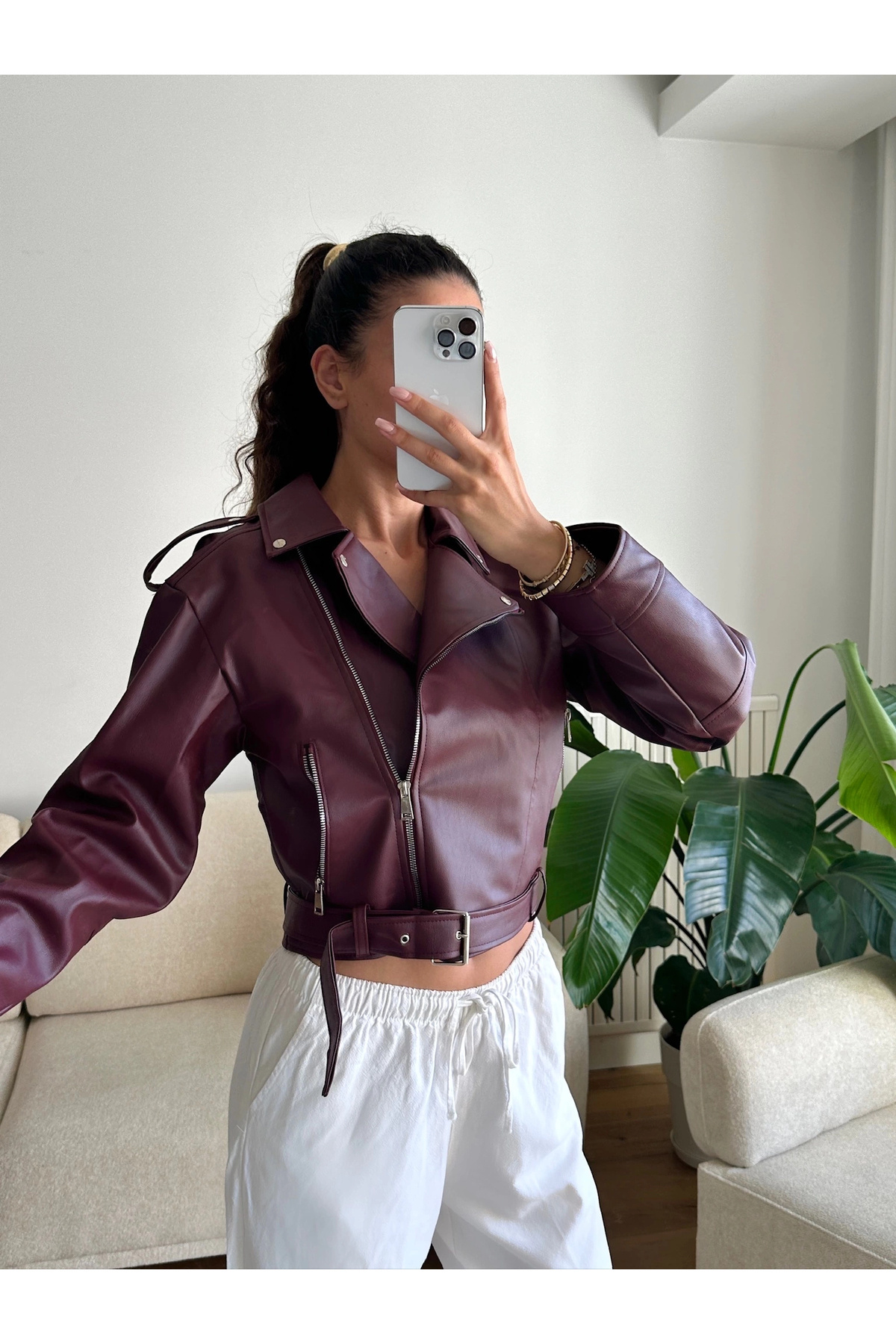 Biker Kemerli Deri Ceket - BORDO Biker Kemerli Deri Ceket - BORDO P18022S363 L