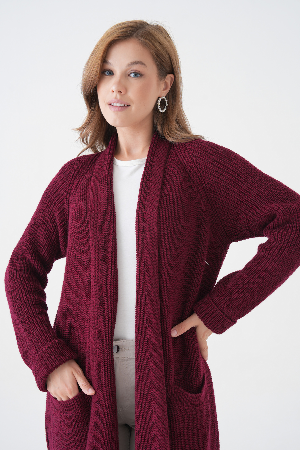 Kadın Triko Kumaş Çift Cep Tasarım Şal Yaka Uzun Bordo Hırka 5001 Kadın Triko Kumaş Çift Cep Tasarım Şal Yaka Uzun Bordo Hırka 5001 BS-MRVMD-5001 S/M