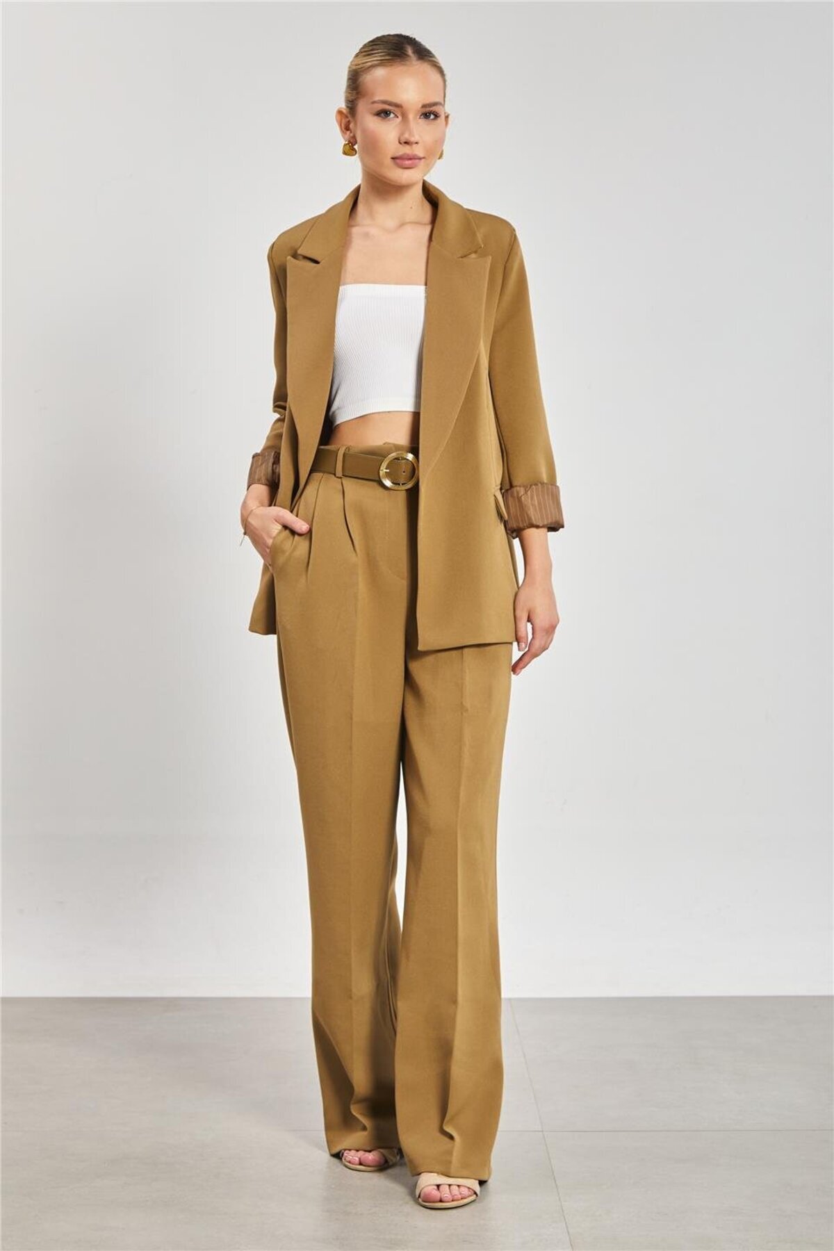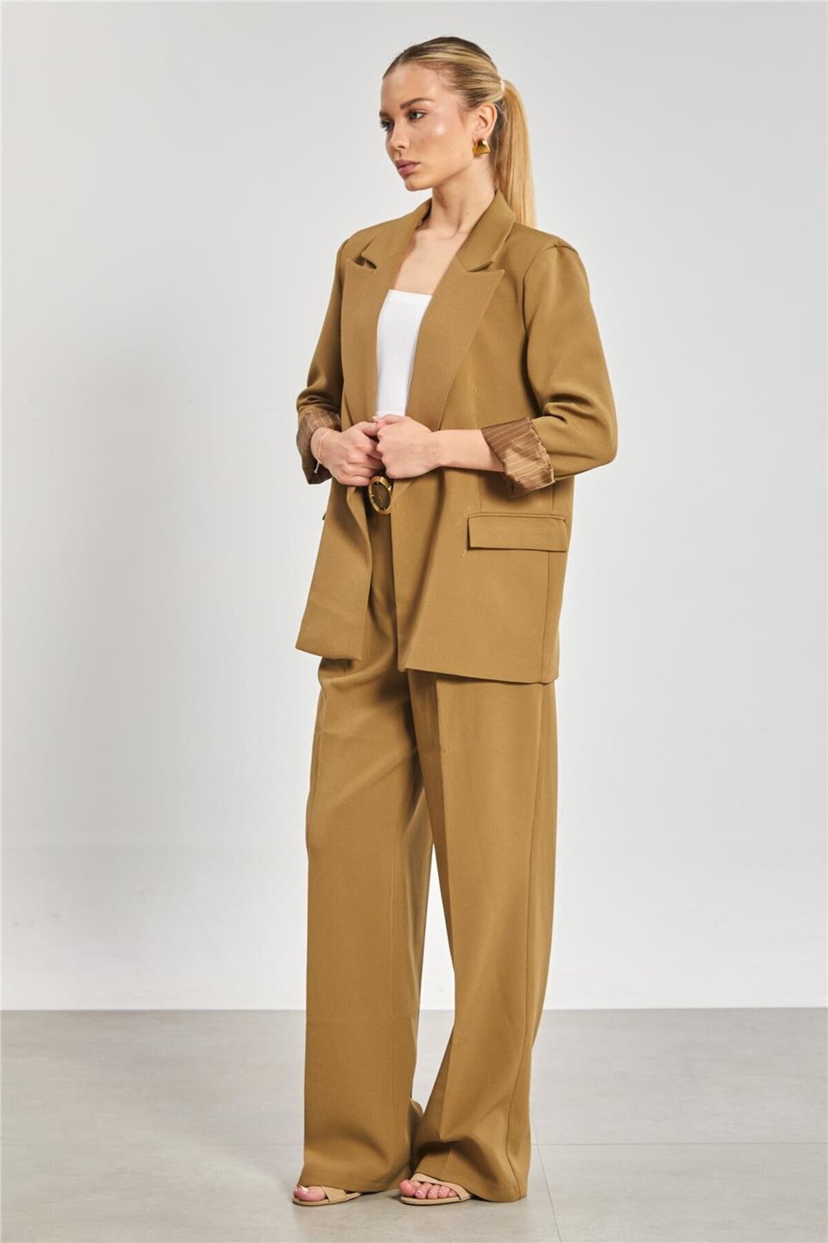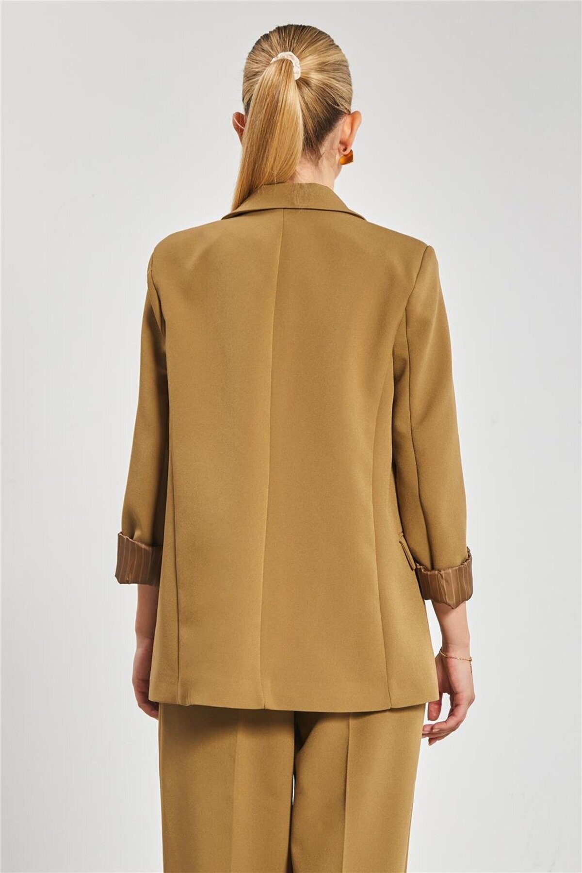 Çizgili Astarlı Kadın Blazer Ceket - Camel Çizgili Astarlı Kadın Blazer Ceket - Camel 1040-25M50012 XL