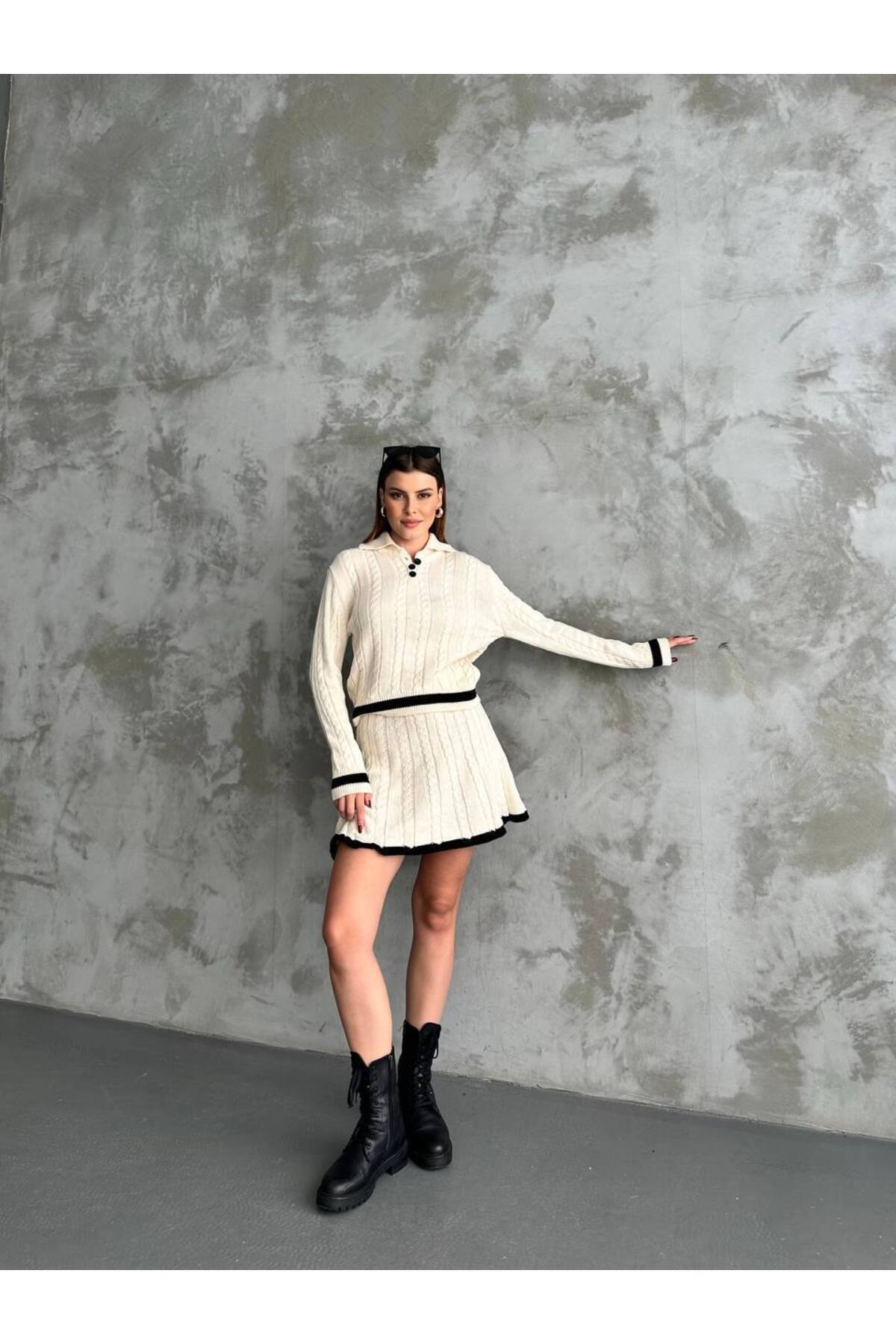 Kadın Triko Düğmeli Polo Yaka Etekli Takım Kadın Triko Düğmeli Polo Yaka Etekli Takım trkdugmlplyketkl Standart