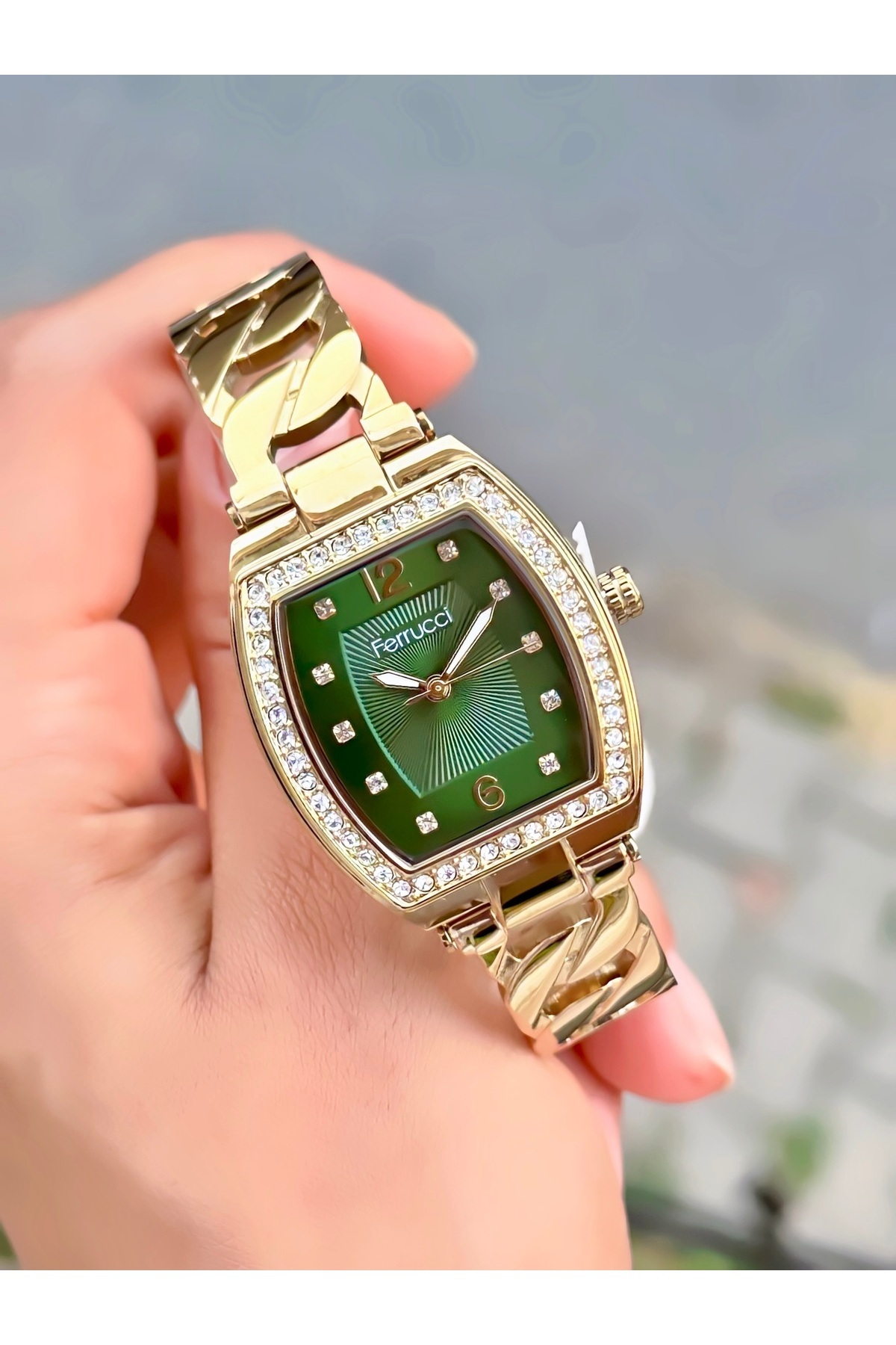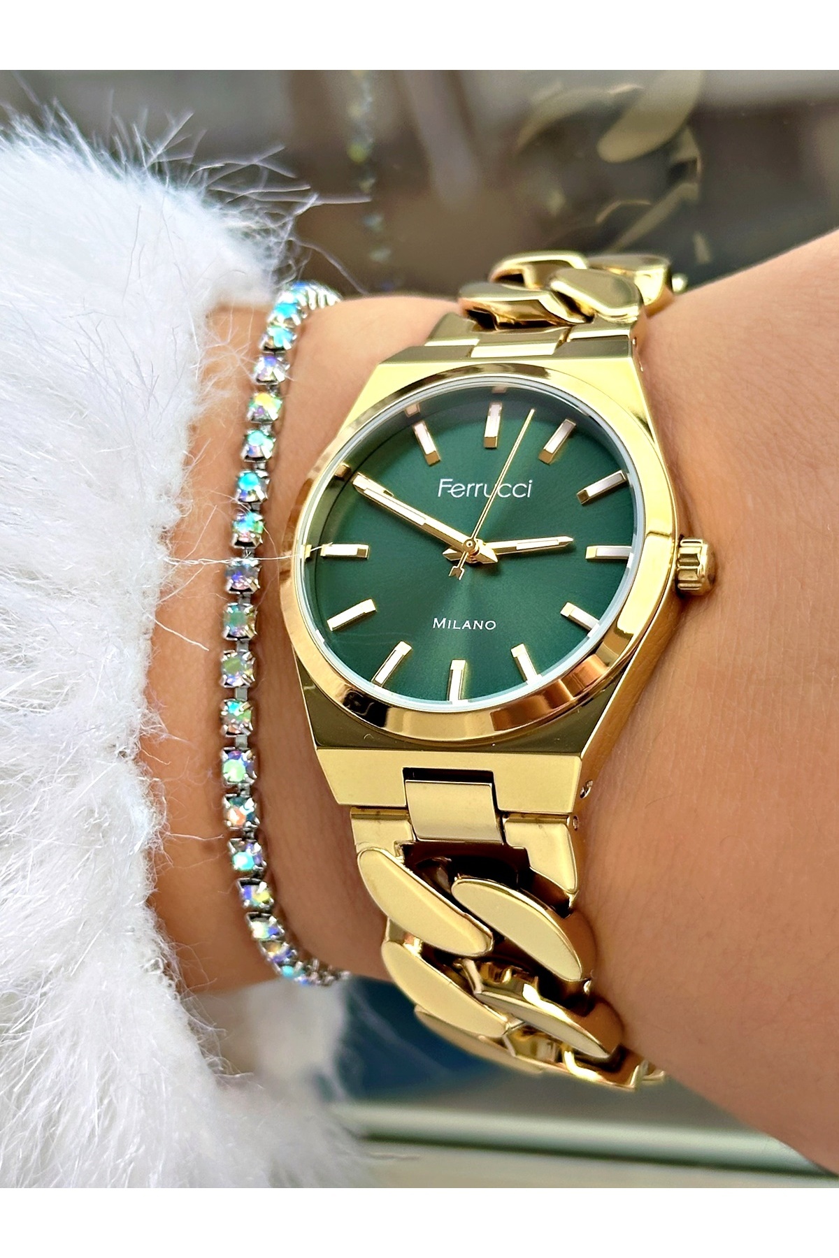 ZİNCİR KORDONLU YEŞİL KADRANLI GOLD KADIN METAL KOL SAATİ ZİNCİR KORDONLU YEŞİL KADRANLI GOLD KADIN METAL KOL SAATİ FC.03588M.05 تک سایز