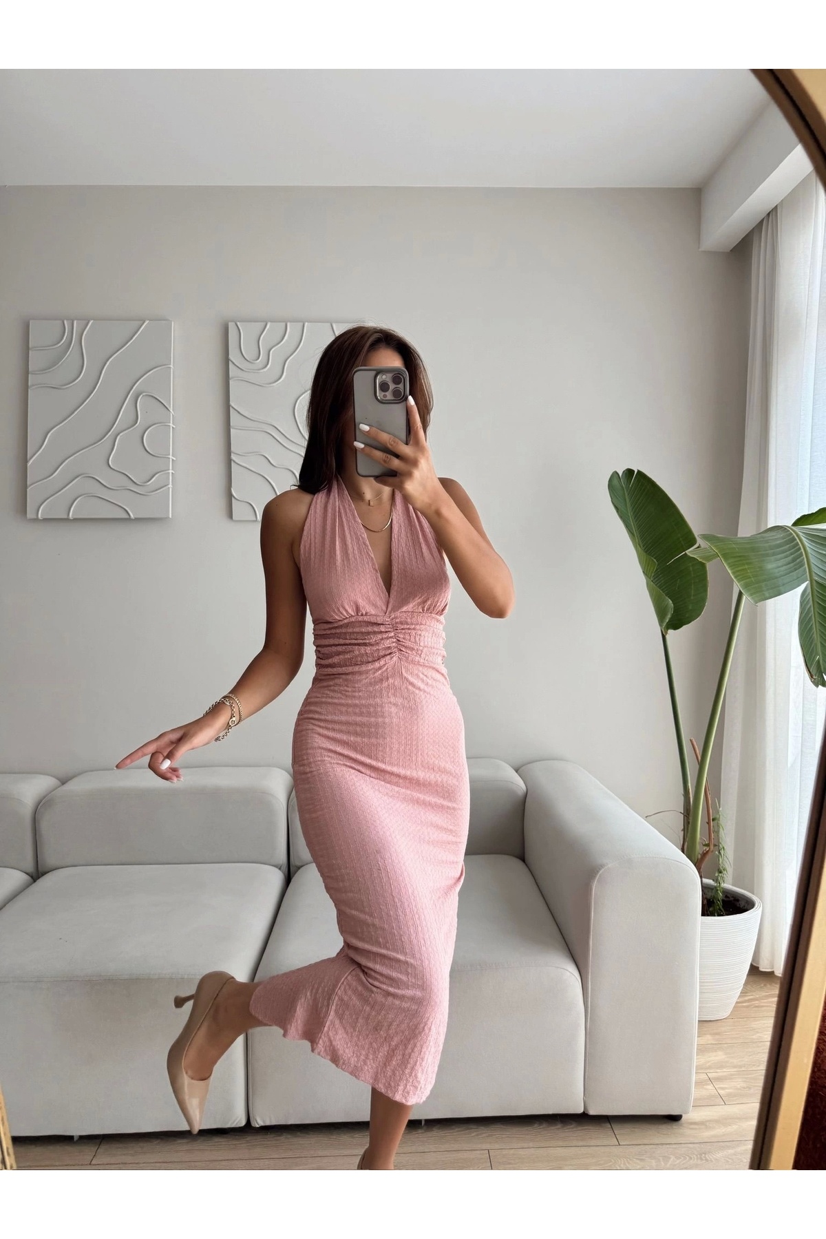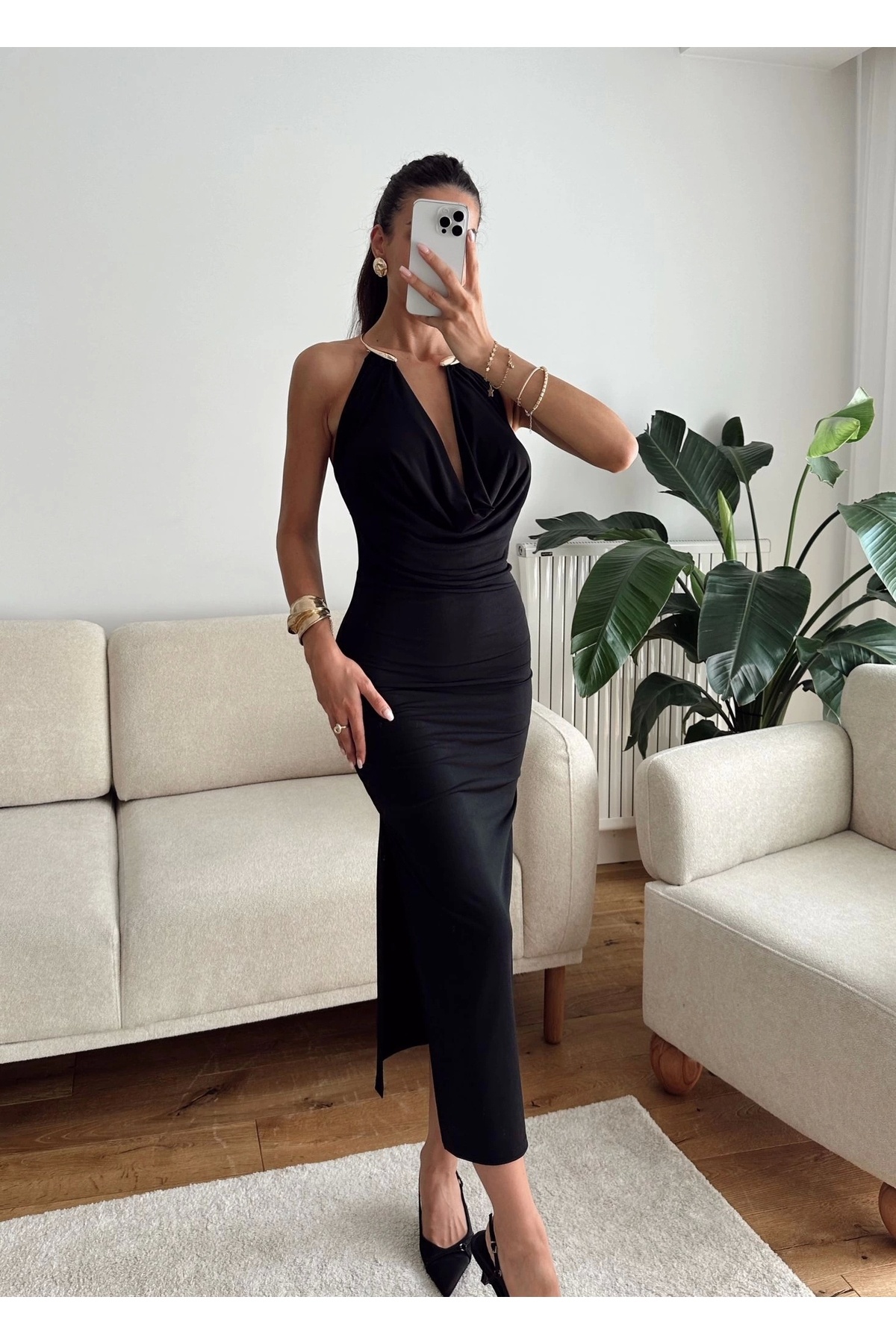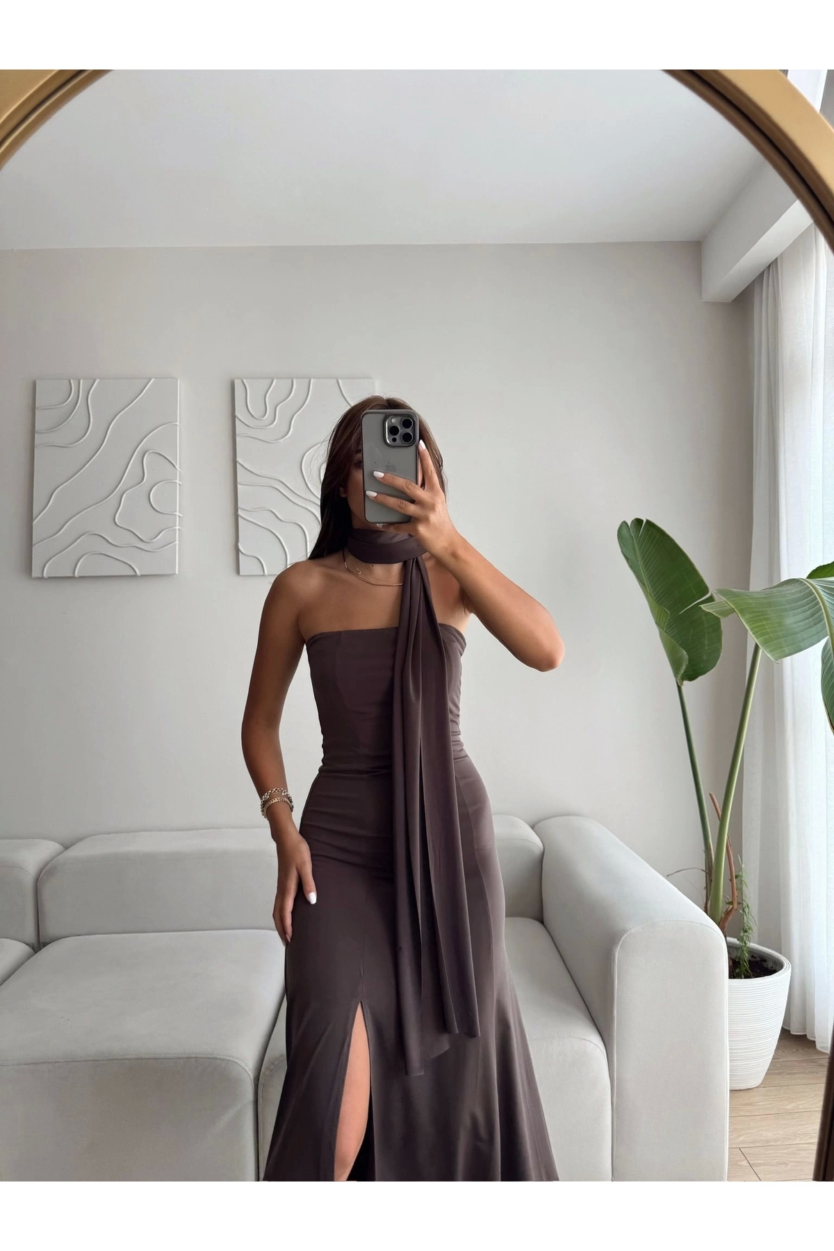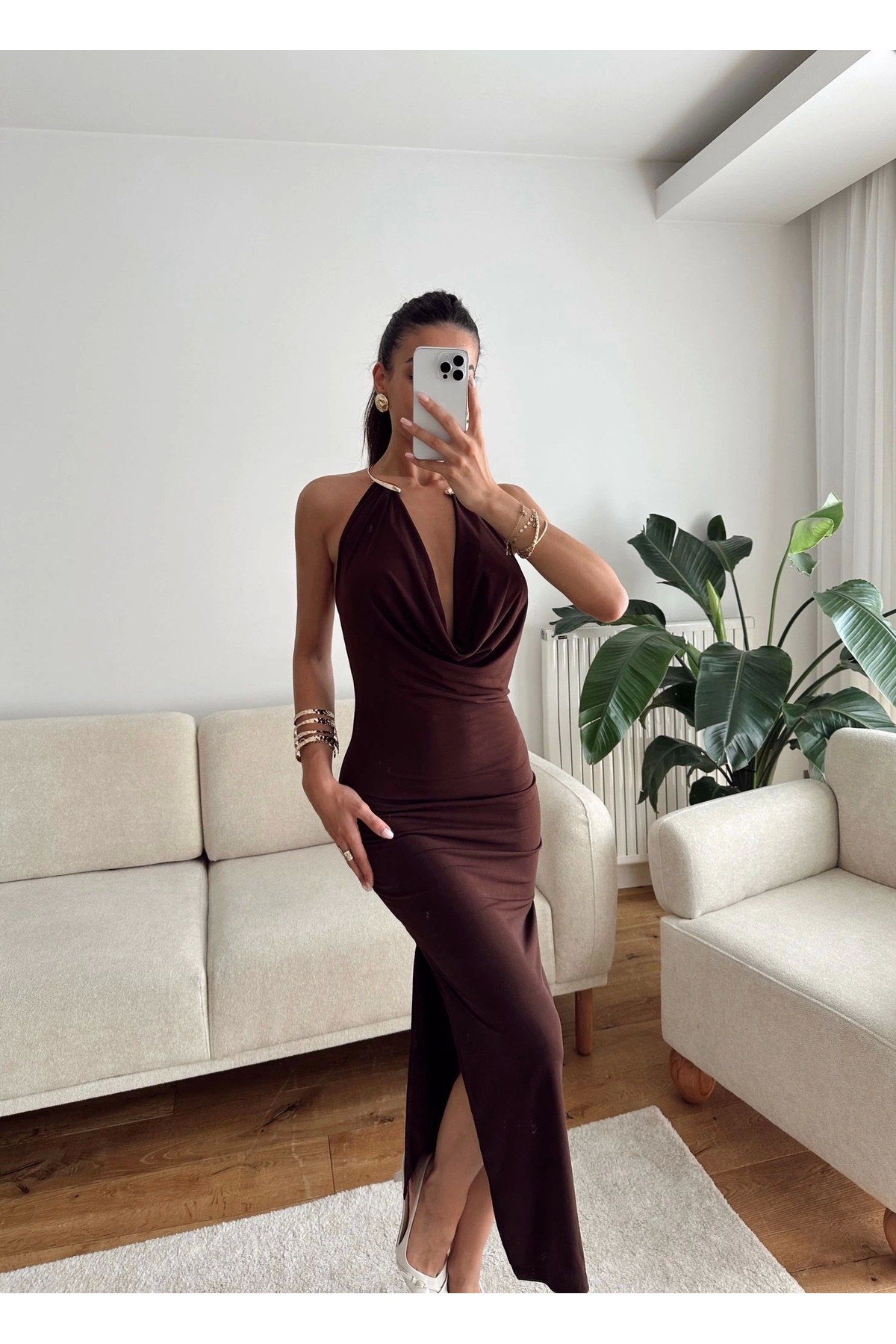 Boyun Bağlamalı Drapeli Elbise - KAHVE Boyun Bağlamalı Drapeli Elbise - KAHVE P18076S963 L