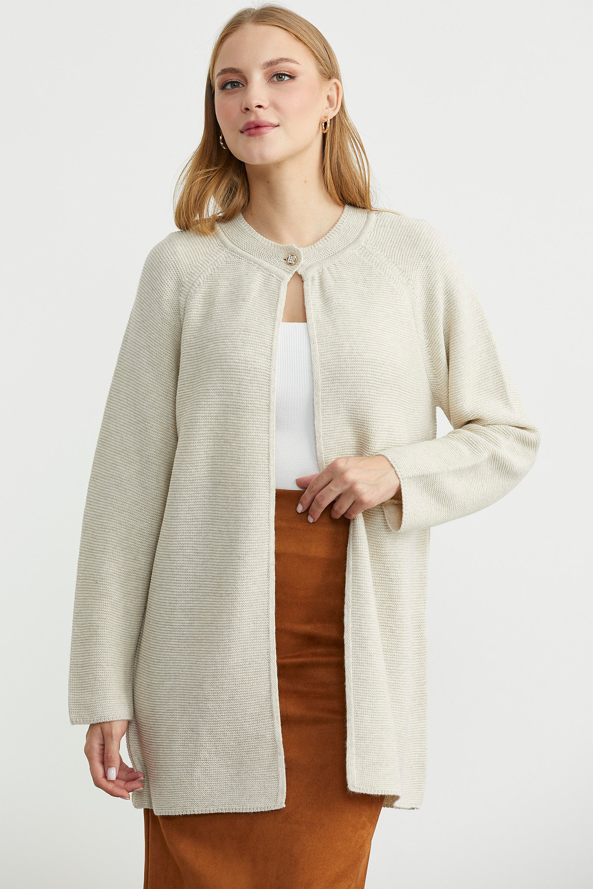 Sıfır Yaka Yünlü Uzun Triko Hırka - Taş Sıfır Yaka Yünlü Uzun Triko Hırka - Taş 24K2112-34526.0001 L
