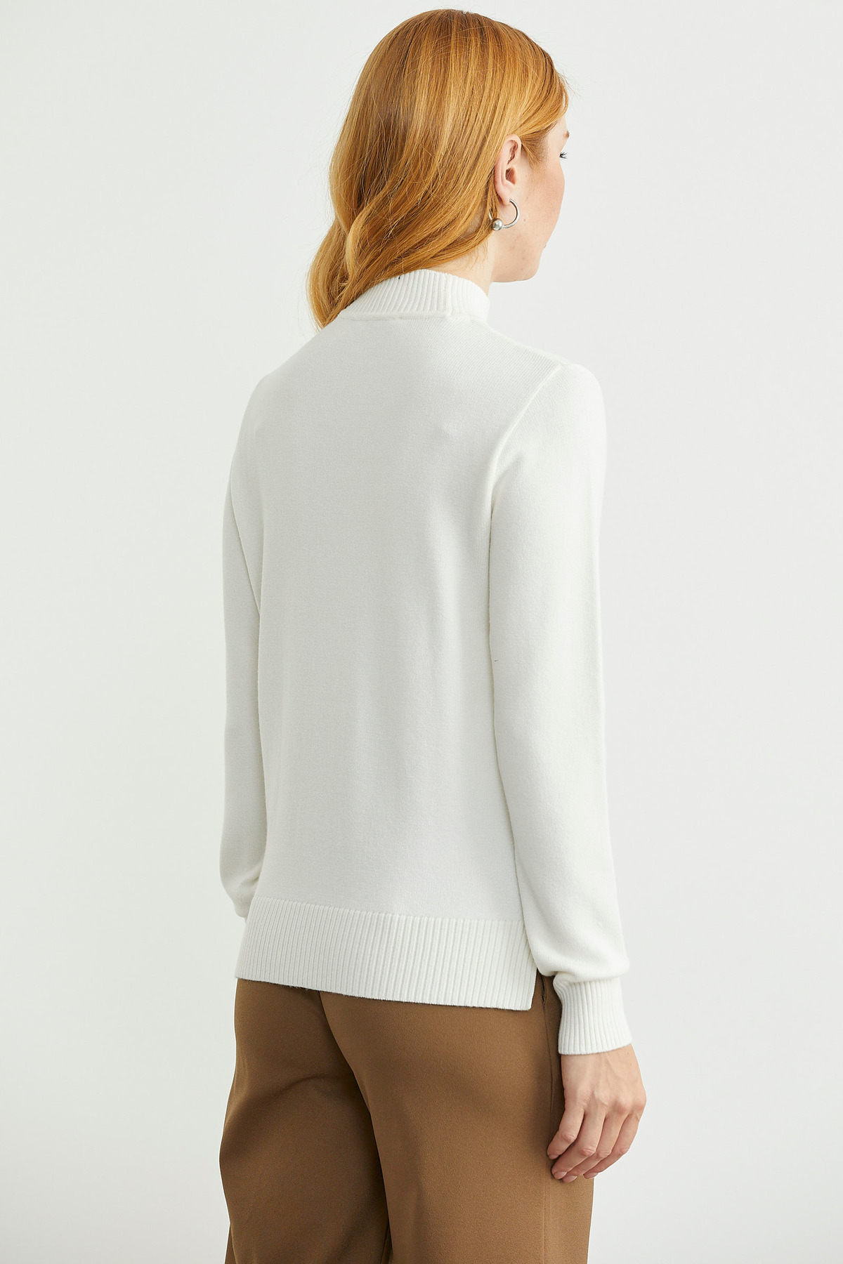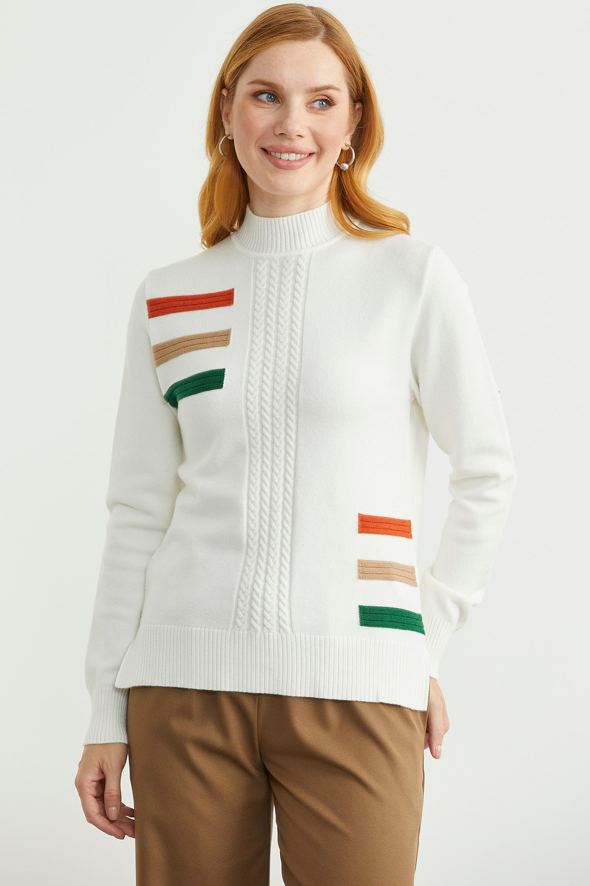 Dik Yaka Renk Detaylı Triko Kazak - Kemik Dik Yaka Renk Detaylı Triko Kazak - Kemik 24K2115-32583.0001 L