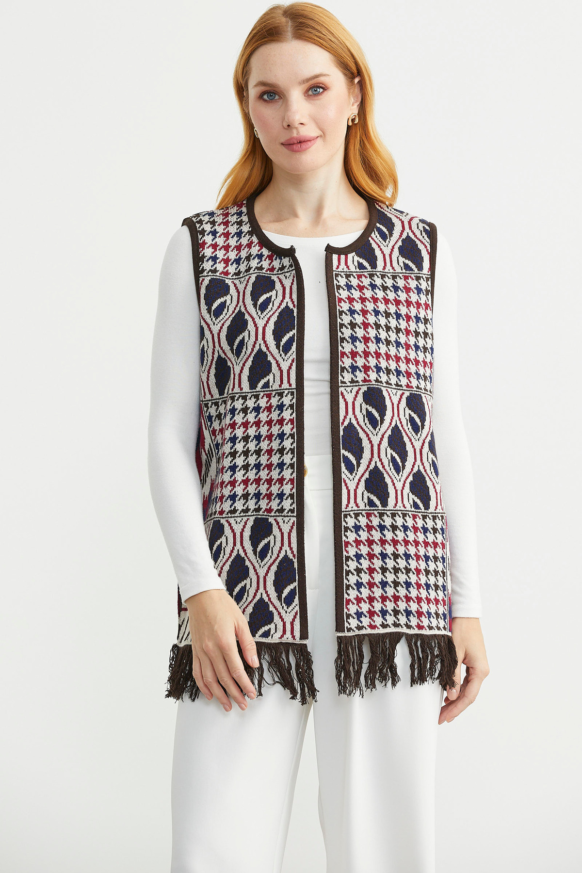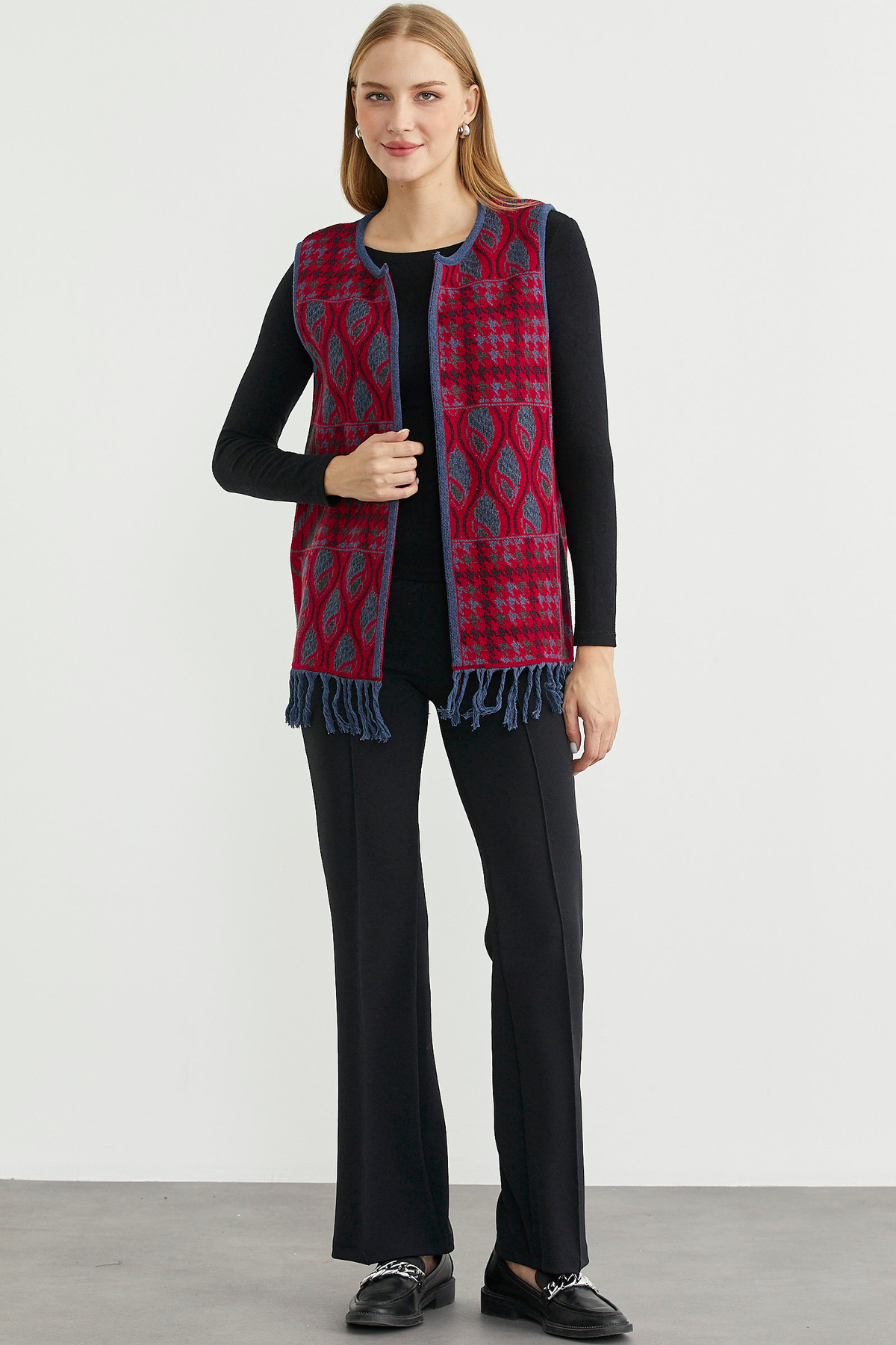 Desenli Bohem Yünlü Triko Yelek - Kırmızı Desenli Bohem Yünlü Triko Yelek - Kırmızı 25K2133-34543.0001 XL