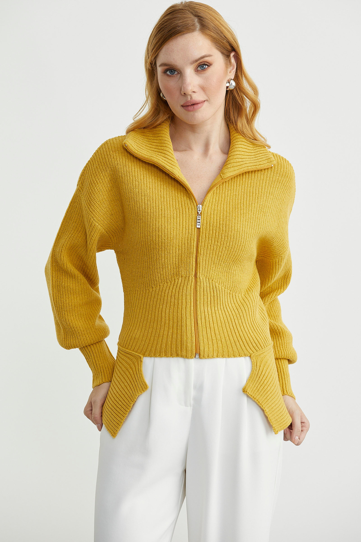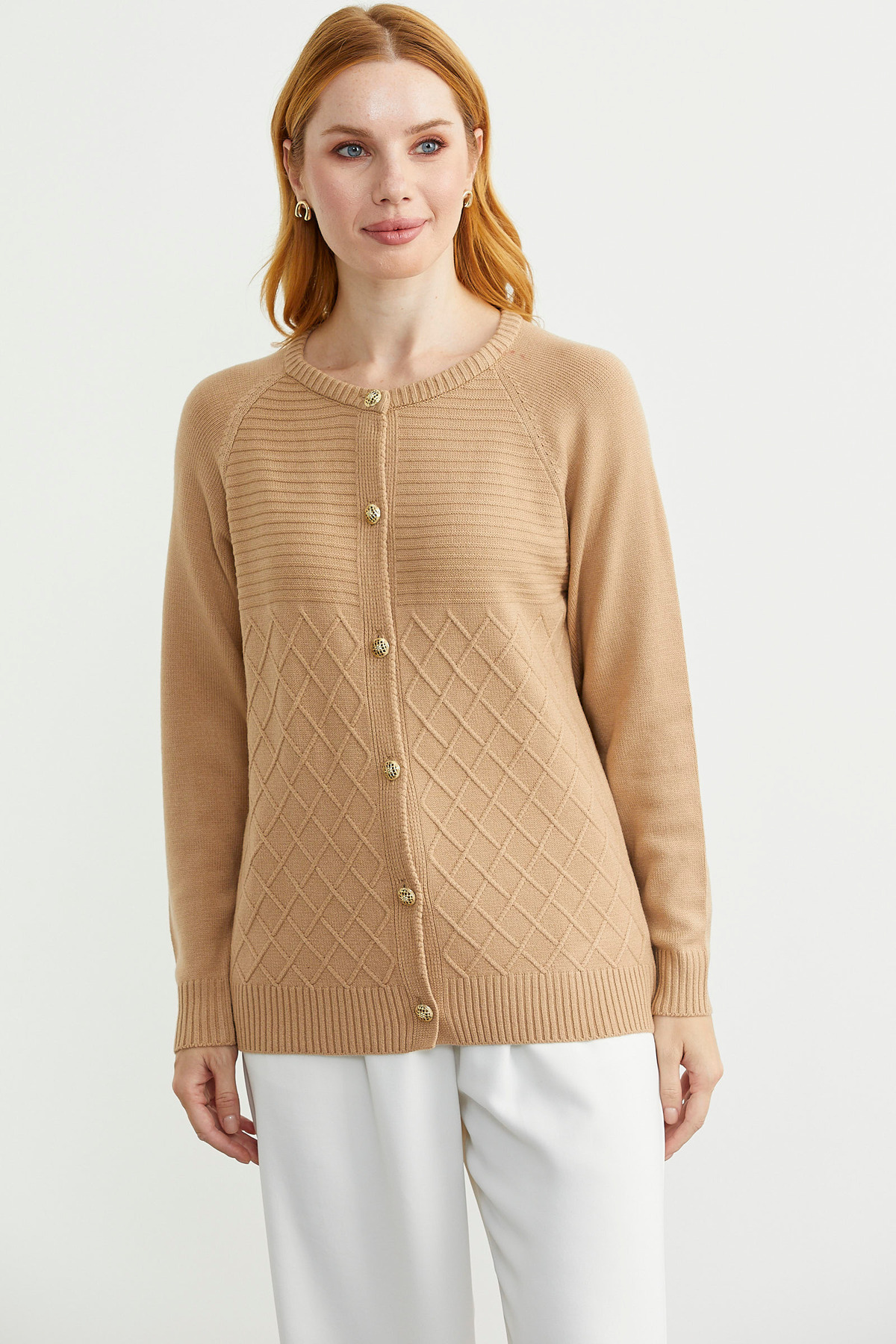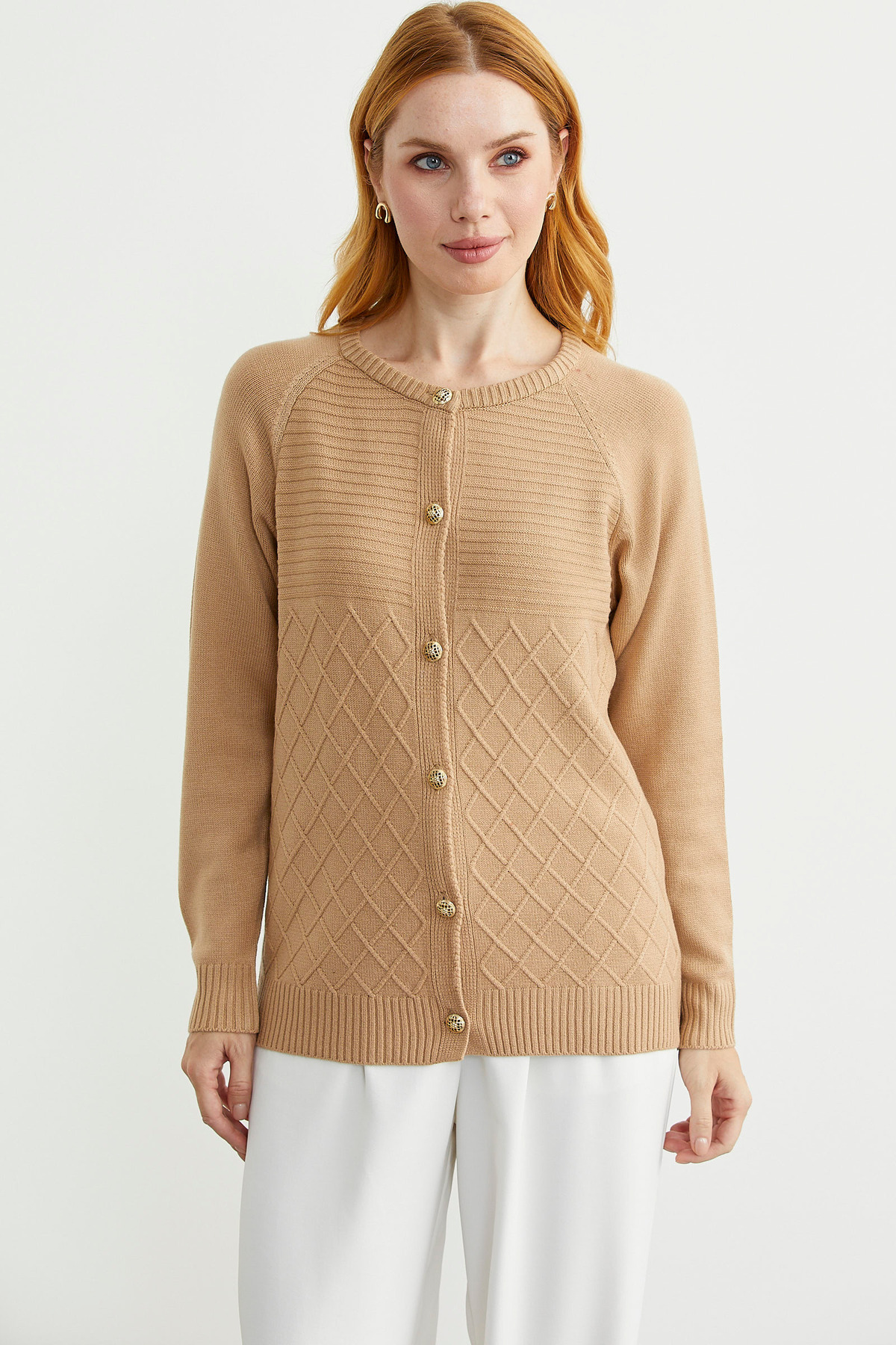 Bisiklet Yaka Motifli Triko Hırka - Kamel Bisiklet Yaka Motifli Triko Hırka - Kamel 25K2112-34521.0001 M