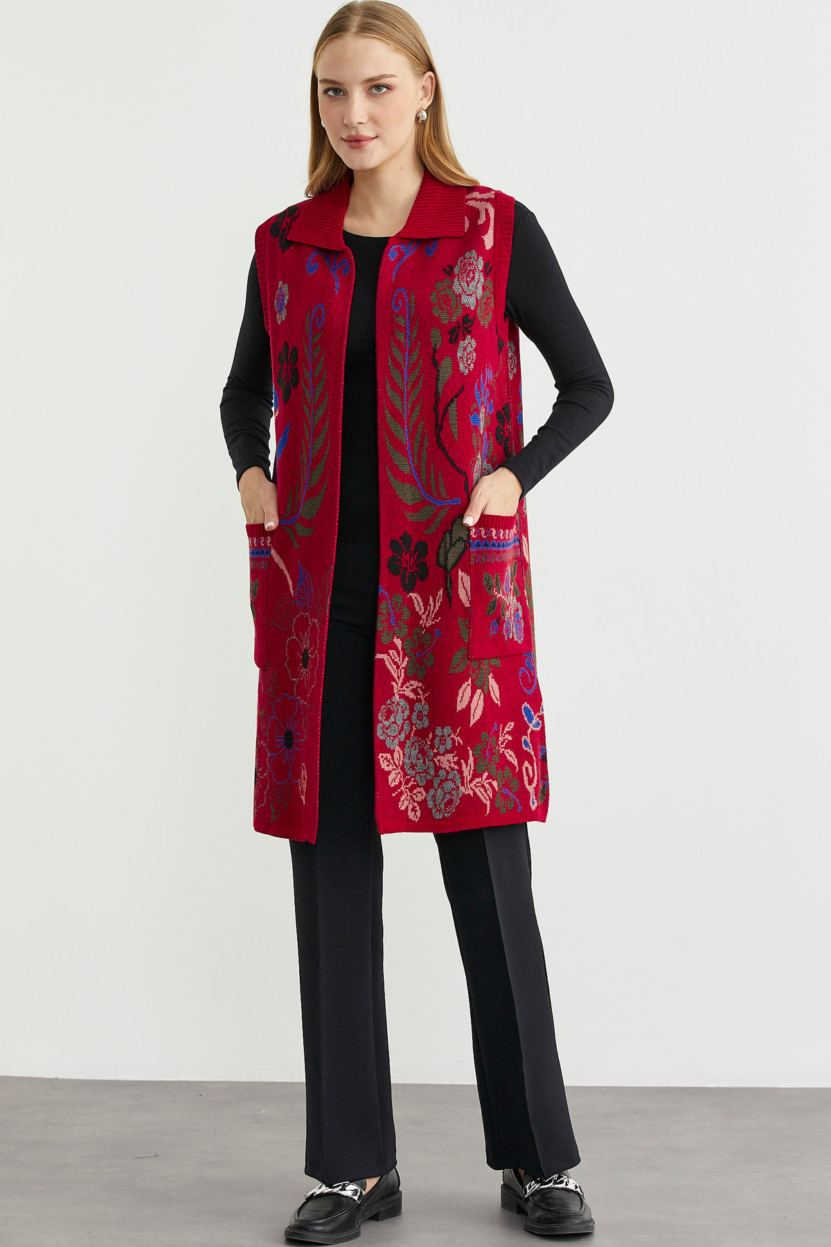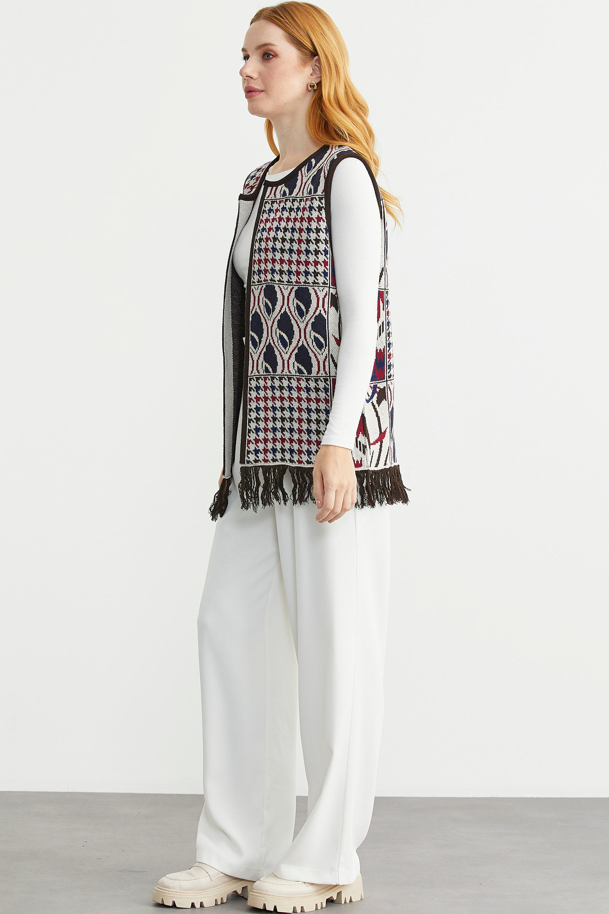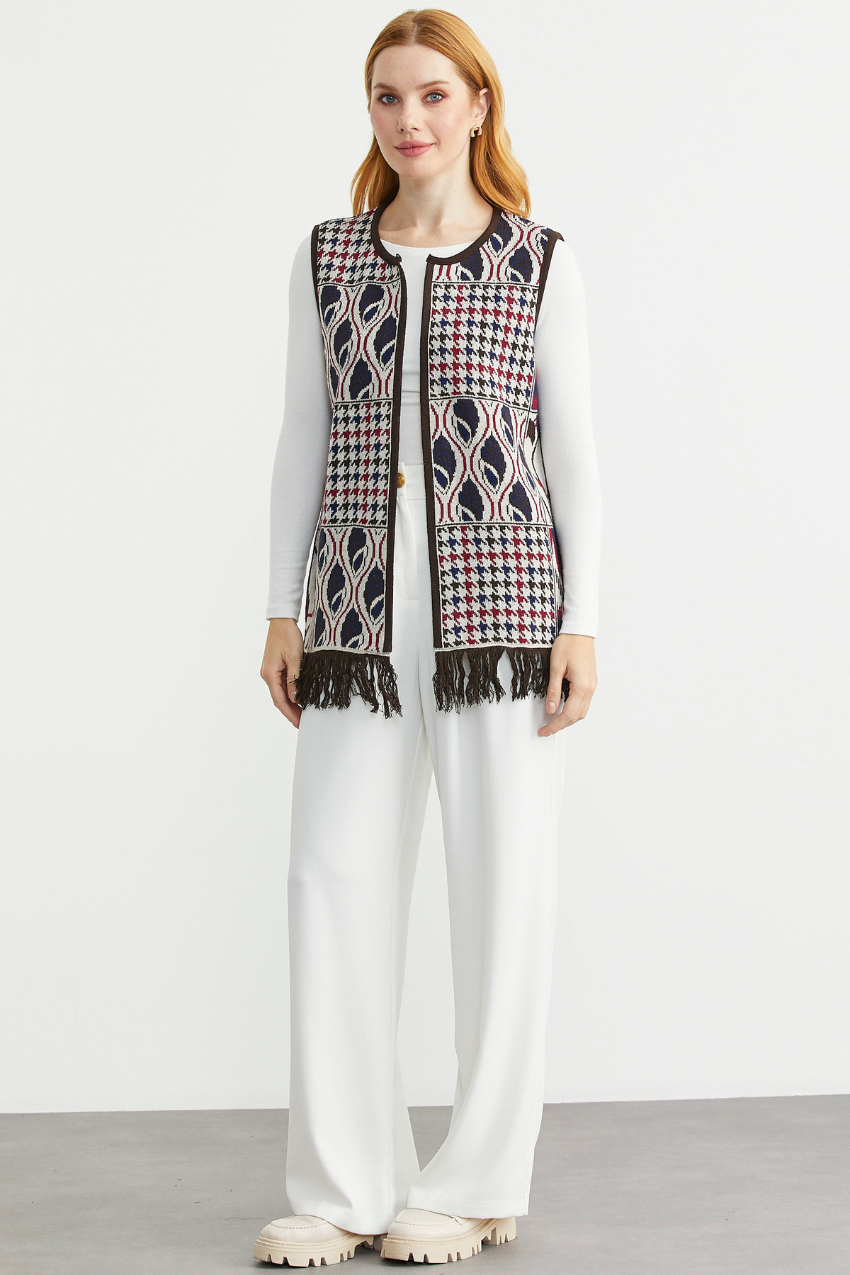 Desenli Bohem Yünlü Triko Yelek - Taş Desenli Bohem Yünlü Triko Yelek - Taş 25K2133-34543.0001 XL