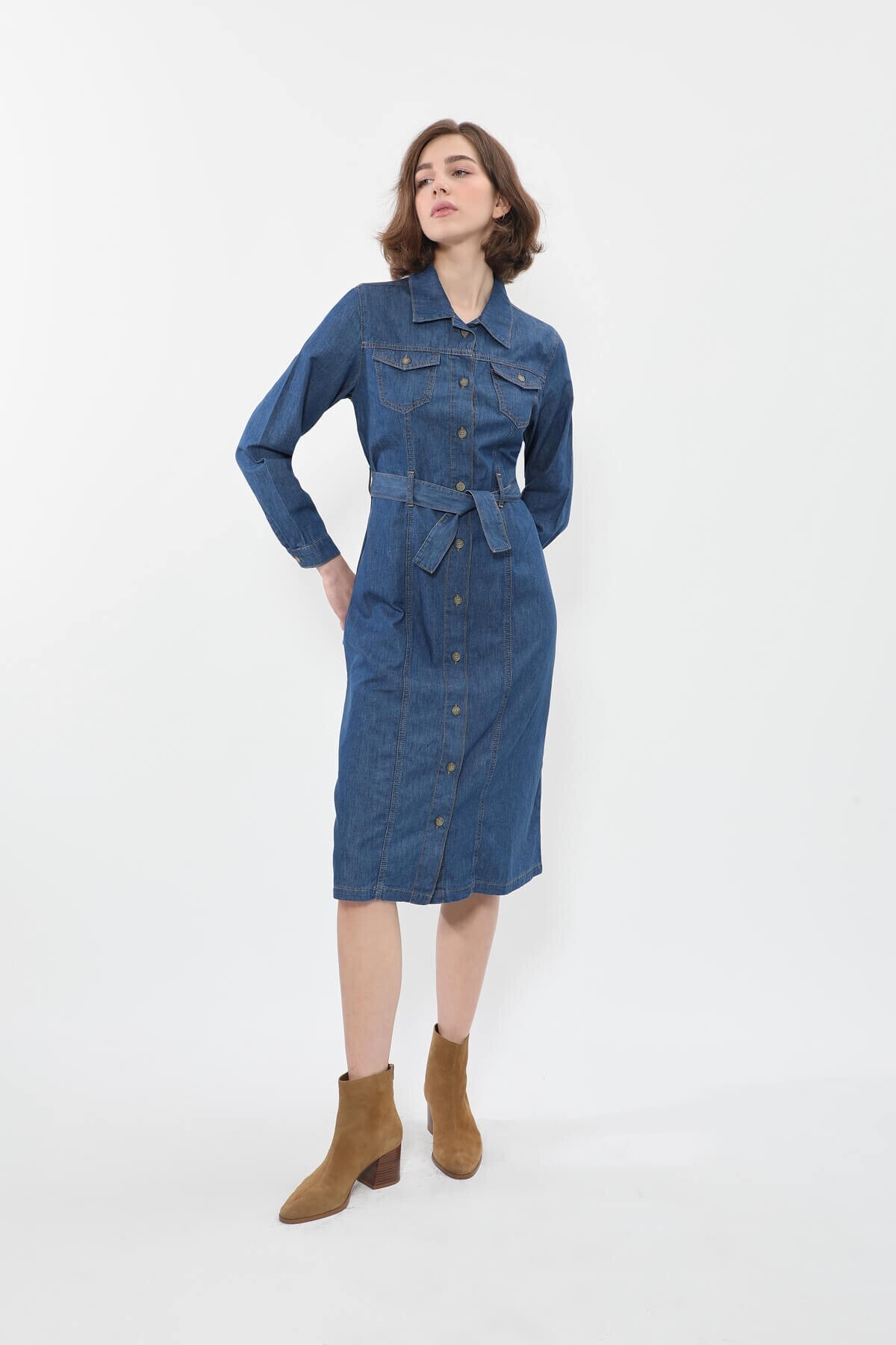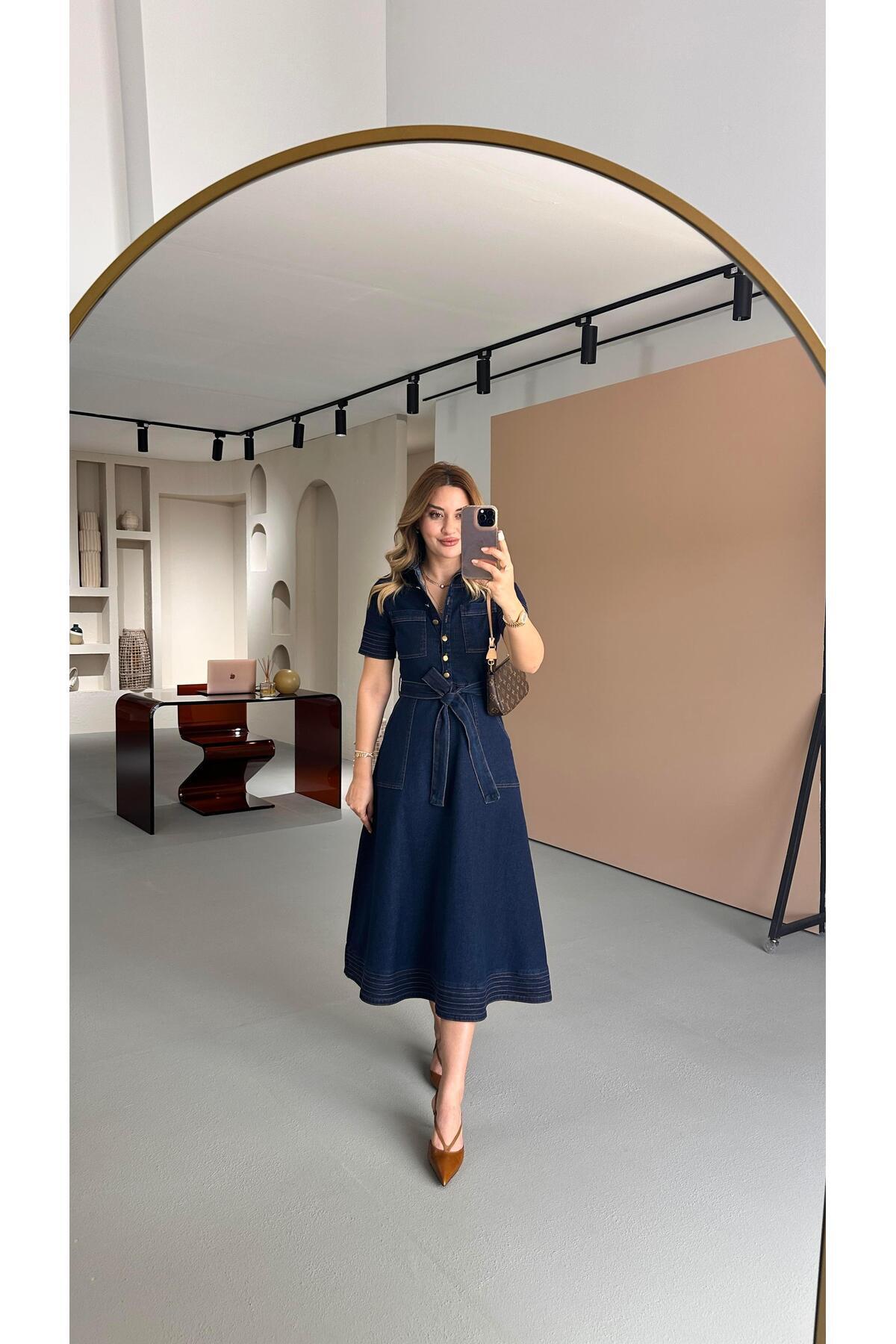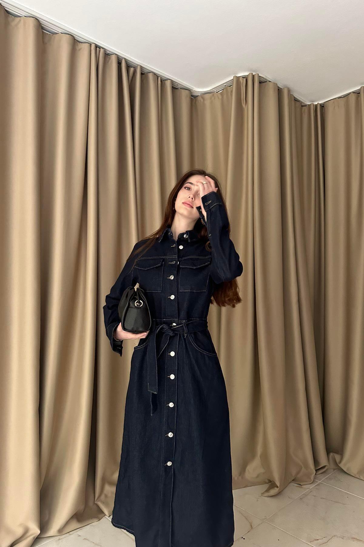 Boydan Düğmeli Cepli Kuşaklı Denim Elbise Boydan Düğmeli Cepli Kuşaklı Denim Elbise PYB003.000000446 L