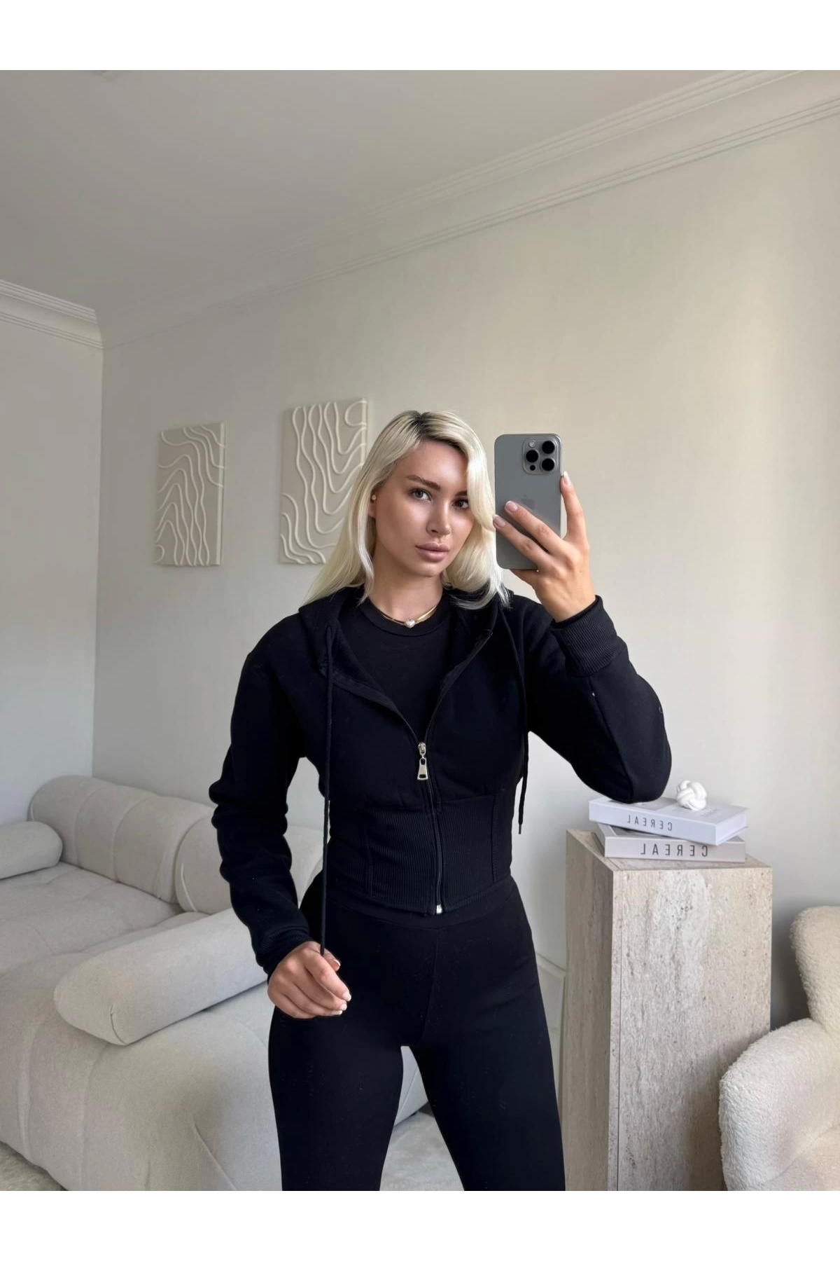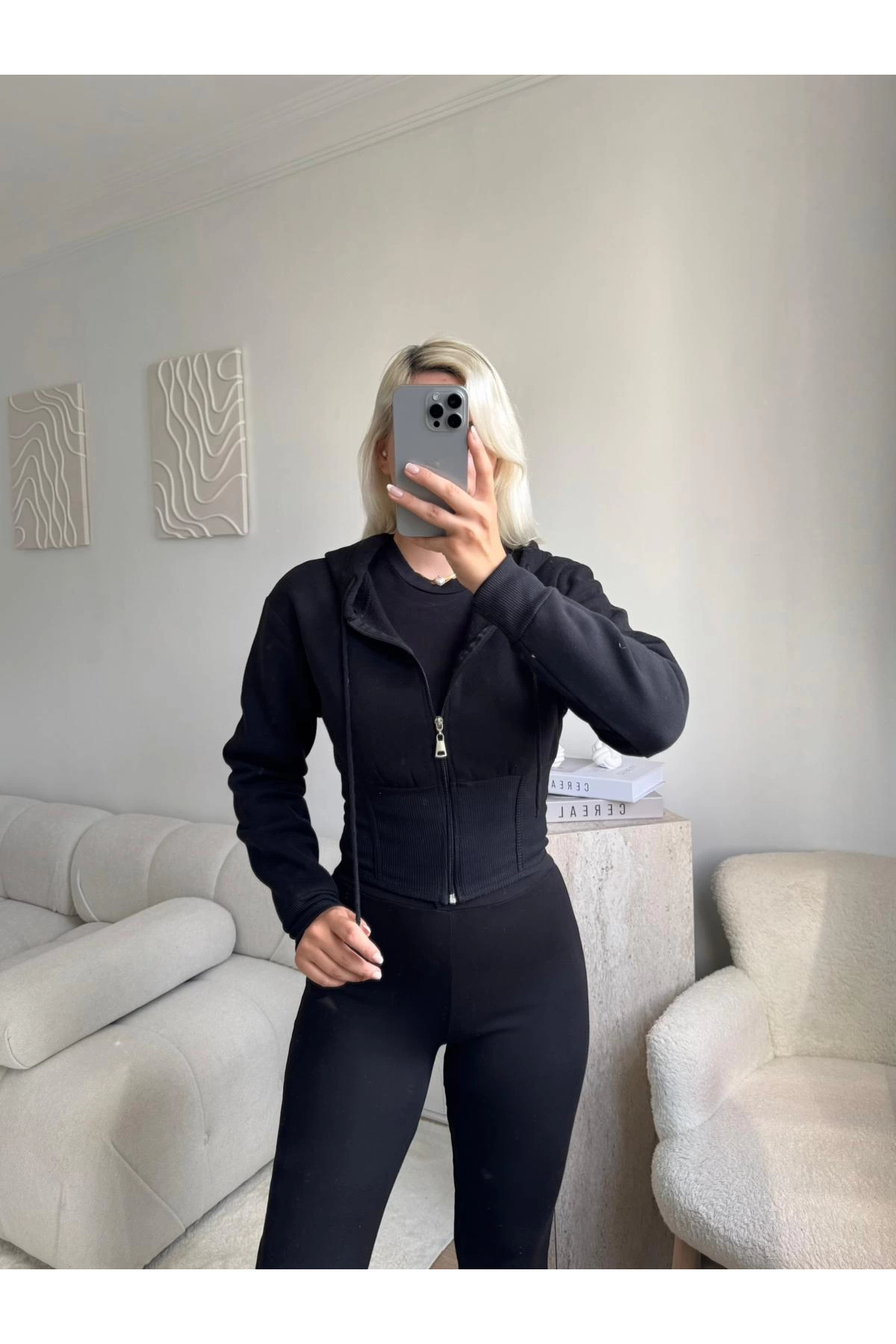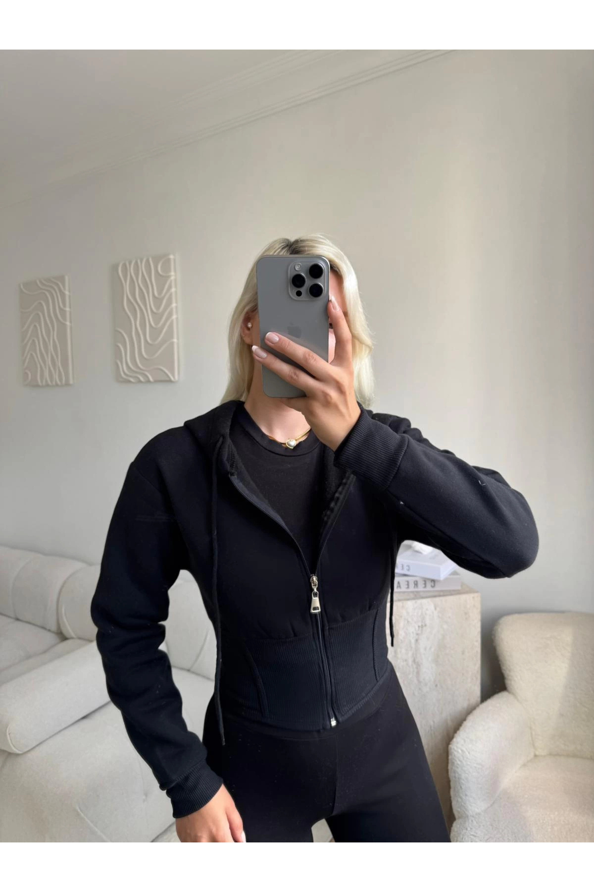Bel Korse Kapşonlu Hırka - SİYAH Bel Korse Kapşonlu Hırka - SİYAH P3548S6449 XL