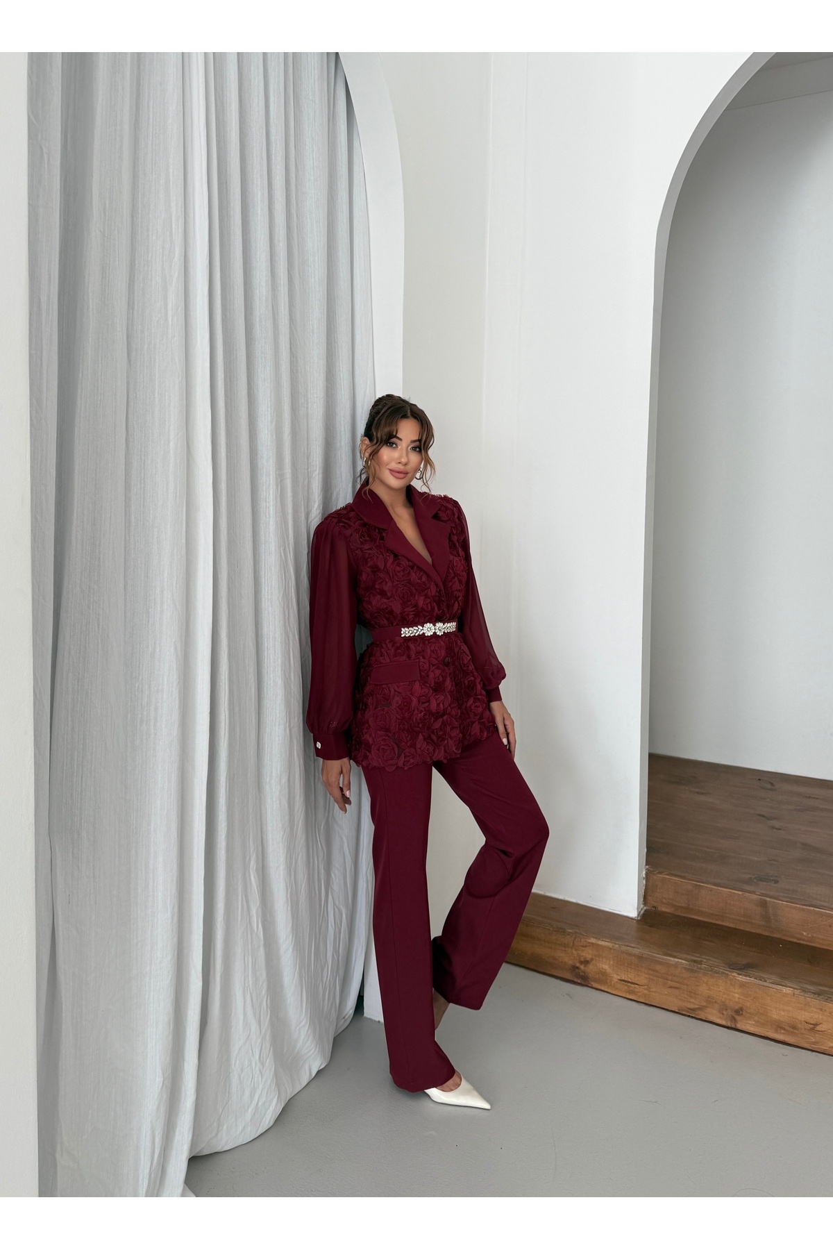 Kadın İthal Kumaştan Üst Gül Desenli Kollar Şifon Taşlı Kemer Detaylı Astarlı Özel Tasarım Takım Kadın İthal Kumaştan Üst Gül Desenli Kollar Şifon Taşlı Kemer Detaylı Astarlı Özel Tasarım Takım 2608TKM 2XL