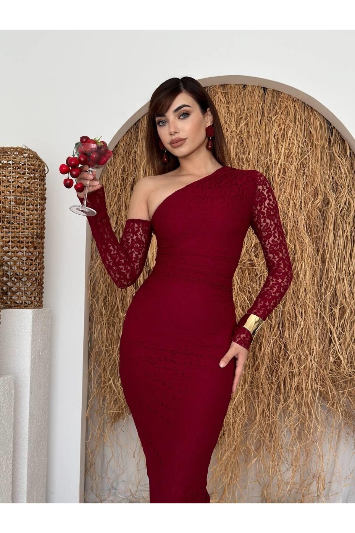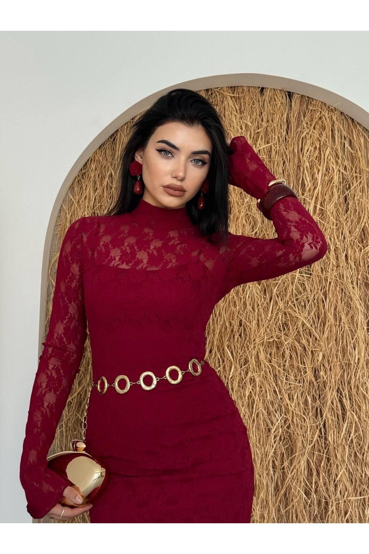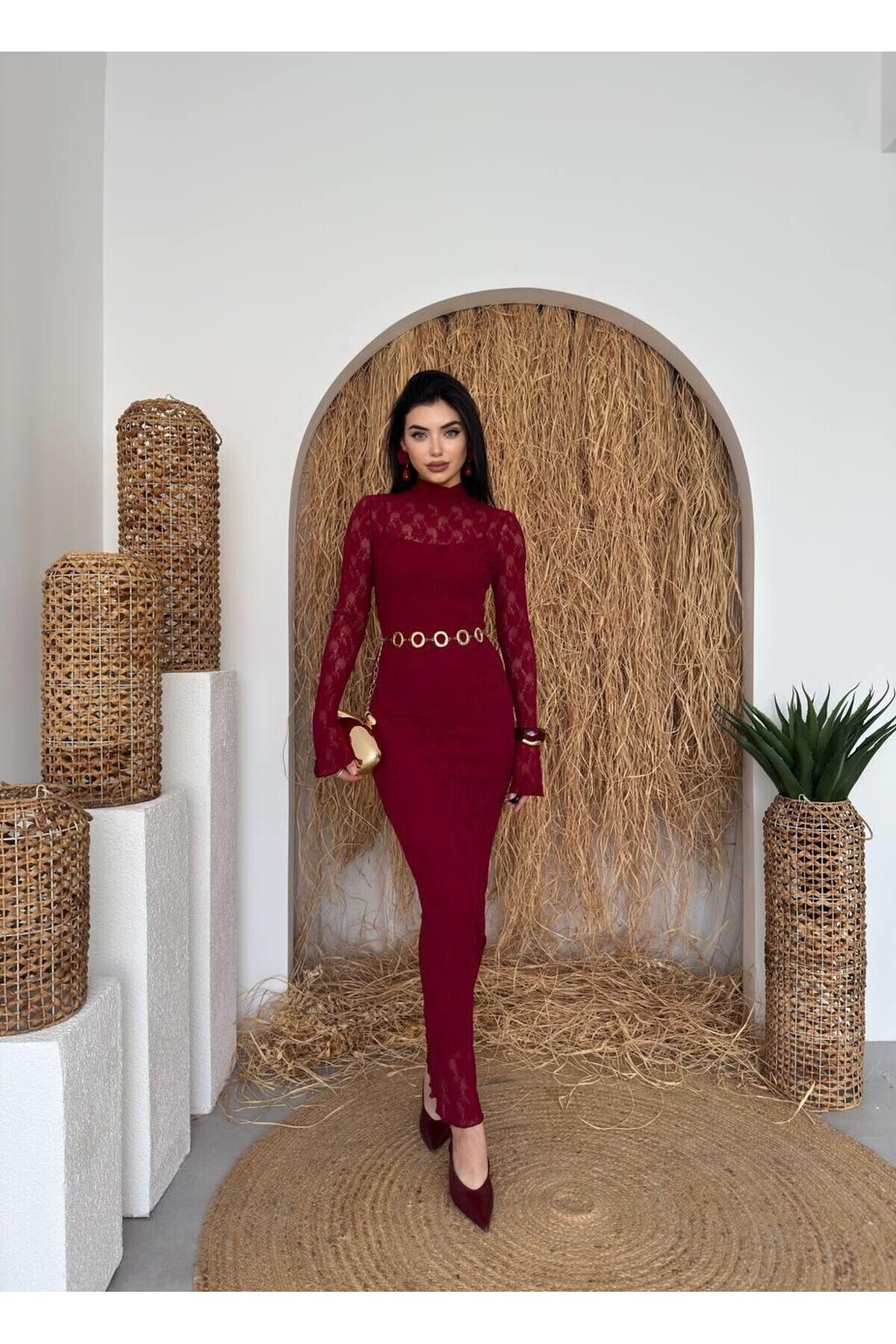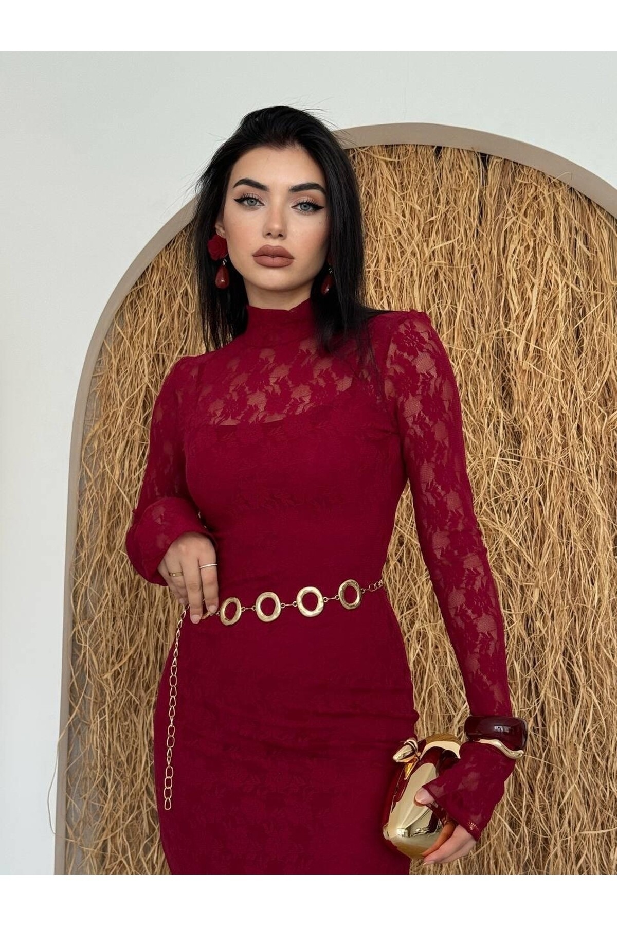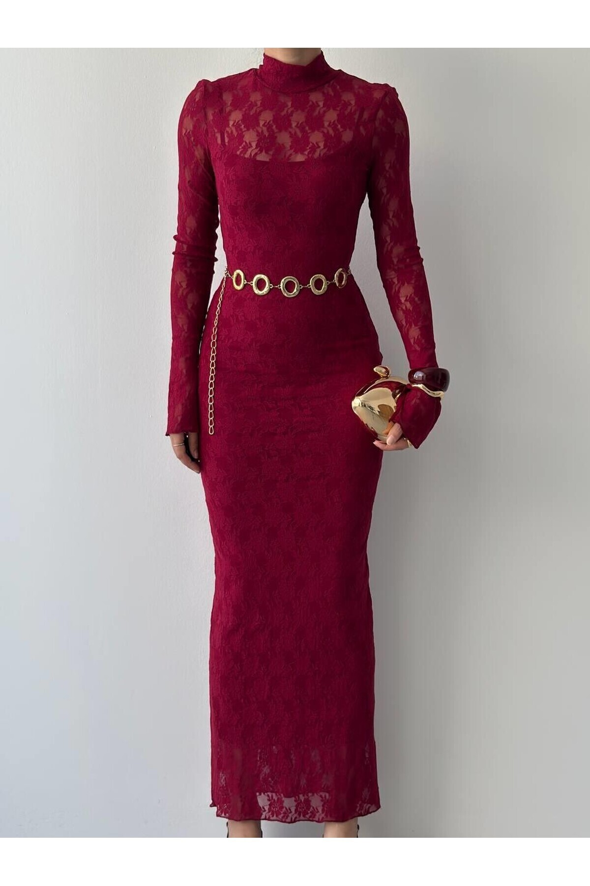 Bordo Dik Yaka Astarlı Maxi Uzun Premium Dantel Elbise Bordo Dik Yaka Astarlı Maxi Uzun Premium Dantel Elbise JD26DNT1050 L