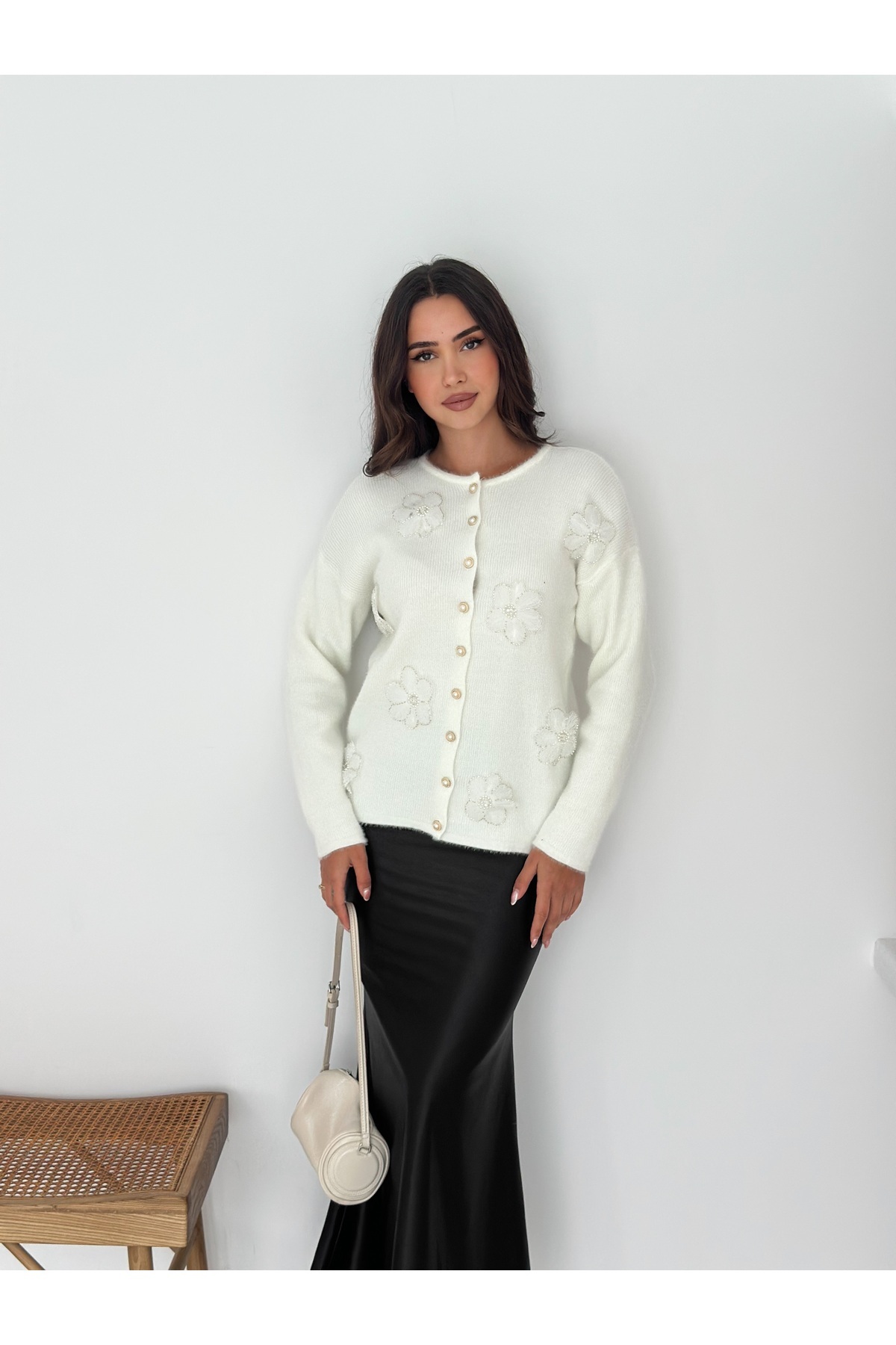 İnci Düğmeli Papatya İşlemeli Kadın Ekru Triko Hırka İnci Düğmeli Papatya İşlemeli Kadın Ekru Triko Hırka BRNTHRK0004 Standart