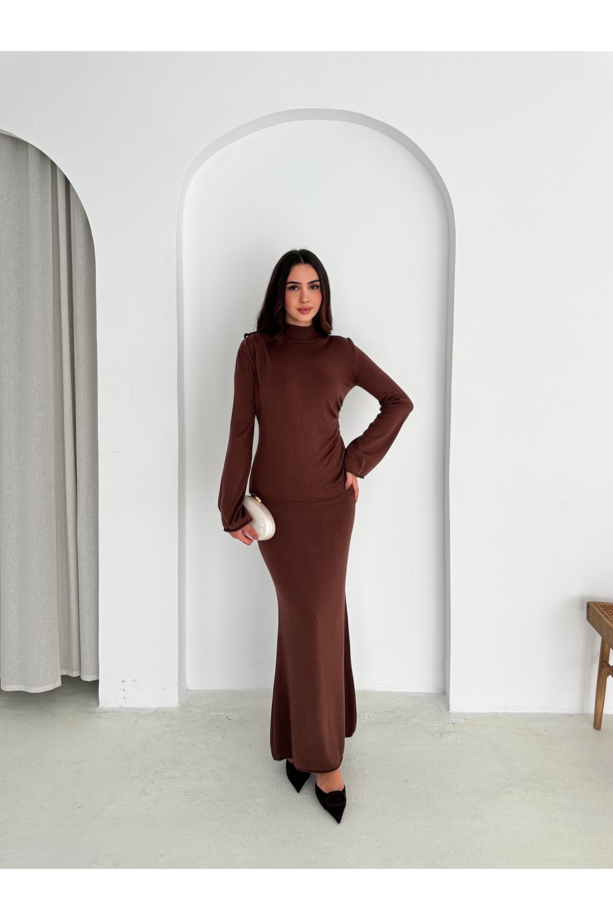 Uzun Kollu Cepli Düğme Detaylı Kadın Bej Triko Uzun Etekli Takım Uzun Kollu Cepli Düğme Detaylı Kadın Bej Triko Uzun Etekli Takım BRNTTKM0002