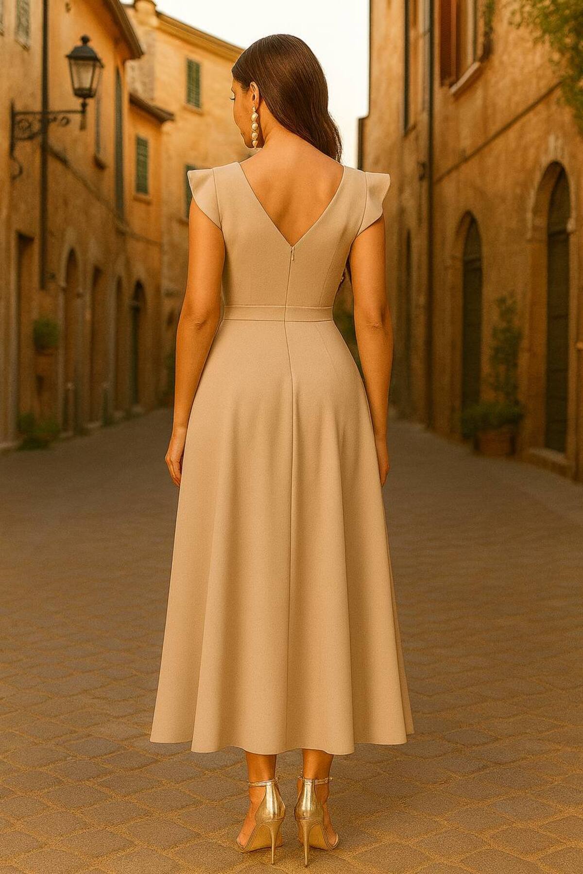 Omzu Fırfırlı Volanlı Drapeli Midi Boy Abiye Elbise Omzu Fırfırlı Volanlı Drapeli Midi Boy Abiye Elbise HB-000333 L/XL