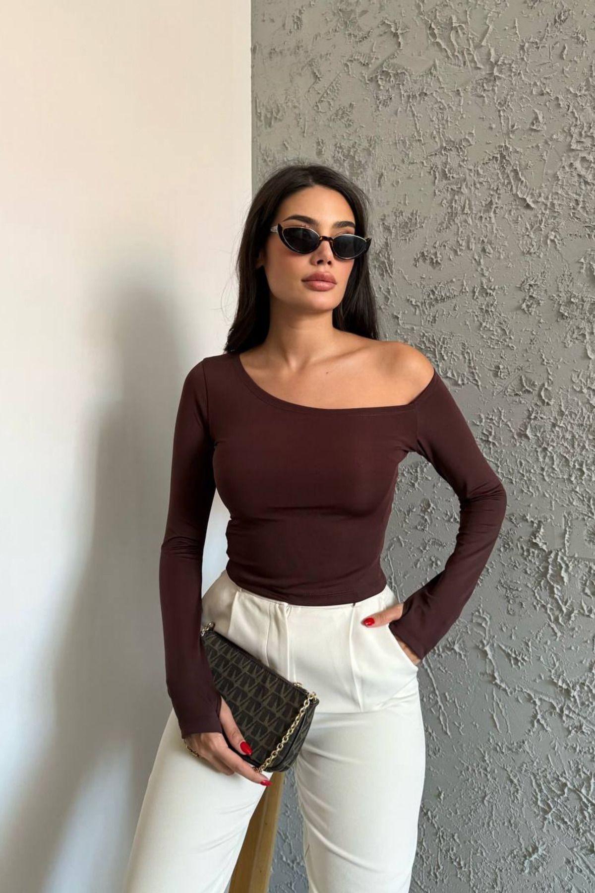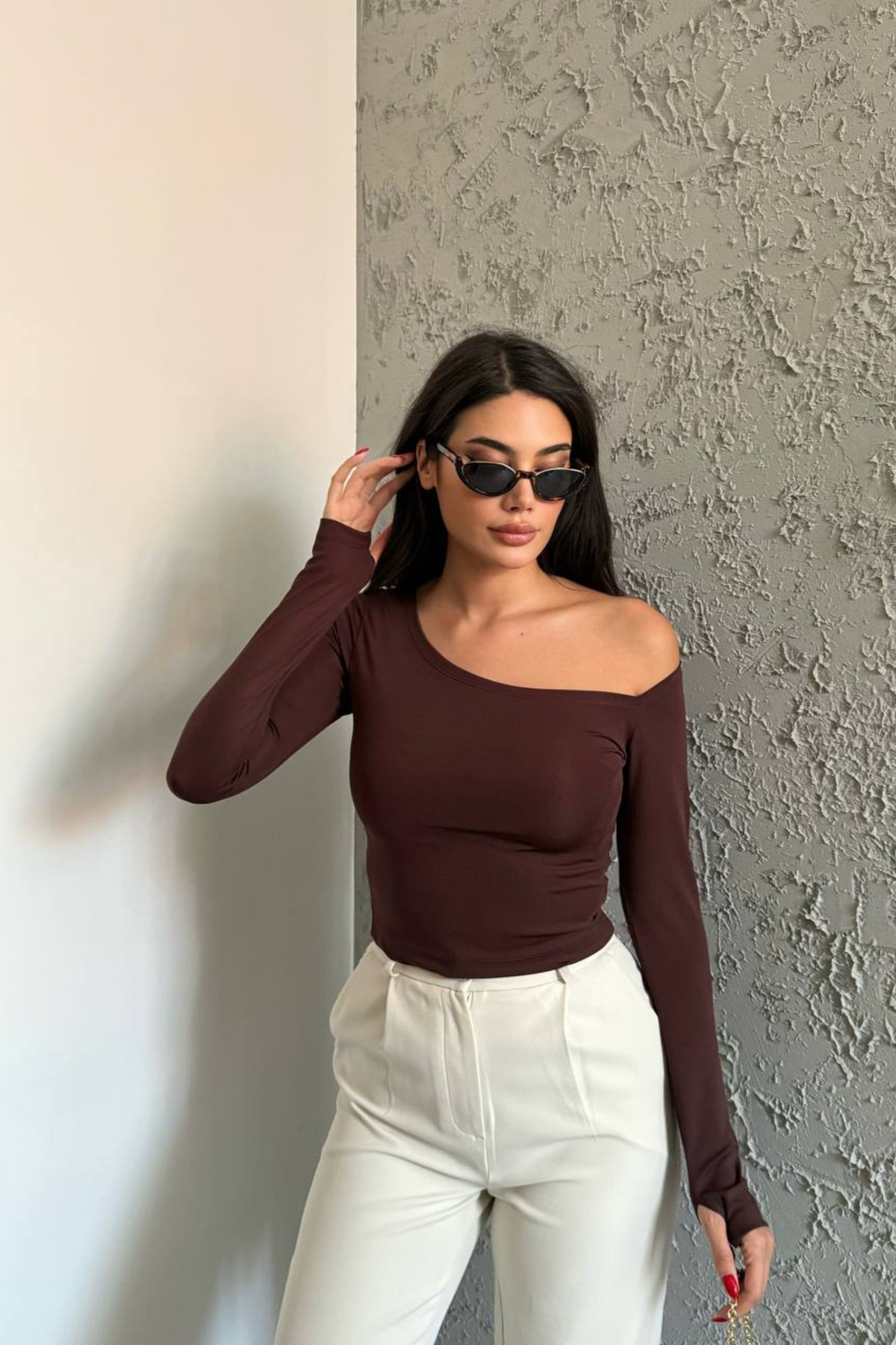 Kahverengi – Asimetrik Kesim Parmak Geçirme Detaylı Bluz Kahverengi – Asimetrik Kesim Parmak Geçirme Detaylı Bluz 12111 L