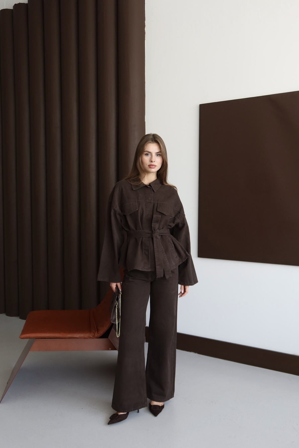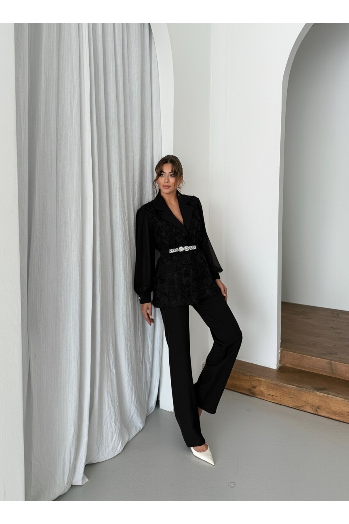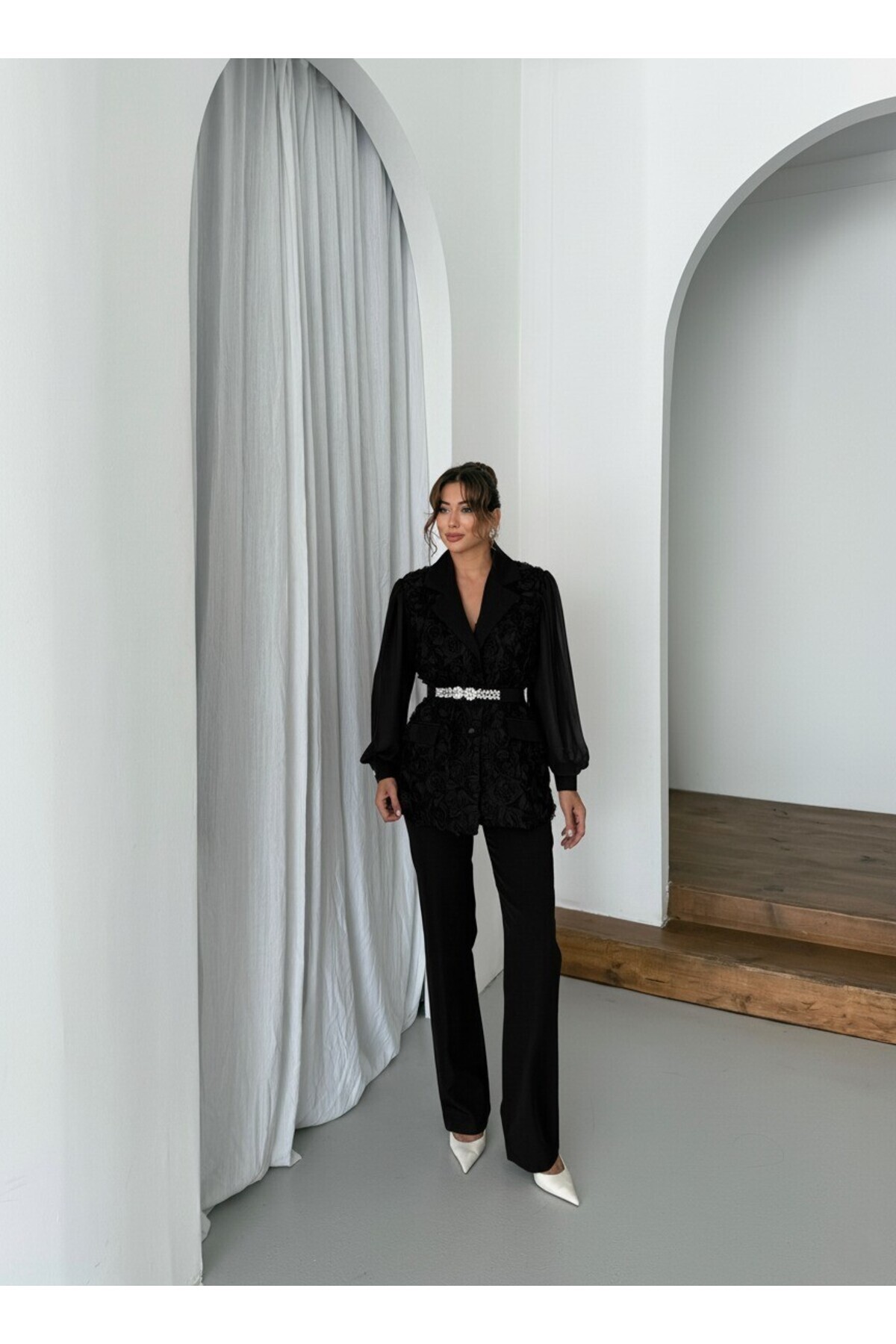 Kadın Gül Desenli Ceket Kollar Şifon Taş Kemer Şık Alt Üst Takım Kadın Gül Desenli Ceket Kollar Şifon Taş Kemer Şık Alt Üst Takım 2608Nshiq 2XL
