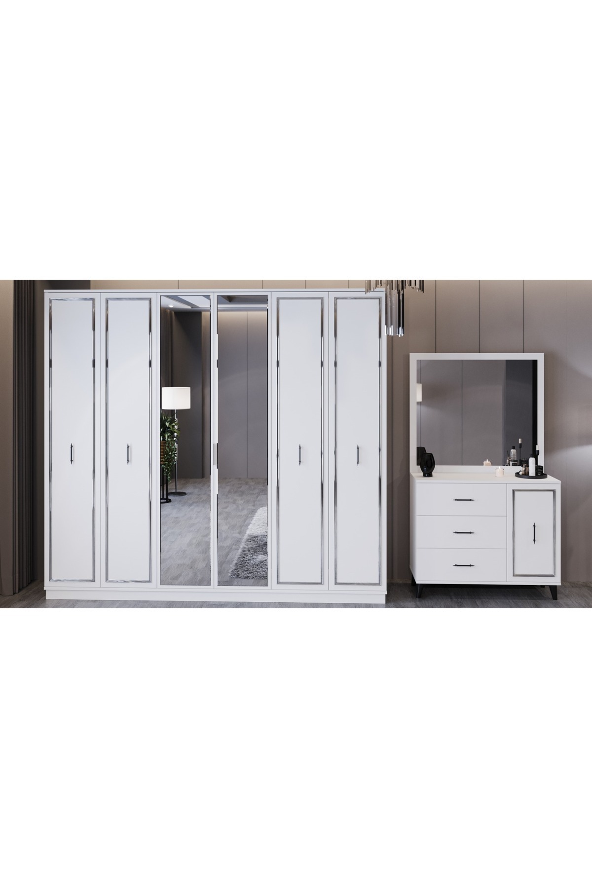 - تنظیم محتوا : Karyola + 2 Komodin + Şifonyer + Gardırop + Ayna
