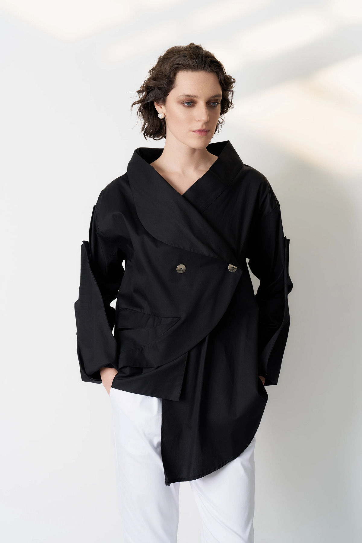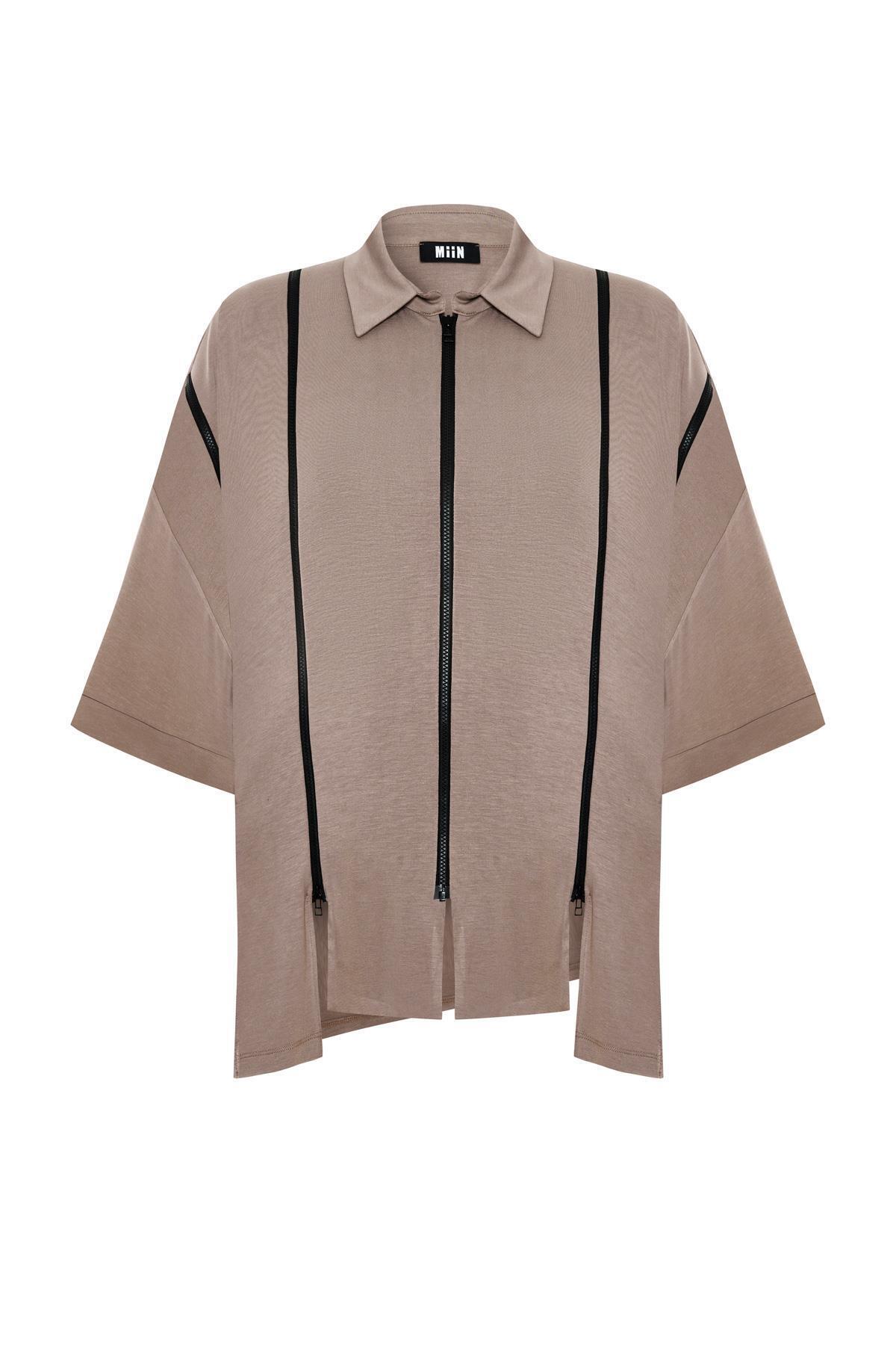 BEYAZ ASİMETRİK KESİM SİYAH FERMUAR DETAYLI KADIN GÖMLEK BEYAZ ASİMETRİK KESİM SİYAH FERMUAR DETAYLI KADIN GÖMLEK AW25-1003 M
