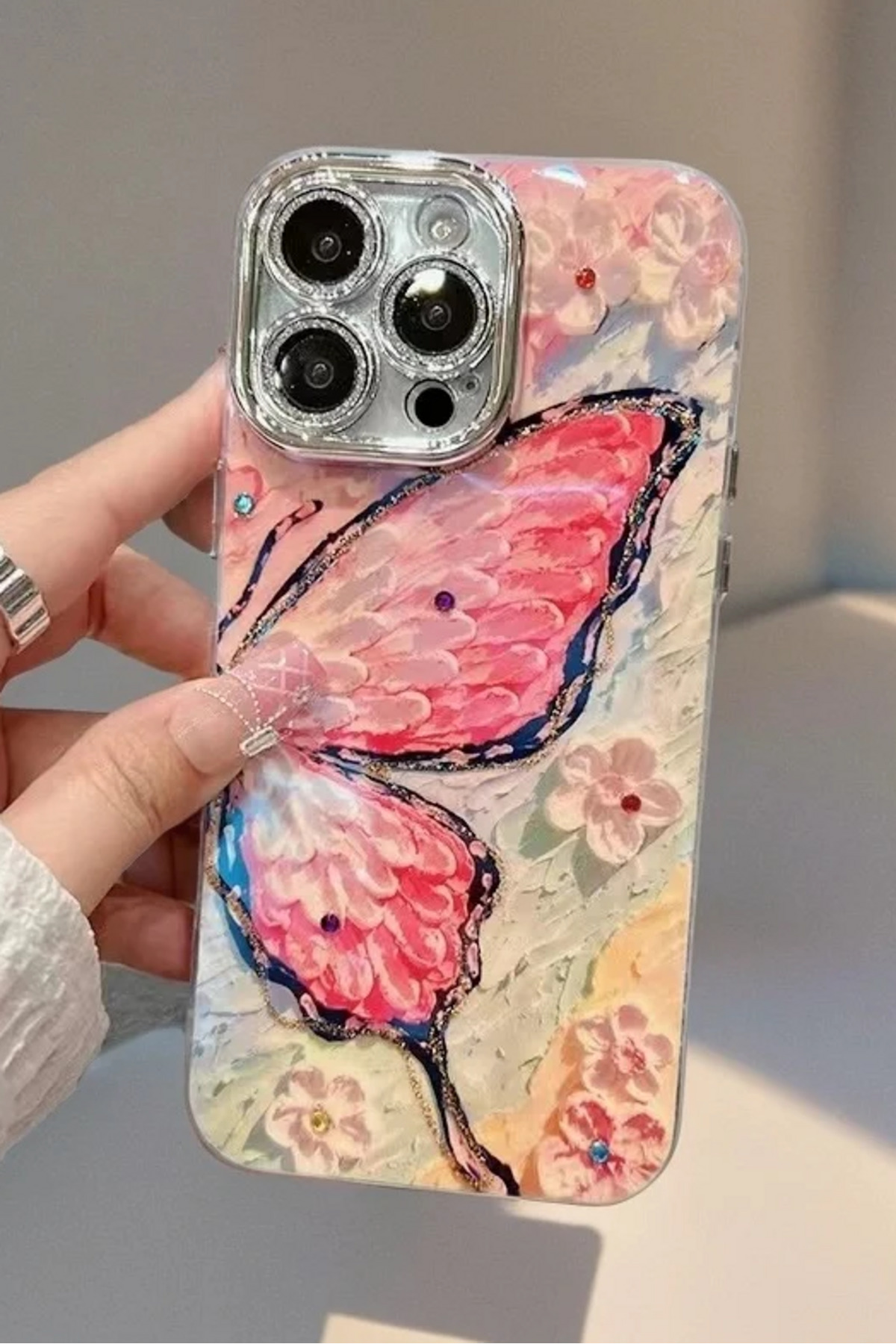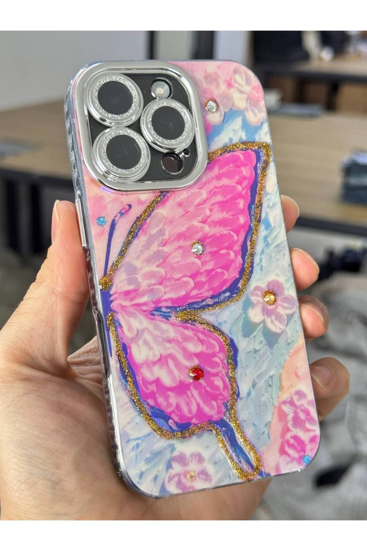 iPhone 15 Kılıf Renk Geçişli Taşlı Kamera Lens Korumalı Simli Pembe Kelebek Desenli Darbe Emici iPhone 15 Kılıf Renk Geçişli Taşlı Kamera Lens Korumalı Simli Pembe Kelebek Desenli Darbe Emici FIGURLU IPHONE 15 تک سایز