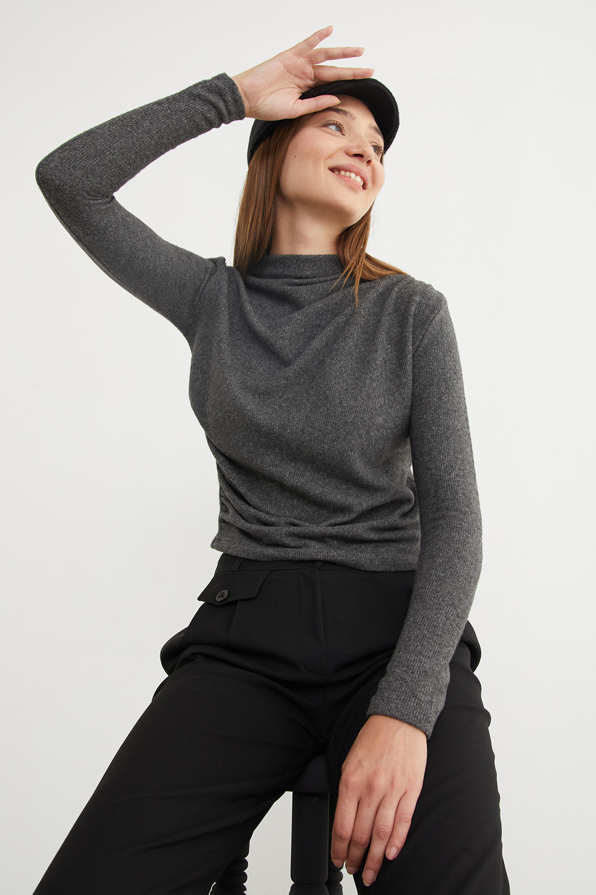 Yanı Drapeli Dik Yaka Triko Bluz Yanı Drapeli Dik Yaka Triko Bluz 26KGB4430133555 XL