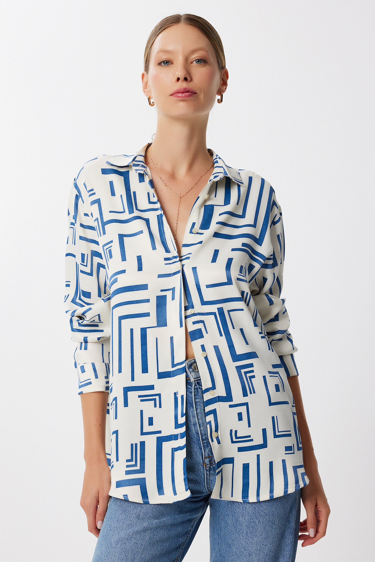 Desenli Oversize Saten Yüzeyli Gömlek LMX0113 KEMİK SİYAH Desenli Oversize Saten Yüzeyli Gömlek LMX0113 KEMİK SİYAH 40