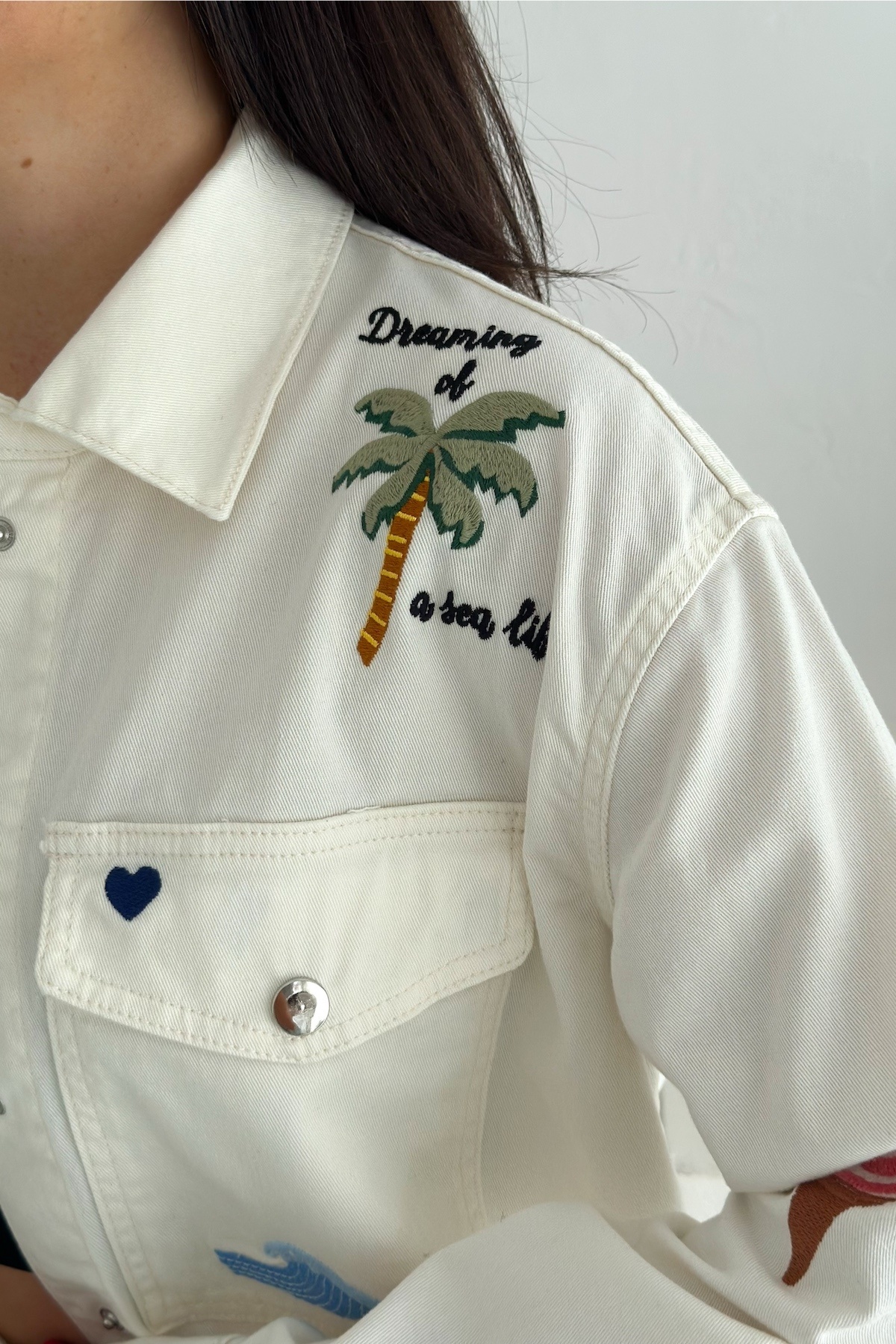 Krem Tropikal Nakışlı İşlemeli Kot Jean Ceket - Çıtçıt Düğmeli Krem Tropikal Nakışlı İşlemeli Kot Jean Ceket - Çıtçıt Düğmeli ckt11 L