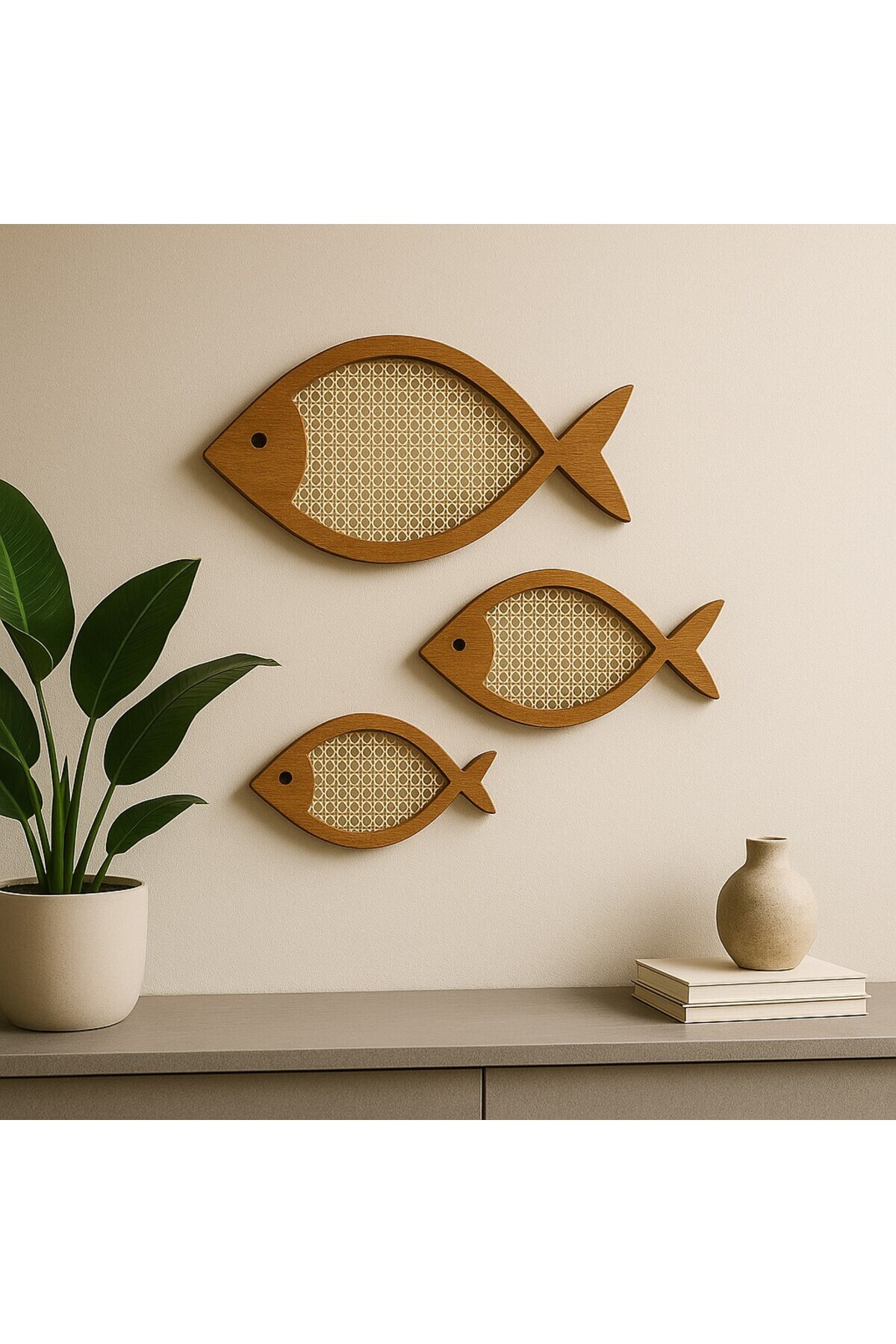 Minimalist Ahşap & Hasır Üçlü Balık Duvar Dekoru Minimalist Ahşap & Hasır Üçlü Balık Duvar Dekoru TRİO3232 تک سایز