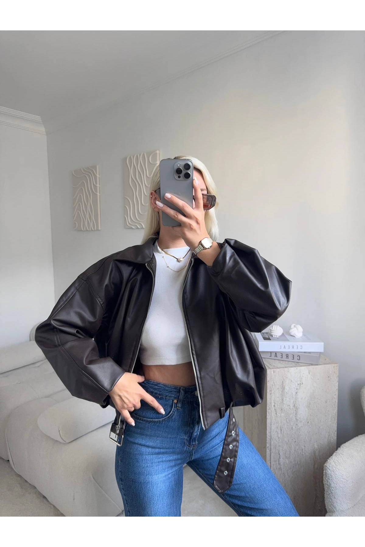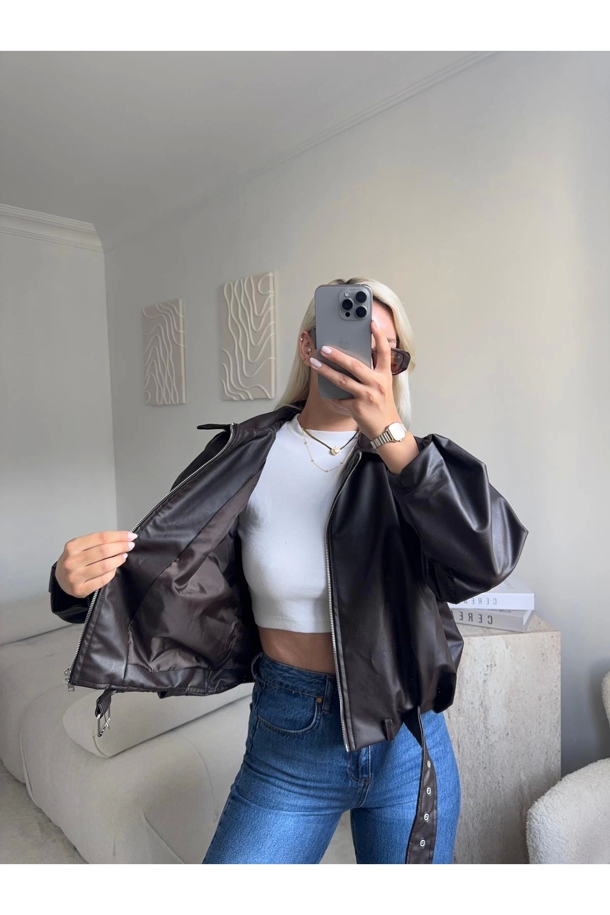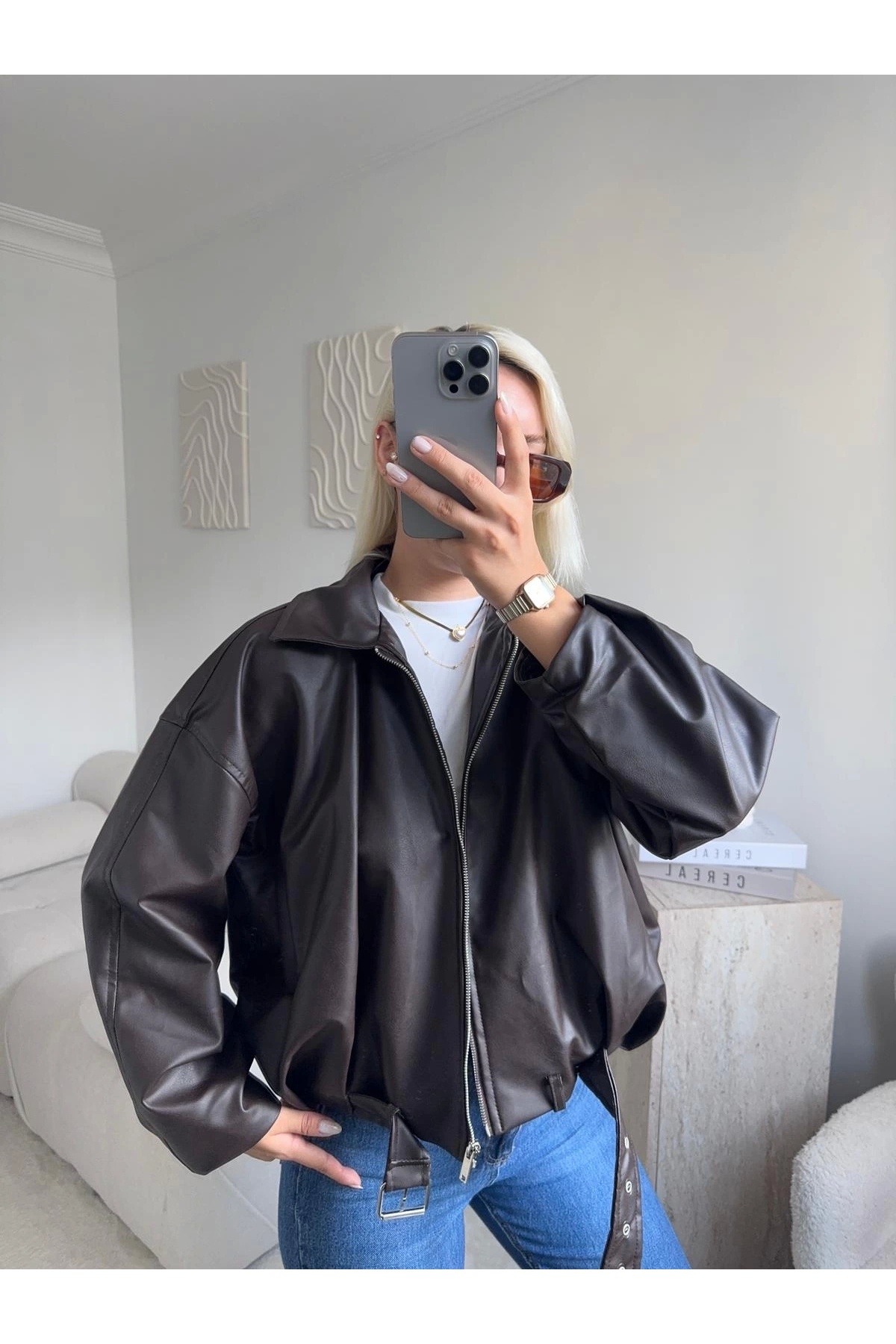 Kemerli Oversize Deri Ceket - ACI KAHVE Kemerli Oversize Deri Ceket - ACI KAHVE P3593S6894 XL