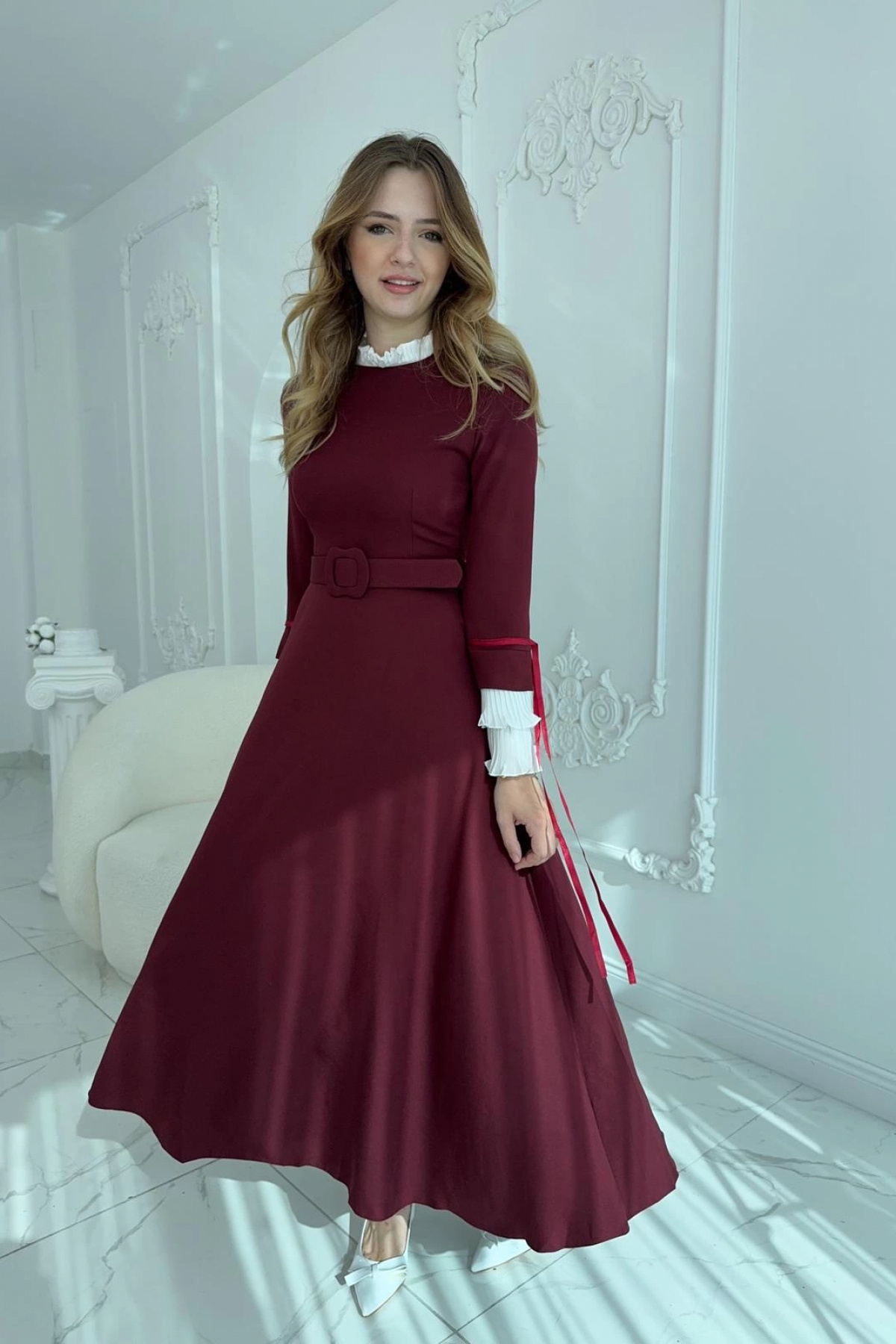 Pliseli Kol Detaylı Kemerli Dokuma Bordo Elbise Pliseli Kol Detaylı Kemerli Dokuma Bordo Elbise 8201 L