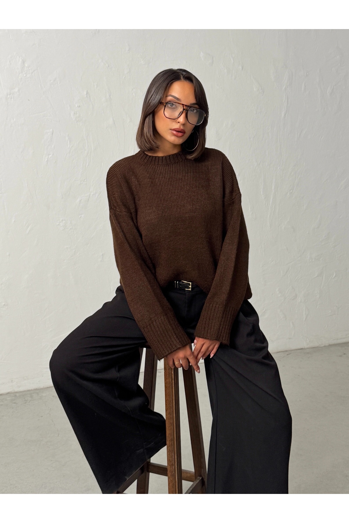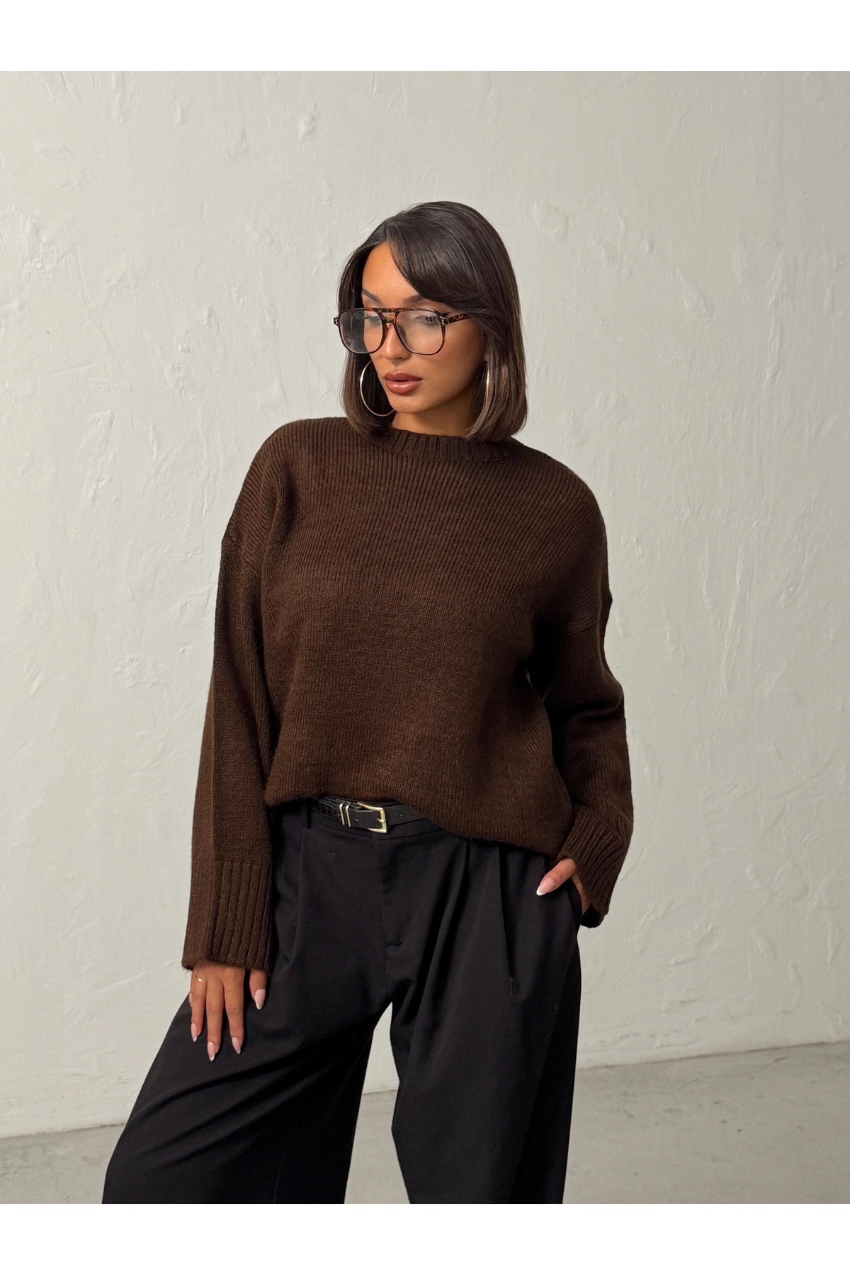 Kadın Kahverengi Yumuşak Dokulu Bisiklet Yaka Oversize Basic Triko Kazak Kadın Kahverengi Yumuşak Dokulu Bisiklet Yaka Oversize Basic Triko Kazak BJN653 M/L