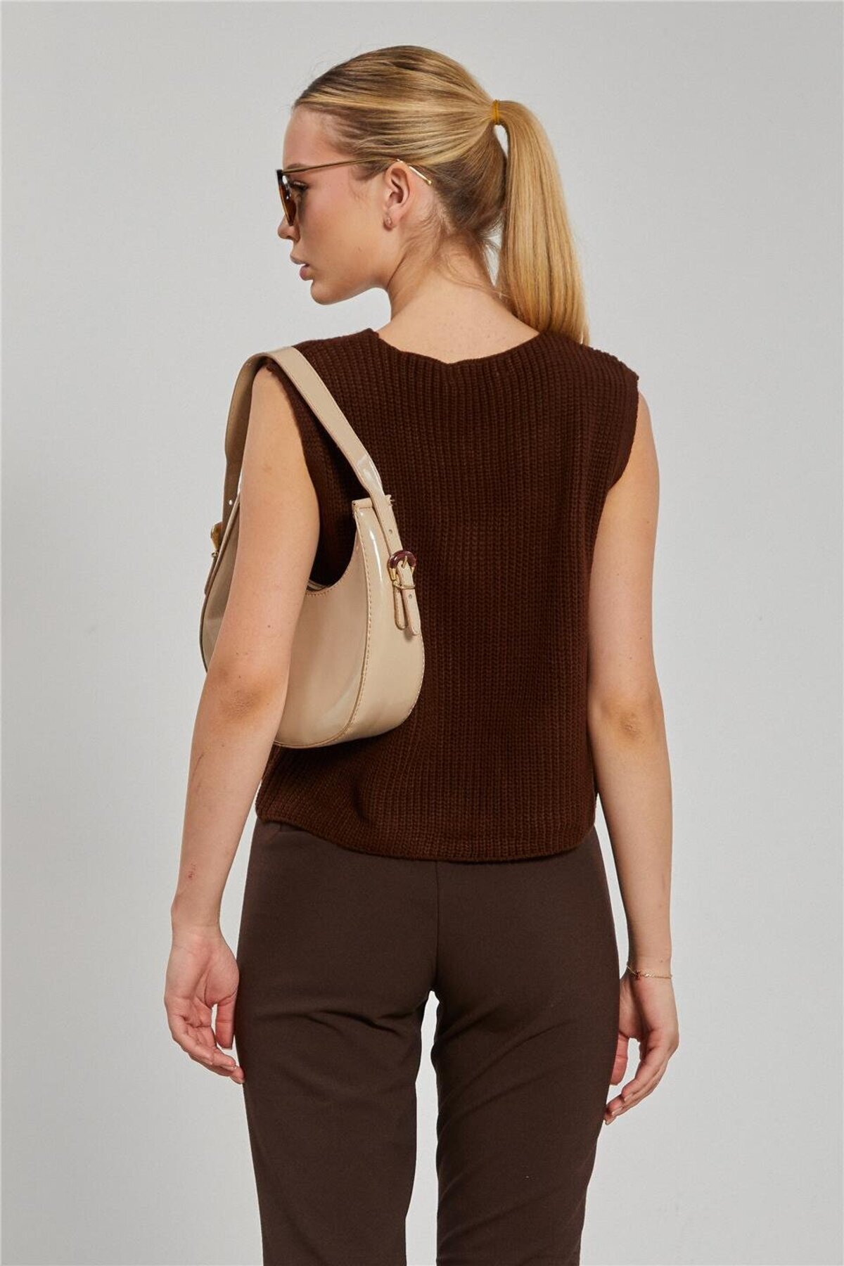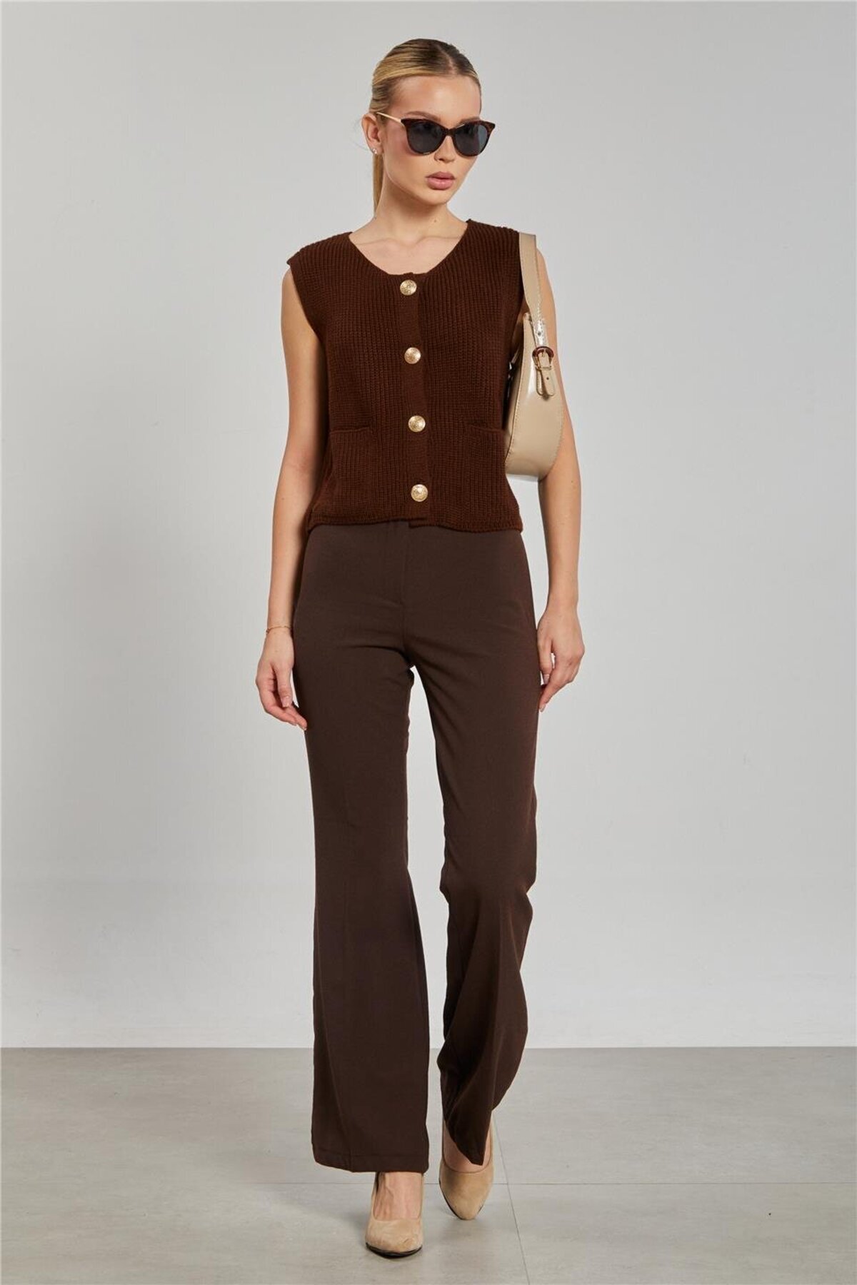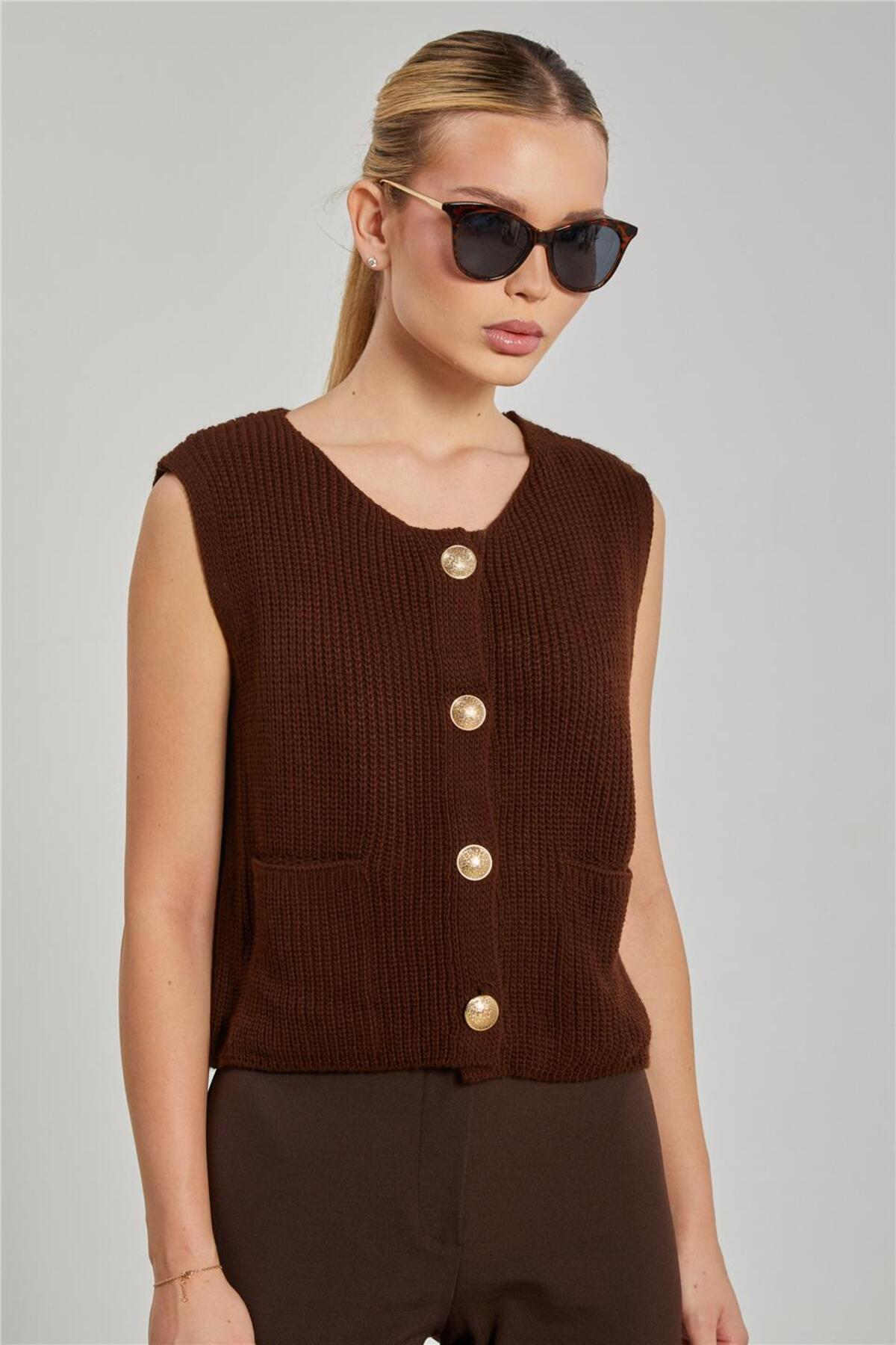Kadın Cepli Düğmeli Triko Yelek - Kahve Kadın Cepli Düğmeli Triko Yelek - Kahve 274-25K11001 Standart
