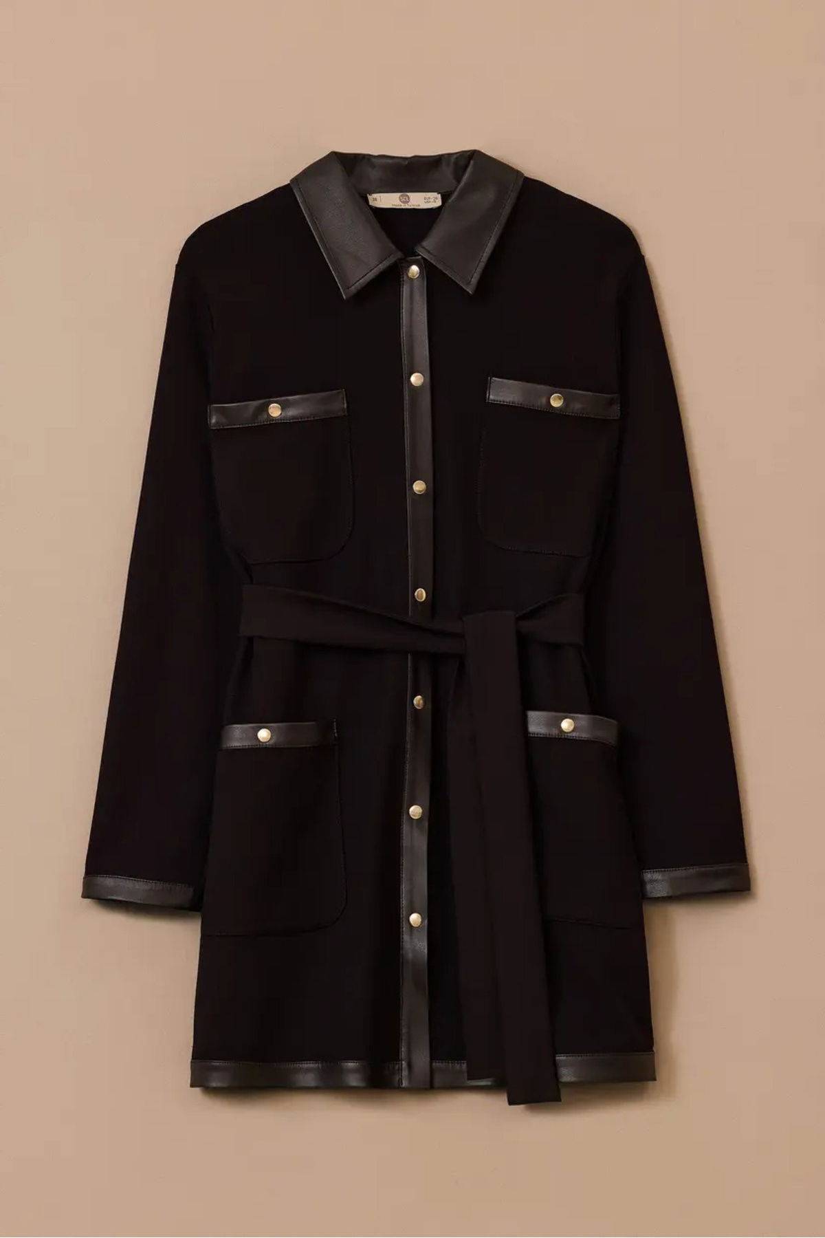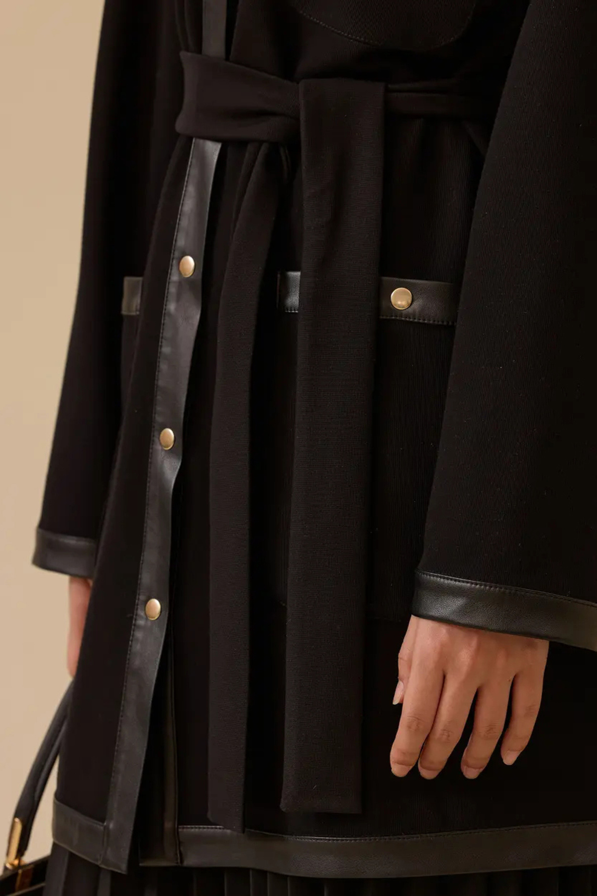 Kadın Kuşaklı Suni Deri Garnili Düğmeli Ceket - Siyah Kadın Kuşaklı Suni Deri Garnili Düğmeli Ceket - Siyah 10002521111007 XL