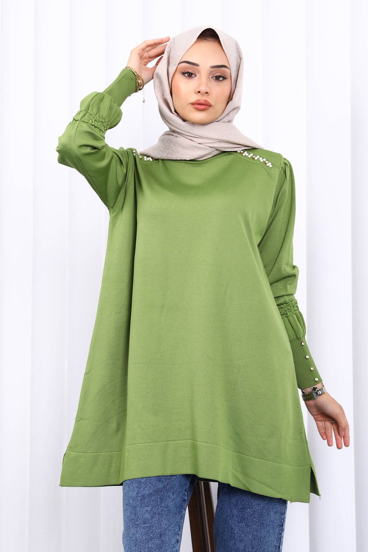 Yağ Yeşili Omuz Taşlı Soguk İplik Triko Tunik Yağ Yeşili Omuz Taşlı Soguk İplik Triko Tunik IMJ007454 Standart