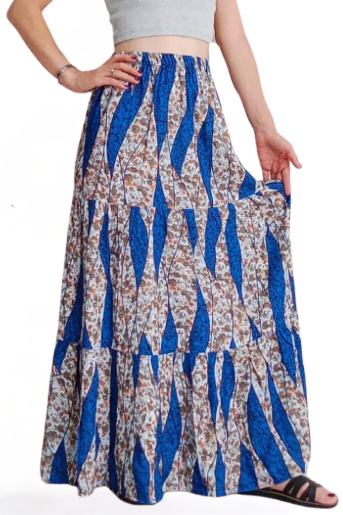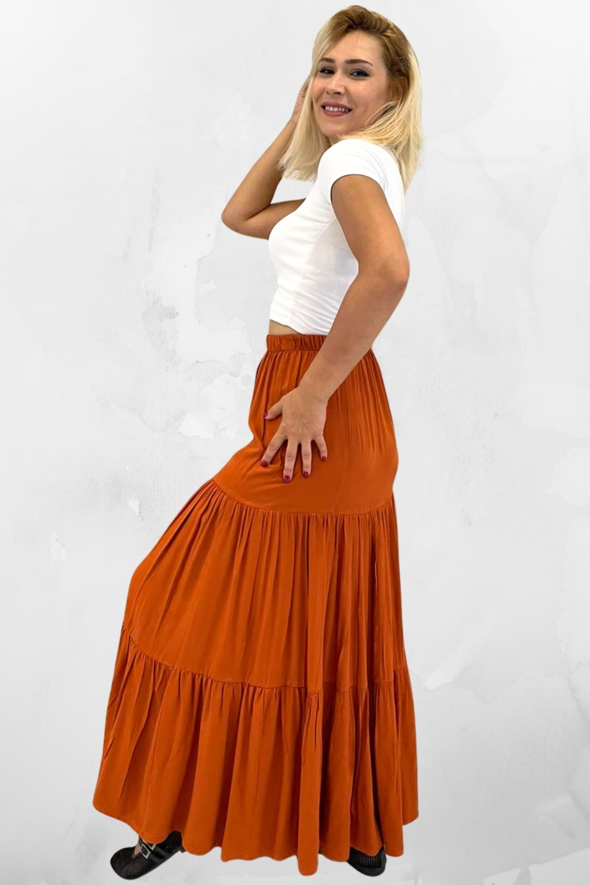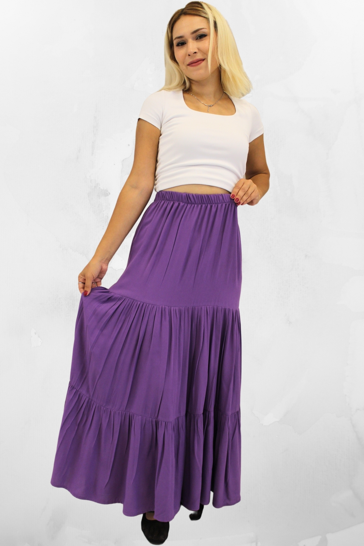 RAHAT KESİM VİSKON KUMAŞ BELİ LASTİKLİ FIRFIRLI UZUN KADIN ÇİNGENE ETEK RAHAT KESİM VİSKON KUMAŞ BELİ LASTİKLİ FIRFIRLI UZUN KADIN ÇİNGENE ETEK MAKUZN50 42