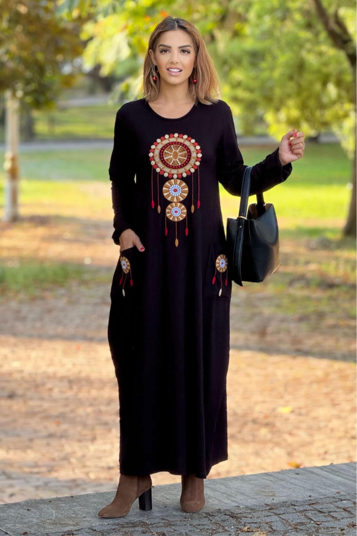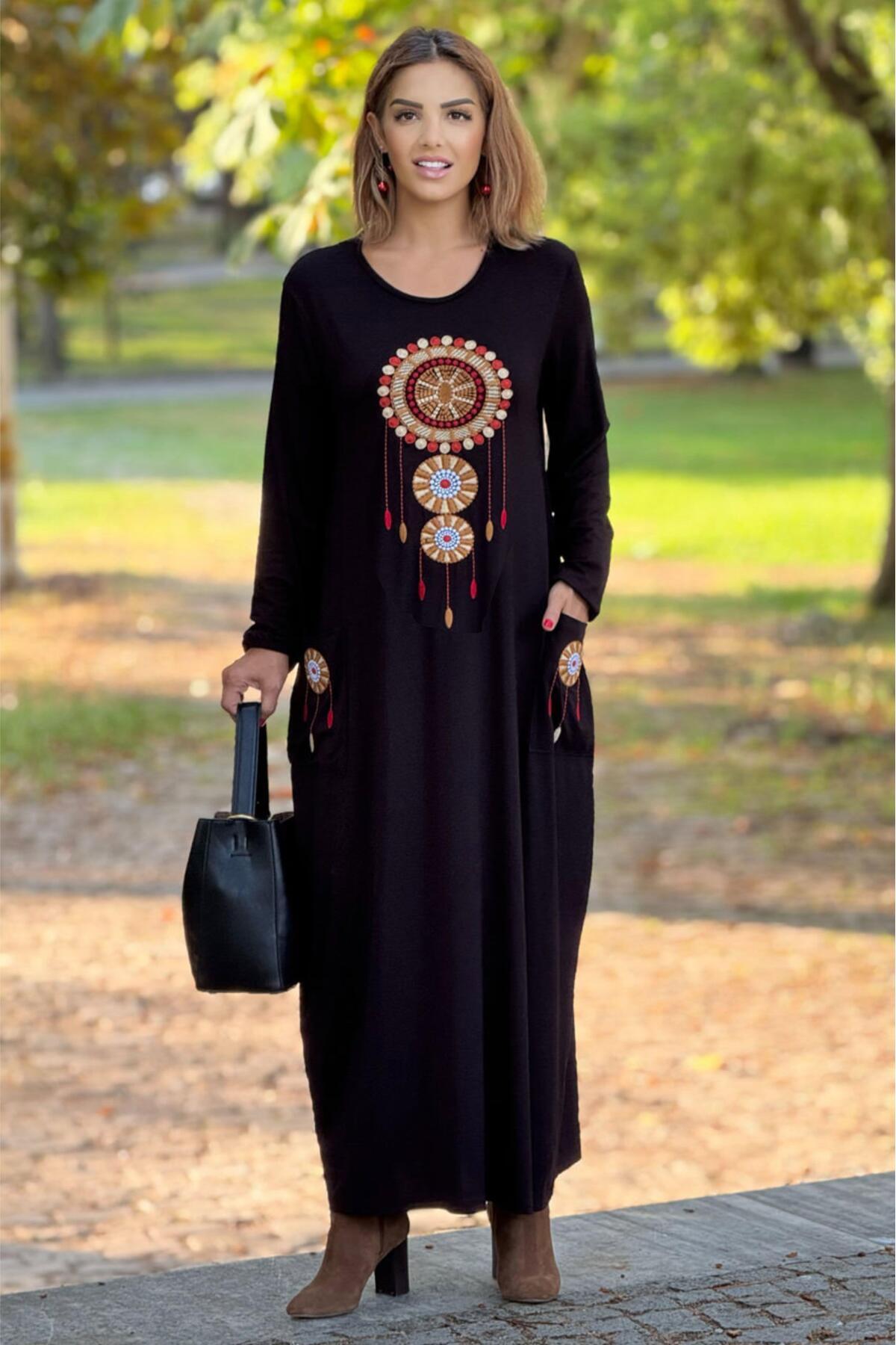 Siyah Düş Kapanı Nakışlı Pamuklu Penye Viskon Elbise Siyah Düş Kapanı Nakışlı Pamuklu Penye Viskon Elbise Uzun Nakışlı Elbise 40/42