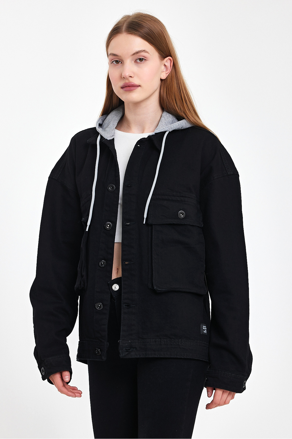 Kadın Bol Cep Oversize Kapşonlu Siyah Kot Ceket Kadın Bol Cep Oversize Kapşonlu Siyah Kot Ceket Ayna-1181DM 2XL